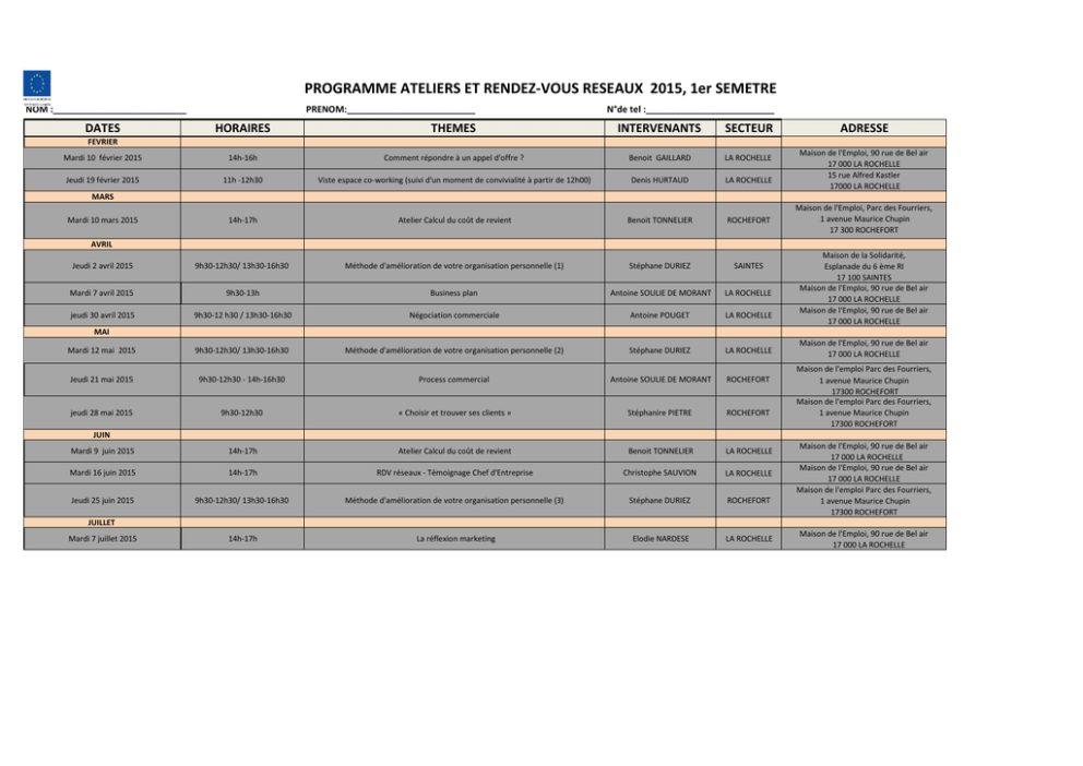 PROGRAMME ATELIERS ET RENDEZ-VOUS RESEAUX 2015, 1er SEMETRE NOM :___________________________ DATES PRENOM:__________________________ N°de tel :__________________________ HORAIRES THEMES INTERVENANTS SECTEUR Mardi 10 février 2015 14h-16h Comment répondre à un appel d'offre ? Benoit GAILLARD LA ROCHELLE Jeudi 19 février 2015 11h -12h30 Viste espace co-working (suivi d'un moment de convivialité à partir de 12h00) Denis HURTAUD LA ROCHELLE 14h-17h Atelier Calcul du coût de revient Benoit TONNELIER ROCHEFORT Jeudi 2 avril 2015 9h30-12h30/ 13h30-16h30 Méthode d'amélioration de votre organisation personnelle (1) Stéphane DURIEZ SAINTES Mardi 7 avril 2015 9h30-13h Business plan Antoine SOULIE DE MORANT LA ROCHELLE jeudi 30 avril 2015 9h30-12 h30 / 13h30-16h30 Négociation commerciale Antoine POUGET LA ROCHELLE Mardi 12 mai 2015 9h30-12h30/ 13h30-16h30 Méthode d'amélioration de votre organisation personnelle (2) Stéphane DURIEZ LA ROCHELLE Jeudi 21 mai 2015 9h30-12h30 - 14h-16h30 Process commercial Antoine SOULIE DE MORANT ROCHEFORT jeudi 28 mai 2015 9h30-12h30 « Choisir et trouver ses clients » Stéphanire PIETRE ROCHEFORT Mardi 9 juin 2015 14h-17h Atelier Calcul du coût de revient Benoit TONNELIER LA ROCHELLE Mardi 16 juin 2015 14h-17h RDV réseaux - Témoignage Chef d'Entreprise Christophe SAUVION LA ROCHELLE Jeudi 25 juin 2015 9h30-12h30/ 13h30-16h30 Méthode d'amélioration de votre organisation personnelle (3) Stéphane DURIEZ ROCHEFORT 14h-17h La réflexion marketing Elodie NARDESE LA ROCHELLE ADRESSE FEVRIER Maison de l'Emploi, 90 rue de Bel air 17 000 LA ROCHELLE 15 rue Alfred Kastler 17000 LA ROCHELLE MARS Mardi 10 mars 2015 Maison de l'Emploi, Parc des Fourriers, 1 avenue Maurice Chupin 17 300 ROCHEFORT AVRIL Maison de la Solidarité, Esplanade du 6 ème RI 17 100 SAINTES Maison de l'Emploi, 90 rue de Bel air 17 000 LA ROCHELLE Maison de l'Emploi, 90 rue de Bel air 17 000 LA ROCHELLE MAI Maison de l'Emploi, 90 rue de Bel air 17 000 LA ROCHELLE Maison de l'emploi Parc des Fourriers, 1 avenue Maurice Chupin 17300 ROCHEFORT Maison de l'emploi Parc des Fourriers, 1 avenue Maurice Chupin 17300 ROCHEFORT JUIN Maison de l'Emploi, 90 rue de Bel air 17 000 LA ROCHELLE Maison de l'Emploi, 90 rue de Bel air 17 000 LA ROCHELLE Maison de l'emploi Parc des Fourriers, 1 avenue Maurice Chupin 17300 ROCHEFORT JUILLET Mardi 7 juillet 2015 Maison de l'Emploi, 90 rue de Bel air 17 000 LA ROCHELLE