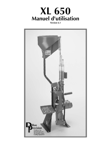XL 650 Manuel d'utilisation Version 6.1 illon recision Products, Inc. Manufacturers of The World's Finest Loading Equipment Figurant à la couverture... Le rechargeur XL 650 avec les accessoires optionnels suivants: Support de fixation (550/650) #22051 Support de fixation (650 seulement) #22052 Poignée de manoeuvre à rouleau en aluminium #17950 Détecteur de poudre #16306 Plateau de balles #22214 Système de vérification de poudre #21044 Distributeur d'étuis éléctrique (quatre tailles disponsibles) D'autres accessoires sont disponibles pour la XL 650, y compris: Vidéo-Manuel d'utilisation #15064 Housse de machine #10443 Jeu d'entretien et jeu de pièces de rechange #97017 Le Blue Press, le catalogue mensuel de Dillon Precision, fournit une liste complète des pièces accessoires qui sont disponibles pour toutes ses machines. Dillon Precision Products, Inc. 8009 E. Dillon's Way Scottsdale, AZ 85260 TEL: 001-480-948-8009 FAX: 001-480-998-2786 Site Web: www.dillonprecision.com Courriel: [email protected] Assistance technique et service à la clientèle 001-480-948-8009 Spot Manuals XL 650 Folder French XL 650 Man 6.1 7/00 WJC Table des Matières Mesures de sécurité obligatoires Pour commencer 1. Déballage de votre machine 2. Montage de votre rechargeur XL 650 3. Assemblage initial de la 650 A. Installation de la poignée de manoeuvre B. Installation du récupérateur d'amorces usagées et de la boîte de collecte des cartouches C. Installation du support du distributeur d'étuis D. Installation du support du tube du distributeur d'étuis E. Installation du distributeur d'étuis optionnel 4. Vue d'ensemble de la tête de presse Graissage des étuis Section pour pistolet - Assemblage de la tête de presse A. Poste un - Pour installer l’outil de mise en forme B. Poste un - Le système de désamorçage C. Poste deux - Installation du distributeur de poudre D. Poste deux - Renseignements sur les tiroirs à poudre E. Poste deux - Réglage de l'outil à poudre et de l'entonnoir à poudre F. Poste deux - Installation de la tige du système de sécurité G. Poste trois - Installation du système de vérification de poudre H. Poste quatre - Renseignements sur le positionnement de la balle I. Poste quatre - Tiges de positionnement pour pistolet J. Poste quatre - Installation et réglage de l'outil de positionnement K. Poste cinq - Installation et réglage de l'outil de sertissage Section pour carabine - Assemblage de la tête de presse A. Poste un - Renseignements sur la jauge d'étui B. Comment utiliser la jauge d'étui C. Poste un - Installation et réglage de l'outil de mise en forme/de désamorçage D. Poste un - Le système de désamorçage E. Poste deux - Installation du distributeur de poudre F. Poste deux - Renseignements sur les tiroirs à poudre G. Poste deux - Réglage de l'outil à poudre et de l'entonnoir à poudre H. Poste deux - Installation de la tige du système de sécurité I. Poste trois - Installation du système de vérification de poudre J. Poste quatre - Comment déterminer la profondeur de positionnement correcte K. Poste quatre - Tiges de positionnement pour carabine L. Poste quatre - Installation et réglage de l'outil de positionnement M. Poste cinq - Installation et réglage de l'outil de sertissage Assemblage final 1. Le tube d'alimentation d'amorces 2. Installation du Système d'alarme anticipée du système d'amorçage 3. Installation des pions de positionnement Chargement des composants 1. Fonctionnement du système de distribution d'amorces 2. Réglage du tiroir à poudre 3. Réglage du Système de vérification de poudre A. Installation et réglage des tiges de vérification de poudre B. Démonstration du système de vérification de poudre 4. Chargement du système d'amorçage Maintenant il est temps de commencer à charger La Conversion des calibres Incidents de fonctionnement Tableaux de conversion des calibres Schémas Page # 5 6 6 7 7 7 8 8 8 9 11 11 12 12 12 12 13 14 15 16 17 18 18 18 20 20 20 21 22 22 23 23 24 25 26 27 27 28 28 28 29 29 29 29 30 31 31 32 32 34 36 - 43 44 - 46 47 - 49 50 - 59 MESURES DE SÉCURITÉ OBLIGATOIRES Le rechargement des munitions et la manipulation des produits (amorces et poudres) sont, par définition, dangereux; en fait, le tir des armes à feu est en lui-même également dangereux. Des accidents se produisent parfois, et les résultats peuvent être catastrophiques. Ces accidents se produisent indifféremment, aussi bien chez l’utilisateur chevronné que chez le débutant. Dillon Precision Products a sciemment conçu toutes ses machines de rechargement en pensant à ces problèmes de sécurité. Dillon protège le tube à amorces et prévoie des trous d’évacuation pour l’élimination des résidus de poudre et d’amorce. En un mot, Dillon a prévu tout ce qui était possible pour rendre l’utilisation de ses machines aussi inoffensive que possible. Dillon ne peut, cependant, garantir complètement votre sécurité. Pour minimiser les risques de blessures corporelles, utilisez votre bon sens quand vous rechargez et respectez ces règles de base: N’utilisez pas de poudre noire, ni de succédanés de poudre noire, dans aucun récipient de mesure de poudre Dillon. Le chargement de cartouches de poudre noire exige de l’équipement spécial et des techniques spécializées de chargement. L’emploi de poudre noire ou de succédanés de poudre noire dans n’importe quel récipient de mesure de poudre Dillon peut aboutir à de blessures sévères ou à la mort. • FUMER Ne fumez jamais et ne laissez jamais quelqu’un fumer dans votre environnement de rechargement. • AMORCES: Ne forcez jamais les amorces si elles se coincent durant la mise en oeuvre du rechargeur. Démontez la machine et enlevez délicatement l’obstruction. Si les amorces venaient à se coincer dans le tube de collecte d’amorces ou dans le tube d’alimentation d’amorces, n’utilisez jamais de tige ou d’autre instrument pour les extrai