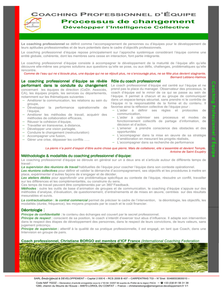 COACHING PROFESSIONNEL D’ÉQUIPE Processus de changement Développer l’Intelligence Collective Le coaching professionnel se définit comme l’accompagnement de personnes ou d’équipes pour le développement de leurs aptitudes professionnelles et de leurs potentiels dans le cadre d’objectifs professionnels. Le coaching professionnel d’équipe repose principalement sur l’approche systémique considérant l’équipe comme une entité globale, cohérente, dont les membres sans cesse en interaction, font partie intégrante. Le coaching professionnel d’équipe consiste à accompagner le développement de la maturité de l’équipe afin qu’elle découvre elle-même ses propres solutions aux questions qu’elle se pose, ou aux défis, challenges, problématiques qu’elle rencontre. Comme de l’eau qui ne s’écoule plus, une équipe qui ne se réjouit plus, ne s’encourage plus, ne se fête plus devient stagnante. Bernard Leblanc-Halmos concernant les équipes de direction (CoDir, Associés, CA), les équipes projets, les services ou départements, notamment sur les thématiques suivantes : Améliorer la communication, les relations au sein du groupe, Développer la performance opérationnelle de l’équipe, Améliorer les méthodes de travail, acquérir des méthodes de collaboration efficaces, Réussir la cohésion d’équipe, Travailler en transverse, à distance, Développer une vision partagée, Conduire le changement (restructuration) Accompagner une fusion, Gérer une crise, dépasser les conflits ….. prend pas la place du manager. Observateur des processus, le coach d’équipe est le miroir de ce qui se passe au sein de l’équipe. Il permet à chacun et au groupe de communiquer dans un espace-temps sécurisé, sans prendre ni le contrôle de l’équipe ni la responsabilité de la forme et du contenu. Il favorise ainsi la réflexion collective de l’équipe pour : L’aider à définir ses règles et protocoles de communication, L’aider à optimiser ses processus et modes de fonctionnement collectifs de partage d’information, de décision et d’action, L’amener à prendre conscience des obstacles et des opportunités L’accompagner dans la mise en œuvre de sa stratégie d’amélioration en mesurant les progrès réalisés, L’accompagner dans sa recherche de performance La pierre n’a point d’espoir d’être autre chose que pierre. Mais de collaborer, elle s’assemble et devient Temple. Antoine de Saint Exupéry Méthodologie & modalités du coaching professionnel d’équipe: d’équipe: Le coaching professionnel d’équipe se déroule en général sur un à deux ans et s’articule autour de différents temps de travail : La supervision des réunions de travail habituelles de l’équipe pour coacher l’équipe dans son contexte opérationnel. Les réunions collectives pour définir et valider la démarche d’accompagnement, ses objectifs et les procédures à mettre en place, expérimenter d’autres façons de s’engager et de décider, Les ateliers dédiés pour approfondir une problématique spécifique au contexte de l’équipe, résoudre un conflit, travailler sur les différences et les complémentarités, ou construire du sens. Ces temps de travail peuvent être complémentés par un 360° Feedback. Méthodes : outre les outils de base d’animation de groupes et de communication, le coaching d’équipe s’appuie sur des méthodes d’analyse, d’évaluation, de questionnement, d’entraînements et de mises en œuvre, centrées sur des résultats mesurables et suivis. La contractualisation : le contrat commercial permet de préciser le cadre de l’intervention, la déontologie, les objectifs, les modalités (durée, fréquence), les moyens proposés par le coach et le coût financier. Déontologie : Principe de confidentialité : le contenu des échanges est couvert par le secret professionnel. Principe de respect : conscient de sa position, le coach s’interdit d’exercer tout abus d’influence. Il adapte son intervention dans le respect des étapes de développement des personnes, dans le respect de leurs convictions, de leurs valeurs, sans jugement préconçu. Principe de supervision : attentif à la qualité de sa pratique professionnelle, il est engagé, en tant que Coach, dans une Intervision en groupe de pairs. Coach professionnel, Christiane BORGO est membre d’ICF France (International Coaching Federation SARL émergence & DEVELOPPEMENT – Capital 2 000 € – RCS 2008 B 407 – CARPENTRAS TGI – N° Siret 50468553800010 – Code NAF 7022Z – Déclaration d’activité enregistrée sous le n° 93 84 03057 84 auprès du Préfet de la région PACA – +33 (0)6 81 56 31 38 1280, chemin du Mourre de l’Eouze – 84870 LORIOL DU COMTAT – France – [email protected] 1/1 Coaching Professionnel d’Équipe Le coaching professionnel d’équipe se révèle Rôle du coach professionnel performant dans la conduite du changement Le coach professionnel d’équipe est centré sur l’équipe et ne