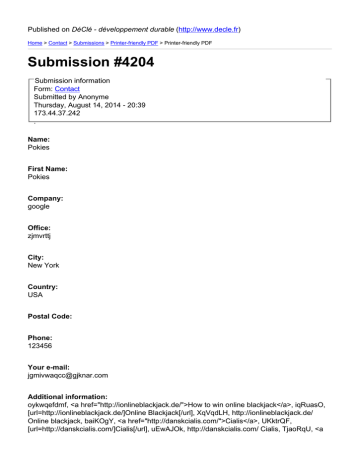 Published on DéClé - développement durable (http://www.decle.fr) Home > Contact > Submissions > Printer-friendly PDF > Printer-friendly PDF Submission #4204 Submission information Form: Contact Submitted by Anonyme Thursday, August 14, 2014 - 20:39 173.44.37.242 . Name: Pokies First Name: Pokies Company: google Office: zjmvrttj City: New York Country: USA Postal Code: Phone: 123456 Your e-mail: [email protected] Additional information: oykwqefdmf, <a href="http://ionlineblackjack.de/">How to win online blackjack</a>, iqRuasO, [url=http://ionlineblackjack.de/]Online Blackjack[/url], XqVqdLH, http://ionlineblackjack.de/ Online blackjack, baiKOgY, <a href="http://danskcialis.com/">Cialis</a>, UKktrQF, [url=http://danskcialis.com/]Cialis[/url], uEwAJOk, http://danskcialis.com/ Cialis, TjaoRqU, <a href="http://garnett-shiffer.com/">Casino online</a>, pbiyXeL, [url=http://garnettshiffer.com/]Casino online slot games[/url], YXhWZiZ, http://garnett-shiffer.com/ Casino Online, WaTpVKo, <a href="http://genf20guide.com/">Genf20 plus side effects</a>, uKOKKqw, [url=http://genf20guide.com/]Side effects of genf20 plus[/url], gdYjOJa, http://genf20guide.com/ Genf20 plus scam, vSvCqlS, <a href="http://damnthefilm.com/">Pokies</a>, iJDNnts, [url=http://damnthefilm.com/]Pokies[/url], MusYHli, http://damnthefilm.com/ Pokies, OLpNQKP, <a href="http://freewebstarts.com/">Webstart support</a>, GzBXwYo, [url=http://freewebstarts.com/]Webstart server[/url], DkihZZj, http://freewebstarts.com/ Webstarts, AVFRIHG. Source URL: http://www.decle.fr/?q=en/node/50/submission/4204