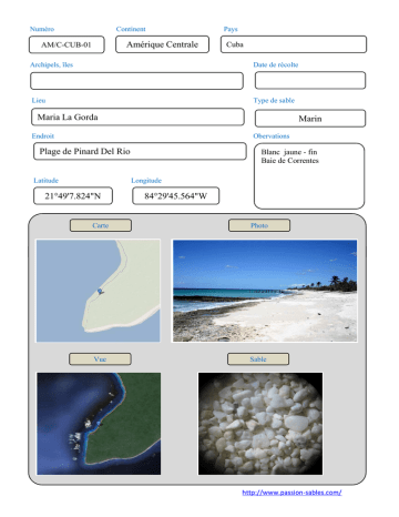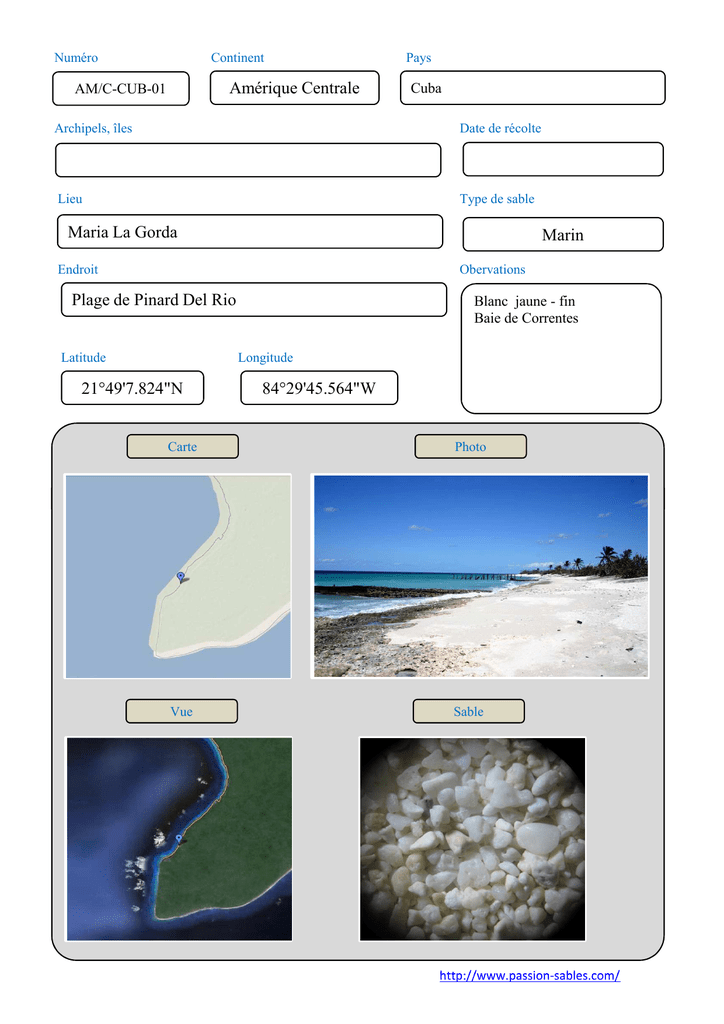 Numéro Continent Amérique Centrale AM/C-CUB-01 Pays Cuba Archipels, îles Date de récolte Lieu Type de sable Maria La Gorda Marin Endroit Obervations Plage de Pinard Del Rio Latitude Blanc jaune - fin Baie de Correntes Longitude 21°49'7.824"N 84°29'45.564"W Carte Photo Vue Sable http://www.passion-sables.com/