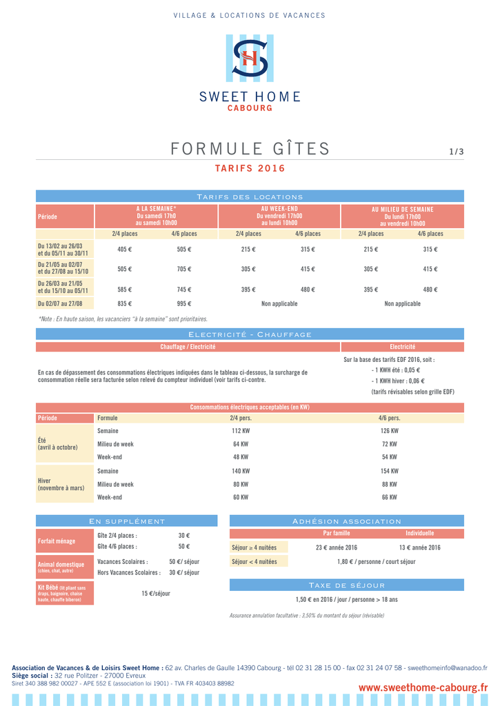 V I L L A G E & L O C AT I O N S D E VA C A N C E S FORMULE GÎTES 1/3 TA R I F S 2 0 1 6 Tarifs des locations A LA SEMAINE* Du samedi 17h0 au samedi 10h00 Période AU WEEK-END Du vendredi 17h00 au lundi 10h00 AU MILIEU DE SEMAINE Du lundi 17h00 au vendredi 10h00 2/4 places 4/6 places 2/4 places 4/6 places 2/4 places 4/6 places Du 13/02 au 26/03 et du 05/11 au 30/11 405 € 505 € 215 € 315 € 215 € 315 € Du 21/05 au 02/07 et du 27/08 au 15/10 505 € 705 € 305 € 415 € 305 € 415 € Du 26/03 au 21/05 et du 15/10 au 05/11 585 € 745 € 395 € 480 € 395 € 480 € Du 02/07 au 27/08 835 € 995 € Non applicable Non applicable *Note : En haute saison, les vacanciers “à la semaine” sont prioritaires. Electricité - Chauffage Chauffage / Electricité Electricité Sur la base des tarifs EDF 2016, soit : - 1 KWH été : 0,05 € En cas de dépassement des consommations électriques indiquées dans le tableau ci-dessous, la surcharge de consommation réelle sera facturée selon relevé du compteur individuel (voir tarifs ci-contre. - 1 KWH hiver : 0,06 € (tarifs révisables selon grille EDF) Consommations électriques acceptables (en KW) Période Été (avril à octobre) Hiver (novembre à mars) Formule 2/4 pers. 4/6 pers. Semaine 112 KW 126 KW Milieu de week 64 KW 72 KW Week-end 48 KW 54 KW Semaine 140 KW 154 KW Milieu de week 80 KW 88 KW Week-end 60 KW 66 KW Adhésion association En supplément Forfait ménage Animal domestique (chien, chat, autre) Kit Bébé (lit pliant sans draps, baignoire, chaise haute, chauffe biberon) Gîte 2/4 places : 30 € Gîte 4/6 places : 50 € Séjour ≥ 4 nuitées Vacances Scolaires : 50 €/ séjour Séjour < 4 nuitées Hors Vacances Scolaires : 30 €/ séjour Par famille Individuelle 23 € année 2016 13 € année 2016 1,80 € / personne / court séjour Taxe de séjour 15 €/séjour 1,50 € en 2016 / jour / personne > 18 ans Assurance annulation facultative : 3,50% du montant du séjour (révisable) Association de Vacances & de Loisirs Sweet Home : 62 av. Charles de Gaulle 14390 Cabourg - tél 02 31 28 15 00 - fax 02 31 24 07 58 - [email protected] Siège social : 32 rue Politzer - 27000 Evreux Siret 340 388 982 00027 - APE 552 E (association loi 1901) - TVA FR 403403 88982 www.sweethome-cabourg.fr V I L L A G E & L O C AT I O N S D E VA C A N C E S FORMULE GÎTES 2/3 CONDITIONS DE SÉJOUR Conditions générales de vente en Formule Gîtes A Cabourg, Sweet Home vous accueille dans une belle résidence de style anglo-normand de 8 hectares de verdure en bord de mer. Le village de 24 gîtes est composé de : • Le Bocage : 4 gîtes de 4-6 personnes (dont 1 gîte handicapé) et 2 gîtes de 2-4 places. • La Suisse Normande : 4 gîtes de 4-6 personnes (dont 1 gîte handicapé) et 2 gîtes de 2-4 personnes (dont 1 gîte handicapé). • Le Pays d'Auge : 4 gîtes de 4-6 personnes (dont 1 gîte handicapé) et 2 gîtes de 2-4 personnes (dont 1 gîte handicapé). • La Côte Fleurie : 4 gîtes de 4-6 personnes (dont 1 gîte handicapé) et 2 gîtes de 2-4 personnes (dont 1 gîte handicapé). TAXE DE SÉJOUR Selon les textes en vigueur, pour tout séjour effectué, une taxe de séjour doit être acquittée à la commune. Elle sera mentionnée sur la facture et tiendra compte de la durée du séjour (en 2016, la taxe est de 1,50 € par jour et pour toute personne de plus de 18 ans). Gîte de 2-4 personnes (40 m2) SÉJOUR CHAMBRE VOTRE SÉJOUR KITCHENETTE En juillet et août les séjours se déroulent du samedi au samedi. Pour les autres périodes de l'année, les locations débutent : SDB - soit du lundi au vendredi (mid week), - soit du vendredi au lundi (week-end), - soit du samedi au samedi (semaine). Le jour de votre arrivée, le gîte est disponible à partir de 17h00 (pour une arrivée au-delà de 19h30-21h00 le vendredi et le samedi, nous consulter) et doit être libéré pour 10h00, le jour de votre départ. La location comprend : - Un gîte 2-4 places ou 4-6 personnes entièrement aménagé (avec cuisine complète). - L'animation : activité en journée et animation en soirée (pendant les vacances scolaires), avec accès aux équipements de loisirs et sportifs du centre Sweet Home. - Linge (draps, serviettes, torchons et tapis de bains) - Forfait électricité : voir Tarifs 2016 - p.1. ADHÉSION Les séjours au Village Vacances de Sweet Home sont ouverts à tous, sous réserve du réglement de la cotisation annuelle à l'Association (en aucun cas l'adhésion ne peut être remboursée, voir Tarifs 2016 - p.1). • Montant : 1,80 € par personne pour un séjour de moins de 4 jours en formule “Gîtes”, et 23 € par famille pour un séjour de 4 jours et plus en formule “Gîtes”. ENTRÉE WC Gîte de 4-6 personnes (58 m2) CHAMBRE Gîte de 2-4 personnes (voir ci-dessus) + étage (ci-contre) SDB WC MODALITÉS DE PAIEMENT Après avoir reçu votre demande (formulaire ci-contre, dont nous vous conseillons de garder une copie), accompagnée de l'acompte de 30% du montant total du séjour, votre réservation devient définitive dès lors qu'un accord de séjour vous sera envoyé. Un mois avant votre arrivée, vous devez nous envoyer un second acompte de 30% du montant total du séjour. Le solde est à régler le jour de votre arrivée, en même temps que le dépôt d'un chèque de caution pour les gîtes. Les réglements sont à libeller à l'ordre de Sweet Home. Les bons vacances, les chèques ANCV sont acceptés. Les chèques étrangers sont acceptés mais les frais d'encaissement seront facturés au client. Association de Vacances & de Loisirs Sweet Home : 62 av. Charles de Gaulle 14390 Cabourg - tél 02 31 28 15 00 - fax 02 31 24 07 58 - [email protected] Siège social : 32 rue Politzer - 27000 Evreux Siret 340 388 982 00027 - APE 552 E (association loi 1901) - TVA FR 403403 88982 www.sweethome-cabourg.fr V I L L A G E & L O C AT I O N S D E VA C A N C E S FORMULE GÎTES 3/3 CONDITIONS DE SÉJOUR Conditions générales de