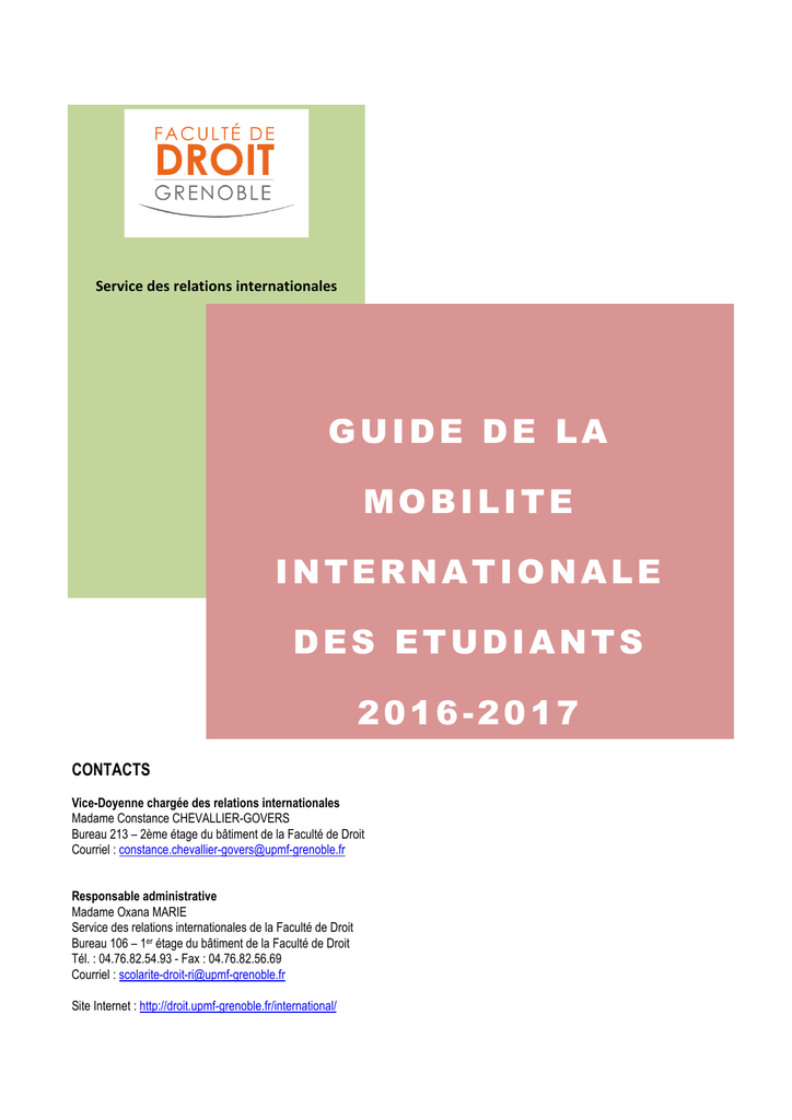 Service des relations internationales GUIDE DE LA MOBILITE INTERNATIONALE DES ETUDIANTS 2016-2017 CONTACTS Vice-Doyenne chargée des relations internationales Madame Constance CHEVALLIER-GOVERS Bureau 213 – 2ème étage du bâtiment de la Faculté de Droit Courriel : [email protected] Responsable administrative Madame Oxana MARIE Service des relations internationales de la Faculté de Droit Bureau 106 – 1er étage du bâtiment de la Faculté de Droit Tél. : 04.76.82.54.93 - Fax : 04.76.82.56.69 Courriel : [email protected] Site Internet : http://droit.upmf-grenoble.fr/international/ PRINCIPES DE LA MOBILITÉ INTERNATIONALE ÉTUDIANTE - Mobilité possible uniquement en première année de Master Sélection des étudiants Mobilité en principe d’une année universitaire, exceptionnellement d’un semestre Inscription et règlement des droits d’inscription à l’université Pierre Mendès France avant le départ Exonération des droits d’inscription à l’université d’accueil Conclusion d’un contrat d’études qui prévoit la liste des enseignements qui devront être suivis dans l’université d’accueil Validation par la Faculté de Droit des résultats obtenus à l’étranger, sous réserve de notes suffisantes. Délivrance du diplôme par l’État français, pas de diplôme délivré par l’université d’accueil Obtention d’une bourse par une majorité d’étudiants. IMPORTANT Lire attentivement ce document. Consulter régulièrement le panneau d’affichage à côté du bureau des relations internationales de la Faculté de Droit (106). Remettre au service relations internationales de la Faculté de Droit, au plus tard, le vendredi 4 décembre 2015 16h00, les pièces suivantes : - Le dossier de candidature dûment rempli (à télécharger dans la rubrique « International » – « Partir étudier à l’étranger » : http://droit.upmf-grenoble.fr/international/partir-etudier-a-l-etranger/ - Copie des relevés de notes de votre cursus universitaire - Une lettre de motivation en français et dans la langue du (ou des) pays demandé (s). Pour les langues rares, la lettre de motivation doit être en anglais. - Une photo d’identité (à coller sur le dossier) Les étudiants qui souhaitent partir dans le cadre d’un programme géré directement par le service des relations internationales de l’université doivent, en plus, respecter les consignes données lors des réunions d’information sur ces programmes. Pour que leurs demandes soient recevables, les étudiants doivent fournir, dans les délais, toutes les pièces constitutives des dossiers. Les dossiers incomplets ou présentés tardivement ne seront pas examinés. SOMMAIRE 1- Formalités universitaires 2- Liste des destinations proposées 3- Démarches administratives 4- Aides financières 5- Budget prévisionnel 6- Contrat d’études 7- Contrôle des connaissances 8- Rôle du Service des relations internationales de la Faculté de droit 1 - FORMALITÉS UNIVERSITAIRES LES TESTS DE LANGUES Les étudiants doivent passer un test, interne à la Faculté de Droit, dans la langue du pays dans lequel ils souhaiteraient effectuer une période de mobilité. Ce test sera organisé entre les mois de février et mars précédant le départ. Les étudiants de « licence Droit-Langues » sont dispensés de ce test s’ils demandent à partir dans un pays où est parlée leur langue A ou leur langue B. En outre, les étudiants désireux d’effectuer leur mobilité dans une université américaine doivent impérativement avoir passé le TOEFL (Test Of English as a Foreign Language). En dehors des États-Unis, certaines universités noneuropéennes demandent également le passage de cette certification (universités japonaises, université d’Ottawa en cas de choix des cours en anglais, etc.). Les pré-requis peuvent être plus ou moins élevés selon l’université dans laquelle souhaite aller l’étudiant. Les résultats du TOEFL doivent pouvoir être communiqués au service des relations internationales de la Faculté de Droit au plus tard le 5 janvier 2016. - Préparation : Une préparation au TOEFL est assurée par le CLV (Centre des langues vivantes) de l’Université Pierre Mendès France. Le coût est d’environ 100 €. - Épreuve : Le passage du TOEFL peut avoir lieu au CLV. La présentation d’une carte bancaire internationale, au nom du candidat est indispensable pour pouvoir passer l’épreuve. - Démarches : Il est d’abord nécessaire d’obtenir un numéro d’inscription auprès du service RI de la faculté de droit, puis de s’adresser au CLV. - Coût indicatif : 220 - 240 $ - Recevabilité : le nombre de points requis varie selon les universités. LA SÉLECTION Il existe deux types de destinations : certaines sont proposées par l’université à tous les étudiants de l’UPMF, d’autres par la Faculté de Droit aux seuls étudiants juristes. Les étudiants ne peuvent pas candidater à la fois sur des destinations proposées par l’UPMF, et sur des destinations proposées par la Faculté de Droit. Ils doivent faire un choix entre ces deux catégories de destinations. Destinations proposées à tous les étudiants de l'UPMF. La procédure de sélection est gérée par le service central des relations internationales de l’UPMF, et non par la Faculté de droit. Les étudiants présentés par la Faculté de Droit sont soumis à une sélection par une commission composée de responsables des relations internationales appartenant à toutes les composantes de l’université Pierre Mendès France. Certaines universités exigent un niveau académique minimum. Par exemple, l’université Mc Gill (Canada) impose une moyenne d’au moins 14/20 depuis la première année de licence. La sélection intervient en principe entre janvier. Mais certains programmes prévoient une sélection parmi les étudiants proposés par leur université d’origine (programme CREPUQ, par exemple). Les résultat