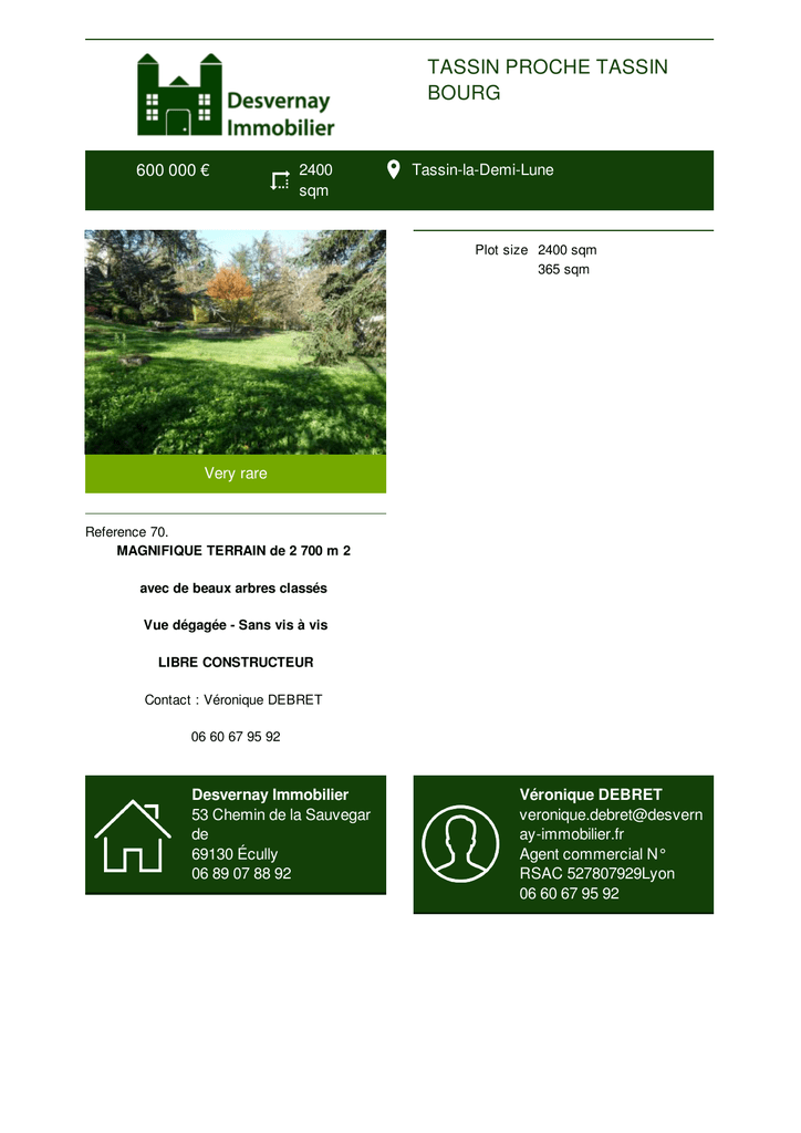 TASSIN PROCHE TASSIN BOURG 600 000 € 2400 sqm Tassin-la-Demi-Lune Plot size 2400 sqm 365 sqm Very rare Reference 70. MAGNIFIQUE TERRAIN de 2 700 m 2 avec de beaux arbres classés Vue dégagée - Sans vis à vis LIBRE CONSTRUCTEUR Contact : Véronique DEBRET 06 60 67 95 92 Desvernay Immobilier 53 Chemin de la Sauvegar de 69130 Écully 06 89 07 88 92 Véronique DEBRET veronique.debret@desvern ay-immobilier.fr Agent commercial N° RSAC 527807929Lyon 06 60 67 95 92 Document non contractuel