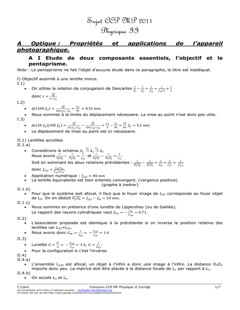 Sujet CCP MP 2011 Physique II A Optique : Propriétés photographique. et applications de l’appareil A I Etude de deux composants essentiels, l’objectif et le pentaprisme. Note : Le pentaprisme ne fait l’objet d’aucune étude dans ce paragraphe, le titre est inadéquat. I) Objectif assimilé à une lentille mince. I.1) On utilise la relation de conjugaison de Descartes donc I.2) I.3) Δ 100 0.51 Nous sommes à la limite du déplacement nécessaire. La mise au point n’est donc pas utile. Δ 10 ||100 Le déplacement de mise au point est ici nécessaire. 5.1 II.1) Lentilles accolées II.1.a) Considérons le schéma Nous avons → → et . Soit en sommant les deux relations précédentes : donc . Application numérique : 84 La lentille équivalente est bien entendu convergent. (vergence positive) (graphe à insérer) II.1.b) Pour que le système soit afocal, il faut que le foyer image de L23 corresponde au foyer objet 24 . de L4. On en déduit II.1.c) Nous sommes en présence d’une lunette de Lippershey (ou de Galilée). 0.71. Le rapport des rayons cylindriques vaut II.2) L’association proposée est identique à la précédente si on inverse la position relative des lentilles car L23=L34. 1.4 Nous avons donc II.3) Lunette 1.4, . Pour la configuration b c’est l’inverse. II.4) II.4.a) L’ensemble L234 est afocal, un objet à l’infini a donc une image à l’infini. La distance O4O1 importe donc peu. La matrice doit être placée à la distance focale de L1 par rapport à L1. II.4.b) On accole L4 et L1. C.Caire Concours CCP MP Physique II Corrigé Les remarques sont à faire à l’adresse suivante : [email protected] Ce fichier est issu du site http://sites.google.com/site/concourscpgecorrections/home 1/7 II.4.c) Probable erreur d’énoncé. Le rayon limitant l’objet à l’infini arrive sur L1 avec l’angle . La taille de l’image est obtenue tan 4.4 . simplement par Ce résultat ne dépend nullement de Gaa ou de Gab. Forme probable de l’énoncé, l’angle est l’angle d’incidence sur L2 et non sur L1. 6.1 Nous avons alors dans la configuration a : 3.1 Dans la configuration b II.4.d) Distance focale équivalente :Un objet vu de l’infini sous l’angle donne une image d’une . Si nous disposons d’une seule lentille convergente nous avons où fi taille est la distance focale de la lentille. 6.1 donc : 62.5 Config a : : 3.1 donc : 40 Config b : : II.4.e) Champ angulaire Nous avons 2 2 . AN : Pour une pellicule classique nous avons 43.3 Soit 2 0.8 47° pour fil=50 mm Soit 2 0.67 38° pour fia=62.5 mm Soit 2 1 56° pour fib=40 mm Ces valeurs sont largement supérieures à celles tolérées par les conditions dites de Gauss. II.5) Un objectif bifocal est un compromis entre une mono-lentille et un zoom. Plus compliqué que le premier, il reste beaucoup plus simple et moins cher que le second. III Objectifs dédiés spécifiquement à la macrophotographie III.1) Nous avons Vérifions le avec 56 si le tirage est correct. 60 et Le tirage n’est pas correct, pour que l’image soit nette il faudrait que le capteur soit associé à un tirage de 10mm et non de 6mm. III.2) Nous supposons que le tirage est correct et se confond avec l’image finale de l’objet. 466.7 L’antécédent à travers L1 vérifie Nous calculons de même l’antécédent à travers L5 III.3) AN : AN : III.4) L’ajout ainsi le 5 5 et et 20 50 , nous avons , nous avons 135 227 d’une lentille additionnelle permet de rapprocher l’appareil de l’objet et d’améliorer grossissement. A II Quelques paramètres importants d’un appareil photo I) Profondeur de champ/résolution I.1) Utilisons la proportionnalité des triangles semblables (Thalès). Nous avons | De même | C.Caire | | La différence nous donne la profondeur de champ : Δ Concours CCP MP Physique II Corrigé Les remarques sont à faire à l’adresse suivante : [email protected] Ce fichier est issu du site http://sites.google.com/site/concourscpgecorrections/home | | . 2/7 I.2) Influence de la diffraction I.2.a) Cours : où est la fréquence spatiale Soit . . La tache centrale de diffraction a pour largeur I.2.b) Confusion de l’énoncé. Il est fait référence à l’ouverture numérique noté N.O. sans aucune définition de cette grandeur que les étudiants n’ont pas à connaître. En fait, on note N.O. en photographie, la grandeur sans dimension appelé nombre d’ouverture et définie par f/D. Vu les valeurs fournies (1.4 et 2.8) qui sont des nombres d’ouverture classiques, c’est le nombre d’ouverture et non l’ouverture numérique qu’il faut exploiter ici. . . D’après l’énoncé Δ AN : Pour 1.4,2.8 , on obtient Δ 0.77 , 1.5 Sauf erreur de lecture le grain n’est pas donné dans l’énoncé, difficile donc de comparer… II) Eclairement du plan image Note : l’énoncé fait un usage explicite de l’angle solide sans le définir. Ces notions sont désormais hors programme et auraient dû être définies. II.1) , . sin , donc cos Ω 2 cos sin θ Nous avons Ω ∬ , θ sin 1 cos 2 . Les angles sont supposés être petits : cos 2 donc II.2) 1 2 On utilise ensuite les relations fournies par l’énoncé, on remarquera que ces dernières furent certes aux programmes de CPGE avant la réforme de 95, mais qu’elles sont aujourd’hui hors du champ « contextuel » d’un élève de MP. sin sin , car et hypothèses de Sinus d’Abbe (stigmatisme) Gauss sur de petits angles. Par ailleurs 2 . . sin 2 . . . Nous déduisons . . Enfin C.Caire . . (C.Q.F.D.) Un enregistrement nécessite une exposition lumineuse minimale, cette exposition évoluant comme T/(NO)2, le temps de pose évolue donc comme le carré du nombre d’ouverture. Sur une prise rapide, il faut donc un petit nombre d’ouverture mais la profondeur de champ est alors très réduite et nécessite un ciblage photo précis. Sur une prise lente, il faut un grand nombre d’ouverture, la profondeur de champ est alors importante, pas de ciblage nécessair