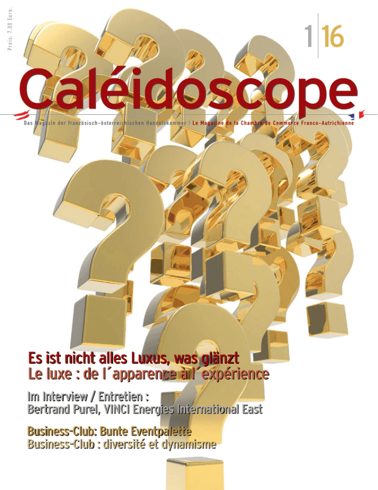Preis: 7,00 Euro. 1 16 Caléidoscope Das Magazin der französisch-österreichischen Handelskammer I Le Magazine de la Chambre de Commerce Franco-Autrichienne Es ist nicht alles Luxus, was glänzt Le luxe : de l´apparence à l´expérience Im Interview / Entretien : Bertrand Purel, VINCI Energies International East Business-Club: Bunte Eventpalette Business-Club : diversité et dynamisme caléidoscope 1 © LAKWENA MACIVER - WYNWOOD BUILDING - JUNIOR & HATTER G R A B EN 14-15 - WIE N 1 16 Das Caleidoscope wurde mit Unterstützung von Print & Mailsolutions (www.print-mailsolutions.at) produziert. Le Caléidoscope a été imprimé par Print & Mailsolutions (www.print-mailsolutions.at). Editorial I Éditorial Inhalt Chers amis de la CCFA! Liebe Freunde der CCFA! ie Oscar Wilde einst zu sagen pflegte: „Die einzige Möglichkeit sich einer Versuchung zu entziehen ist ihr nachzugeben.” Seit einigen Jahren scheint die Luxusindustrie ihre Entwicklung auf folgendes Postulat aufzubauen: Ich wünsche mir den Luxus, den sich nur wenige Glückliche erlauben können. Durch Massenproduktionen wurde Luxus nun auch der breiten Masse zugänglich, oder zumindest die Illusion sich diesen Luxus auch tatsächlich zugegen machen zu können. Luxus ist auch „das aktuellste Modell” zu besitzen: das allgegenwärtige und manchmal selbst gesteuerte Veralten ist jener Mechanismus durch den ein Produkt erst zum altmodischen Auslaufmodell wird, obgleich es noch voll funktionsfähig wäre. Der Modeeffekt spielt für den Verbraucher eine tragende Rolle, allerdings scheinen Werbung und Social Media den Hauptgrund für diese Tendenz darzustellen. Doch die verschwenderischen Kaufgewohnheiten scheinen gebändigt worden zu sein und allmählich bahnen sich altbewährte Werte ihren Weg zurück: Natur, Zeit, Bildung und Qualität werden zum wahrhaften Luxus, von dem unsere Gesellschaft zehrt. Genau an diesem Platz findet sich der französische Luxus ein: Er vereint hunderttausende Handwerker, die einzigartige, wert- und kunstvolle Objekte anfertigen. Sommaire W scar Wilde disait : « le seul moyen de se délivrer d‘une tentation, c‘est d‘y céder. » Il semble que pendant de nombreuses années, l’industrie du luxe ait basé son modèle de développement sur ce postulat : le luxe est ce à quoi j’aspire mais que seuls quelques heureux peuvent se permettre. Néanmoins, à la faveur des productions O www.ccfa.at 4 Panorama I Panorama Marionnaud Bongrain 6 Extra I Extra Petsch Frosch Klein Arturo Rechtsanwälte Arval 8 CCFA-Analyse I Analyse de la CCFA Es ist nicht alles Luxus, was glänzt 10 Fokus I Zoom de masse, le luxe, ou tout au plus l´illusion de pouvoir se l´offrir, est à portée de main. Le luxe, c’est aussi « avoir le dernier modèle de » : l‘obsolescence perçue et parfois même programmée est le mécanisme par lequel un produit devient dépassé bien avant la perte effective de sa fonction. Les effets de mode sont entretenus dans une certaine mesure par les consommateurs eux-mêmes, mais à plus forte raison par la publicité et les médias sociaux. Pourtant les gargantuas consuméristes ont la nausée et lentement les valeurs des Lumières resurgissent : la nature, le temps, l’éducation, la qualité deviennent bel et bien le vrai luxe auquel notre société moderne aspire. C’est là que le luxe français a toute sa place : il est incarné par le savoir-faire unique et centenaire de milliers d’artisans qui participent à la création d’objets rares, pleins de sens et de valeur. Céline Garaudy, Direktorin I Directrice Moët Hennessy Augarten Artcurial DS Automobiles 14 Kurzportrait I Portrait Global Site Position Sofitel Vienna Stephansdom sanofi-aventis 17 Interview I Entretien Bertrand Purel, VINCI Energies International East 19 Business-Club I Business-Club 23Neue Mitglieder I Nouveaux membres VORSTAND: Alain de Krassny, Präsident, Donau Chemie / Herbert Schimetschek, Erster Vize-Präsident / Manfred Kunze, Zweiter Vize-Präsident / Johann Bartal, Schatzmeister / Christian Dorda, Rechtsanwalt, Dorda, Brugger & Jordis / Céline Garaudy, Direktorin / Christian Berger, Coface, Niederlassung Austria / Klaus Fassbender, L´Oréal Österreich / Igor Glaser, Schneider Electric Austria Ges.m.b.H. / Georg Frisch / Guido Hackl, Air France – KLM / Erich Hampel, UniCredit Bank Austria AG / Norbert Herzog, Vinci Energies Österreich / Uwe Hochgeschurtz, Renault Österreich / Ernst Huber, WK Österreich / Peter Lennkh, Raiffeisen Bank International AG / Johann Marihart, Agrana Beteiligungs AG / Alexander Moj, Sofitel Vienna Stephansdom / Boyan Neytchev, Fromageries Bel Österreich - Zweigniederlassung der Bel Deutschland GmbH / Robert Denis Del Picchia, Sénat de France / Sabine Radl, sanofi-aventis Österreich / Franck Runge, Servithink Unternehmensberatung GmbH / Emil Steiner, Société Générale Zweigniederlassung Wien / Alfred Veider, Thales Austria GmbH / Daniela Vorbeck, Raiffeisen Bank International AG / Friedrich Wille, Frey Wille GmbH & Co KG. IMPRESSUM: Medieninhaber, Herausgeber, Redaktion: Französisch-Österreichische Handelskammer, Geschäftsführung: Céline Garaudy, A-1030 Wien, Am Heumarkt 10, Tel. +43 (1) 711 47 380, Fax. +43 (1) 713 39 81, E-Mail: [email protected], ZVR-Nummer: 703510399, Unternehmensgegenstand (Vereinszweck): Förderung der wirtschaftlichen Beziehungen zwischen Österreich und Frankreich. Für den Inhalt dieser Publikation und eventuelle Druckfehler übernimmt der Herausgeber keinerlei Verantwortung. Unter Angabe der Quelle ist die Vervielfältigung von Artikeln gestattet. www.ccfa.at. Graphisches Konzept: franke&hagen, Textbeiträge: Céline Garaudy, Julia Pober, Mathilde Aureau. Abonnement für ein Jahr (4 Ausgaben): 20,00 Euro. Abonnement pour un an (4 parutions): 20,00 Euro. > panorama I panorama Panorama Jede Eule hilft! Un projet très chouette ! Seit 2002 unterstützt Marionnaud das SOS-Kinderdorf. Durch den Verkauf von Charity Kuscheltieren konnte b