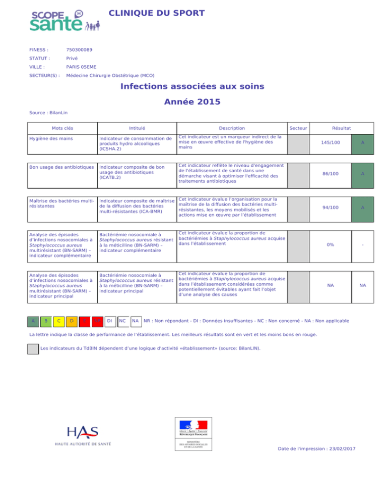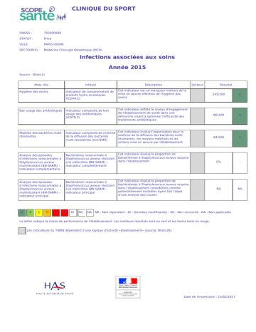 CLINIQUE DU SPORT FINESS : 750300089 STATUT : Privé VILLE : PARIS 05EME SECTEUR(S) : Médecine Chirurgie Obstétrique (MCO) Infections associées aux soins Année 2015 Source : BilanLin Mots clés Intitulé Description Secteur Hygiène des mains Indicateur de consommation de produits hydro alcooliques (ICSHA.2) Cet indicateur est un marqueur indirect de la mise en œuvre effective de l'hygiène des mains Bon usage des antibiotiques Indicateur composite de bon usage des antibiotiques (ICATB.2) Cet indicateur reflète le niveau d'engagement de l'établissement de santé dans une démarche visant à optimiser l'efficacité des traitements antibiotiques Maîtrise des bactéries multirésistantes Indicateur composite de maîtrise Cet indicateur évalue l’organisation pour la maîtrise de la diffusion des bactéries multide la diffusion des bactéries résistantes, les moyens mobilisés et les multi-résistantes (ICA-BMR) actions mise en œuvre par l’établissement Analyse des épisodes d’infections nosocomiales à Staphylococcus aureus multirésistant (BN-SARM) – indicateur complémentaire Bactériémie nosocomiale à Staphylococcus aureus résistant à la méticilline (BN-SARM) – indicateur complémentaire Cet indicateur évalue la proportion de bactériémies à Staphylococcus aureus acquise dans l’établissement Analyse des épisodes d’infections nosocomiales à Staphylococcus aureus multirésistant (BN-SARM) – indicateur principal Bactériémie nosocomiale à Staphylococcus aureus résistant à la méticilline (BN-SARM) – indicateur principal Cet indicateur évalue la proportion de bactériémies à Staphylococcus aureus acquise dans l’établissement considérées comme potentiellement évitables ayant fait l’objet d’une analyse des causes A B C D E NR DI NC NA Résultat 145/100 A 86/100 A 94/100 A 0% - NA NA NR : Non répondant - DI : Données insuffisantes - NC : Non concerné - NA : Non applicable La lettre indique la classe de performance de l’établissement. Les meilleurs résultats sont en vert et les moins bons en rouge. Les indicateurs du TdBIN dépendent d’une logique d'activité «établissement» (source: BilanLIN). Date de l'impression : 23/02/2017 CLINIQUE DU SPORT FINESS : 750300089 STATUT : Privé VILLE : PARIS 05EME SECTEUR(S) : Médecine Chirurgie Obstétrique (MCO) Infections associées aux soins - suite Année 2014 Source : BilanLin Mots clés Intitulé Description Secteur Prévention des infections nosocomiales Indicateur composite des activités de lutte contre les infections nosocomiales (ICALIN.2) Cet indicateur évalue l'organisation de la lutte contre les infections nosocomiales dans l'établissement, les moyens mobilisés et les actions mises en œuvre Risque infectieux opératoire Indicateur composite de lutte contre les infections du site opératoire (ICA-LISO) Cet indicateur évalue l'organisation pour la prévention des infections du site opératoire en chirurgie ou en obstétrique, les moyens mobilisés et les actions mises en œuvre par l'établissement A B C D E NR DI NC NA Résultat 83/100 A 95/100 A NR : Non répondant - DI : Données insuffisantes - NC : Non concerné - NA : Non applicable La lettre indique la classe de performance de l’établissement. Les meilleurs résultats sont en vert et les moins bons en rouge. Les indicateurs du TdBIN dépendent d’une logique d'activité «établissement» (source: BilanLIN). Date de l'impression : 23/02/2017 CLINIQUE DU SPORT FINESS : 750300089 STATUT : Privé VILLE : PARIS 05EME SECTEUR(S) : Médecine Chirurgie Obstétrique (MCO) Indicateurs transversaux de qualité et de sécurité des soins Année 2015 Source : QUALHAS Mots clés Intitulé Description Secteur Qualité du dossier patient Tenue du dossier patient Cet indicateur évalue la qualité du dossier du patient hospitalisé Document de sortie Document de sortie Cet indicateur, présenté sous forme de taux, évalue la qualité du document de sortie produit le jour de la sortie du patient Courrier de fin d'hospitalisation Délai d'envoi du courrier de fin d’hospitalisation Cet indicateur évalue la qualité du courrier de fin d’hospitalisation et son délai d’envoi Evaluation de la douleur Traçabilité de l’évaluation de la douleur Suivi du poids Dépistage des troubles nutritionnels Cet indicateur mesure la traçabilité de l’évaluation de la douleur dans le dossier du patient Cet indicateur évalue le dépistage des troubles nutritionnels chez le patient adulte Qualité du dossier d’anesthésie Tenue du dossier d’anesthésie Résultat MCO SSR PSY HAD 92/100 NC NC NC A NC NC NC MCO 57/100 C SSR PSY HAD MCO SSR HAD MCO SSR PSY HAD NC NC NC 100/100 NC NC 98/100 NC NC NC NC NC NC A NC NC A NC NC NC Cet indicateur évalue la qualité du dossier d’anesthésie MCO 82/100 B Traçabilité de l'évaluation de Traçabilité de l'évaluation de la la douleur post-opératoire douleur post-opératoire avec une échelle en salle de surveillance postinterventionnelle (SSPI) Cet indicateur, présenté sous la forme d’un taux, évalue la traçabilité dans le dossier anesthésique de l’évaluation de la douleur post-opératoire avec une échelle sur la feuille de surveillance du patient en SSPI (à l’entrée et à la sortie) MCO 98/100 A Evaluation du risque d’escarre Cet indicateur mesure la traçabilité de l’évaluation du risque d’escarre dans le dossier du patient adulte HAD NC NC MCO NC NC Traçabilité de l’évaluation du risque d’escarre Cet indicateur évalue si une proposition de Décision médicale en équipe Réunion de concertation en cas de cancer pluridisciplinaire en cancérologie traitement a été émise par au moins trois médecins de spécialités différentes lors de la prise en charge initiale d’un patient atteint de cancer A B C NR NV NC NR : Non répondant - NV : Non validé - NC : Non concerné (pas d’activité) / Non concerné (non comparable) La lettre et la couleur exprim