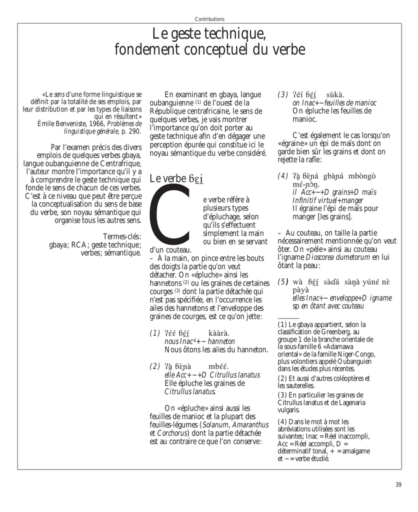 Contributions Le geste technique, fondement conceptuel du verbe « Le sens d’une forme linguistique se définit par la totalité de ses emplois, par leur distribution et par les types de liaisons qui en résultent» Émile Benveniste, 1966, Problèmes de linguistique générale, p. 290. Par l’examen précis des divers emplois de quelques verbes gbaya, langue oubanguienne de Centrafrique, l’auteur montre l’importance qu’il y a à comprendre le geste technique qui fonde le sens de chacun de ces verbes. C’est à ce niveau que peut être perçue la conceptualisation du sens de base du verbe, son noyau sémantique qui organise tous les autres sens. Termes-clés : gbaya; RCA; geste technique ; verbes ; sémantique. En examinant en gbaya, langue oubanguienne (1) de l’ouest de la République centrafricaine, le sens de quelques verbes, je vais montrer l’importance qu’on doit porter au geste technique afin d’en dégager une perception épurée qui constitue ici le noyau sémantique du verbe considéré. ( 3 ) ÀŽ’ §ƒê s•kˆ. on Inac+~ feuilles de manioc On épluche les feuilles de manioc. Le verbe §€ì ( 4) Àµ §Ë–‡ gbˆ–‡ mb˜ng˜ mç-–ñ„. il Acc+~+D grains+D maïs Infinitif virtuel+manger Il égraine l’épi de maïs pour manger [les grains]. C e verbe réfère à plusieurs types d’épluchage, selon qu’ils s’effectuent simplement la main ou bien en se servant d’un couteau. – À la main, on pince entre les bouts des doigts la partie qu’on veut détacher. On «épluche» ainsi les hannetons (2) ou les graines de certaines courges (3) dont la partie détachée qui n’est pas spécifiée, en l’occurrence les ailes des hannetons et l’enveloppe des graines de courges, est ce qu’on jette: (1 ) Àçç §ƒê kˆˆrˆ. nous Inac 4+ ~ hanneton Nous ôtons les ailes du hanneton. (2 ) Àµ §Ë–ˆ mbçç. elle Acc + ~ +D Citrullus lanatus Elle épluche les graines de Citrullus lanatus. On «épluche» ainsi aussi les feuilles de manioc et la plupart des feuilles-légumes (Solanum, Amaranthus et Corchorus) dont la partie détachée est au contraire ce que l’on conserve: C’est également le cas lorsqu’on « égraine » un épi de maïs dont on garde bien sûr les grains et dont on rejette la rafle : – Au couteau, on taille la partie nécessairement mentionnée qu’on veut ôter. On « pèle » ainsi au couteau l’igname Dioscorea dumetorum en lui ôtant la peau : ( 5) wˆ §ƒê sˆ¥‡ sˆ„ˆ yœnç nË pˆyˆ elles Inac+~ enveloppe+D igname sp en ôtant avec couteau (1) Le gbaya appartient, selon la classification de Greenberg, au groupe 1 de la branche orientale de la sous-famille 6 «Adamawa oriental» de la famille Niger-Congo, plus volontiers appelé Oubanguien dans les études plus récentes. (2) Et aussi d’autres coléoptères et les sauterelles. (3) En particulier les graines de Citrullus lanatus et de Lagenaria vulgaris. (4) Dans le mot à mot les abréviations utilisées sont les suivantes; Inac = Réel inaccompli, Acc = Réel accompli, D = déterminatif tonal, + = amalgame et ~ = verbe étudié. 39 Contributions Elles épluchent les ignames au couteau. On «taille» aussi la pointe des flèches: ( 6) À‡m bç–‡ nœ nd˜¥˜. je Acc+~+D bout+D flèche J’ai taillé la pointe de la flèche. C’est cette acception précise qui est retenue pour l’emploi intransitif de ce verbe signifiant alors « être pointu » : (7) yˆng—ˆ §ç–‡ §éê. menton+D+lui Acc+~+D Énonciatif Il a le menton pointu. Dans tous ces emplois ( ex. 1 à 6 ) le procès exprimé par le verbe §€ì vise à réduire la matière de l’élément de base. Je le rendrai par «ôter de la matière à un tout». Le geste technique qui en résulte est fonction de l’instrument employé – main ou couteau –, et du point d’application ou de la partie conservée. Dans un autre domaine, celui de la parole, l’emploi de ce même verbe §€ì donne lieu à plusieurs sens qui tous renvoient à ce même sens de base, prenant en compte un examen de la parole afin de la débarrasser d’éléments soit pour en comprendre le sens, soit pour permettre un accord: ( 8) wˆ §ƒê w•n kîm nË ¥˜„. ils Inac+~ parole de+moi par derrière Après ils ont passé au crible mes paroles. ( 9) z˜r˜ §ƒê, sçk‡ y•Ž gËn. poisson Inac+~ avant de Acc+entrer+D nasse Les poissons se concertent avant d’entrer dans la nasse. [proverbe] Le verbe hìk Ce verbe réfère à un épluchage qui consiste à imprimer une pression 40 par un mouvement. Il s’agit d’un épluchage à la main dont la position varie selon la direction du mouvement. – Lorsque le geste va vers le bas, la pression est exercée en pinçant entre le pouce et l’index l’élément dont on veut détacher ce qu’il porte ou contient. On vide ainsi de ses excréments les boyaux de l’intestin d’un cabri : (10 ) ÀŽ’ hêk ¥ñr‡ˆ yœnç. on Inac+~ merde+D+cela en ôtant On pince le boyau pour en faire sortir les excréments. On débarrasse la tige centrale du Solanum aethiopicum de ses feuilles simplement en la pinçant entre le pouce et l’index puis en laissant glisser la main : (11) w’k—˜ hík‡ w‡–‡ ng‡g˜. femme Acc+~+D feuille+D Solanum aethiopicum La femme épluche le Solanum aethiopicum ( technique d’épluchage ). Et l’on fait pareillement glisser les soldats de termites de la paille à laquelle ils s’accrochent dans un récipient ( technique de récolte (5) ). – Lorsque le geste va vers le haut, c’est la main toute entière qui enserre le support tout en conservant dans son creux ce qu’on veut en détacher, comme pour la récolte des coléoptères Popillea: (12 ) ÀŽ’ hêk kˆ„ˆ- d˜ hík’. on Inac+~ Coléoptère sp. Énonciatif On récolte les coléoptères Popillea en glissant la main le long de la tige d’herbes. C’est la translation de ce geste qui, dans d’autres domaines entraîne, aussi bien dans des constructi