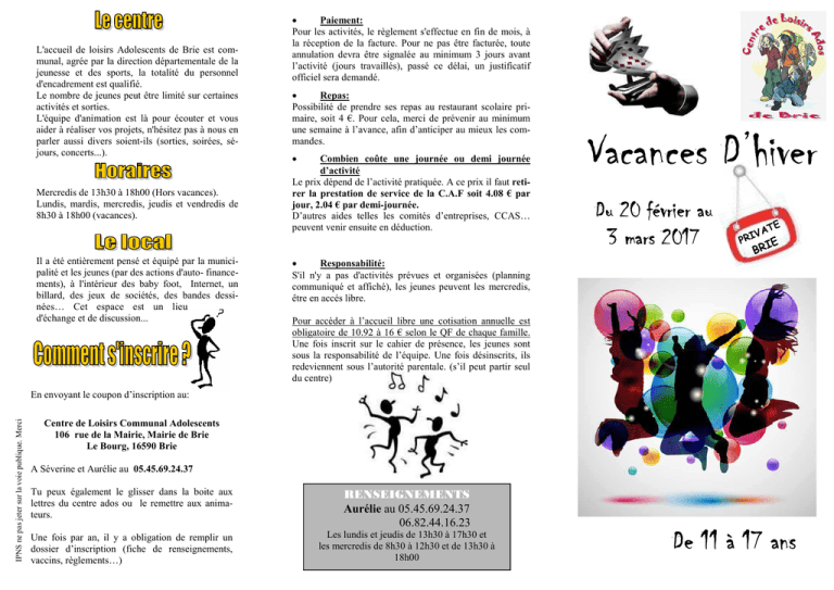 L'accueil de loisirs Adolescents de Brie est communal, agrée par la direction départementale de la jeunesse et des sports, la totalité du personnel d'encadrement est qualifié. Le nombre de jeunes peut être limité sur certaines activités et sorties. L'équipe d'animation est là pour écouter et vous aider à réaliser vos projets, n'hésitez pas à nous en parler aussi divers soient-ils (sorties, soirées, séjours, concerts...). Mercredis de 13h30 à 18h00 (Hors vacances). Lundis, mardis, mercredis, jeudis et vendredis de 8h30 à 18h00 (vacances). Il a été entièrement pensé et équipé par la municipalité et les jeunes (par des actions d'auto- financements), à l'intérieur des baby foot, Internet, un billard, des jeux de sociétés, des bandes dessinées… Cet espace est un lieu d'échange et de discussion... • Paiement: Pour les activités, le règlement s'effectue en fin de mois, à la réception de la facture. Pour ne pas être facturée, toute annulation devra être signalée au minimum 3 jours avant l’activité (jours travaillés), passé ce délai, un justificatif officiel sera demandé. • Repas: Possibilité de prendre ses repas au restaurant scolaire primaire, soit 4 €. Pour cela, merci de prévenir au minimum une semaine à l’avance, afin d’anticiper au mieux les commandes. Combien coûte une journée ou demi journée d’activité Le prix dépend de l’activité pratiquée. A ce prix il faut retirer la prestation de service de la C.A.F soit 4.08 € par jour, 2.04 € par demi-journée. D’autres aides telles les comités d’entreprises, CCAS… peuvent venir ensuite en déduction. • Vacances D’hiver Du 20 février au 3 mars 2017 E AT V I PR IE BR • Responsabilité: S'il n'y a pas d'activités prévues et organisées (planning communiqué et affiché), les jeunes peuvent les mercredis, être en accès libre. Pour accéder à l’accueil libre une cotisation annuelle est obligatoire de 10.92 à 16 € selon le QF de chaque famille. Une fois inscrit sur le cahier de présence, les jeunes sont sous la responsabilité de l’équipe. Une fois désinscrits, ils redeviennent sous l’autorité parentale. (s’il peut partir seul du centre) IPNS ne pas jeter sur la voie publique. Merci En envoyant le coupon d’inscription au: Centre de Loisirs Communal Adolescents 106 rue de la Mairie, Mairie de Brie Le Bourg, 16590 Brie A Séverine et Aurélie au 05.45.69.24.37 Tu peux également le glisser dans la boite aux lettres du centre ados ou le remettre aux animateurs. RENSEIGNEMENTS Aurélie au 05.45.69.24.37 06.82.44.16.23 Une fois par an, il y a obligation de remplir un dossier d’inscription (fiche de renseignements, vaccins, règlements…) Les lundis et jeudis de 13h30 à 17h30 et les mercredis de 8h30 à 12h30 et de 13h30 à 18h00 De 11 à 17 ans Lundi 27 février Vacances d’Hiver 2017 Heure de départ 9h30 Heure de départ Matin Mardi 21 février Mercredi 22 février Jeudi 23 février Vendredi 24 février 9h00 9h30 9h30 8h20 9h30 Squash Badminton Journée Atelier dessin : Pixel art Heure de retour de Jonzac 16/02/2017 Divers Baskets de rechange propres Heure de départ 13h15 21/02/2017 Game 13h45 Heure de retour Divers 23/02/2017 Heure de départ Baskets de rechange propres De 4.91 à 7.34 € 17h30 De 10.69 à 16.02 € 17h45 De 4.91 à 7.34 € 17h00 De 13.41 à 20.06 € 17h45 Heure de retour De 2.68 à 4.00 € Inscription jusqu’au 20/02/2017 Pique-nique 21/02/2017 22/02/2017 Pique-nique Activités au choix : Tournoi de fléchettes et sarbacanes ∗ Tournoi Fifa sur Xbox one 12h00 01/03/2017 02/03/2017 13h30 14h00 14h30 Atelier Pâtisserie Après-midi Jeux + Soirée Montagnarde (sans la neige !) Patinoire 24/02/2017 De 2.68 à 4.00 € De 4.45 à 6.67 € (par jour) 17h00 17h30 22h30 17h45 24/02/2017 27/02/2017 01/03/2017 02/03/2017 De 2.68 à 4.00 € De 7.14 à 10.69 € 17h00 Divers 16/02/2017 9h30 12h00 Les jeunes participant au stage, accompagnés du magicien, mettront en pratique leurs tours lors de la soirée d’ouverture du festival Mars en Braconne le samedi 18 mars à Marsac. Après-midi Défis : 60 secondes chrono 9h30 De 2.68 à 4.00€ 14h Escrime Vendredi 3 mars De 2.68 à 4.00 € Intervenant : Axel Vergnaud, magicien professionnel. 12h15 Inscription jusqu’au Jeudi 2 mars ∗ Création bijoux récup’ De 7.14 à 10.69 € 12h15 (Poitiers) Cinéma (choix du film Après-midi sur place) Divers De 2.68 à 4.00 € Apprendre des tours et à les mettre en scène Laser Inscription jusqu’au Inscription jusqu’au Journée 12h00 12h00 Heure de retour De 2.68 à 4.00 € 9h00 Bowling Foot avec variantes aux Antilles De 2.68 à 4.00 € Mercredi 1er mars STAGE MAGIE Matin Lundi 20 février Mardi 28 février Pique-nique 23/02/2017 Début des inscriptions : Mercredi 1er février dès 13h30 au Centre Ados. Jeton pour le casier + gants