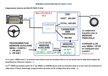 RESUME UTILISATION RALLYE PACK 2 V4.0 Organisation interne du RALLYE PACK 2 V4.0 Il n’y a plus 1 MENU mais 2 ! Le premier menu donne accès aux fonctions dont on se sert durant tout le rallye (heure départ ZR, prog Moyenne, Distances, Capture, …). Le 2ème MENU (accessible à partir du 1er par MENU / 5.CONFIG) donne accès aux fonctions dont on se sert avant de commencer le rallye (mise à l’heure, étalonnage, programmation de toutes les ZR, configuration de la sonde, ….). APPUI sur la touche MENU ( M ) : 1. MOY : Programmation des moyennes en mémoire principale. 5. CONFIG : Accès au sous-menu de configuration 2.DIST : Programmation des distances en mémoire principale. 6.RAZ ZR : Efface la mémoire principale. Durée : 2 secondes. 3.H ZR : Programmation de l’heure de départ de ZR. M / 0 : minute suivante 7.OnLINE : Déclenche le cadenceur manuellement en roulant. 4.UP ZR : Chargement en mémoire principale de la prochaine ZR à effectuer. 8.CAPTUR : Capture de la distance du TRIP pour Changement de moyenne sur distance inconnue. Fonctions cachées : M/0 : Départ dans la minute entière suivante. M/9 : Refait tout calculer au cadenceur depuis l’heure de départ de ZR. APPUI sur la touche 5 ( CONFIG ) depuis le menu précédent 1.PR MOY : Programmation des 48 moyennes des 60 ZR en mémoire auxiliaire. 5. ETALO : Etalonnage du TRIP 2.PR DIST : Programmation des 48 distances des 60 ZR en mémoire auxiliaire. 6.RAZ ZR : Efface les 60 ZR de la mémoire auxiliaire. Durée : 1 minute 30 ! A faire avant le rallye. 3.SONDE : Division par 1 2 4 ou 5 des impulsions de la sonde. 7.Mod ET : Modification de la distance d’étalonnage en roulant. 4.HEURE : Mise à l’heure du RP2 sur l’horloge officielle du rallye. 8.AFF Me: Configure l’affichage (ou pas) des mètres du TRIP et du CADENCEUR. Les ZR (jusqu’à 60 ZR) sont stockées en mémoire AUXILIAIRE. Le cadenceur ne peut pas cadencer directement avec les données stockées en mémoire AUXILIAIRE ! Pour pouvoir cadencer il FAUT au préalable charger en mémoire PRINCIPALE la prochaine ZR à effectuer, dans la liaison conduisant à la prochaine ZR. Le chargement de la ZR se fait comme ceci : MENU / 4.UP ZR et on indique le numéro de ZR que l’on veut. Le chargement dure 2 secondes. 4.UP ZR =>