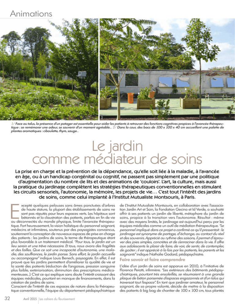 Animations 1 2 1/ Face au talus, la présence d’un potager est essentielle pour aider les patients à retrouver des fonctions cognitives propices à l’avancée thérapeutique : se remémorer une odeur, se souvenir d’un moment agréable… 2/ Dans la cour, des bacs de 100 x 100 x 40 cm accueillent une palette de plantes aromatiques : ciboulette, thym, sauge… Le jardin comme médiateur de soins La prise en charge et la prévention de la dépendance, qu’elle soit liée à la maladie, à l’avancée en âge, ou à un handicap congénital ou cognitif, ne passent pas simplement par une politique d’augmentation du nombre de lits et des animations de ‘couloirs’. L’art, la culture, mais aussi la pratique du jardinage complètent les stratégies thérapeutiques conventionnelles en stimulant les circuits sensoriels, l’autonomie, la mémoire, les projets de vie… C’est tout l’intérêt des jardins de soins, comme celui implanté à l’Institut Mutualiste Montsouris, à Paris. E xcepté quelques pelouses sans âmes ponctuées d’arbres de haute stature, la plupart des établissements de soins ne sont pas réputés pour leurs espaces verts. Les hôpitaux sont bétonnés et la claustration des patients, parfois en fin de vie ou déconnectés du monde physique, limite l’avancée thérapeutique. Fort heureusement, la vision holistique du personnel soignant, médecins et infirmières, soutenus par des paysagistes convaincus, soutiennent la conception de nouveaux espaces de prise en charge des patients : les jardins de soins, le terme de thérapeutique étant plus favorable à un traitement médical. “Pour tous, le jardin est un lieu serein et une trêve nécessaire. Et tous, nous avons des fragilités et des failles. Que ce soit une incapacité d’autonomie, une maladie, des souffrances, le jardin panse. Sans effort, le jardin accueille ou accompagne” indique Louis Benech, paysagiste. En effet, il est prouvé que les jardins permettent d’améliorer la qualité de vie et la santé des patients (réduction de l’angoisse, pression sanguine plus faible, extériorisation, diminution des prescriptions médicamenteuses…). C’est ce qui explique sans doute l’intérêt croissant des équipes médicales, pourtant en manque de financements, dans la création de jardins de soins. Conscient de l’intérêt de ces espaces de nature dans la thérapeutique conventionnelle, l’équipe du département pédopsychiatrique 32 Avril 2015 Les cahiers du fleurissement de L’Institut Mutualiste Montsouris, en collaboration avec l’association Jardin Art et Soin, la Fondation Gecina et Id Verde, a souhaité offrir à ses patients un jardin de liberté, métaphore du jardin de soins, propice à la transition vers l’autonomie. Résultat : même avec des moyens limités, le jardinage est aujourd’hui perçu par les équipes médicales comme un outil de médiation thérapeutique. “Le personnel impliqué dans ce projet a confirmé ce qu’il pressentait : le jardinage est synonyme de partage, d’échange, au contact du réel et des souvenirs. Apprécié au rythme des saisons, il permet d’éprouver des joies simples, concrètes et de s’enraciner dans la vie. Il offre aux adolescents le plaisir de faire, de voir, de sentir, de contempler, de goûter ; il est apprécié à la fois par les patients, les parents et les soignants” indique Nathalie Godard, pédopsychiatre. Faire savoir et faire comprendre L’idée d’un jardin de soins est apparue en 2010, à l’initiative de Florence Perotti, infirmière. “Les extérieurs des bâtiments pédopsychiatriques, pourtant très ensoleillés, se résumaient à une grande plaque de béton parsemée d’espaces engazonnés et d’un talus qui traversait tout l’espace”. En tant que jardinier amateur, le personnel soignant, de sa propre volonté, décide de mettre à la disposition des patients 6 big bag de chantier de 100 x 100 cm, tous plantés Animations 3 4 3/ Très odorant, le romarin rampant (Rosmarinus officinalis ‘Prostratus’) a été utilisé pour couvrir les zones talutées difficiles à entretenir. Et nombreux sont les patients qui aiment caresser la plante et retrouver son parfum caractéristique. 4/ Organisation d’ateliers de jardinage avec de jeunes patients. Les objectifs du jardin de soins sont multiples : retrouver le goût du travail manuel, rétablir des projets de groupe, calquer son rythme de vie sur celui de la nature. d’espèces potagères. “Ils proviennent du Domaine de Courson qui nous a également fait don de plantes et de pots”. Et le test s’est avéré concluant. En 2012, au vu de l’ampleur du projet et de l’observation des premiers signes cliniques favorables à l’avancée de la thérapie, deux membres du personnel soignant partent en formation au Domaine de Chaumont-sur-Loire pour ‘étoffer’ le jardin en place. “En présentant notre projet de jardin dans une grande structure comme Montsouris, les partenaires de l’association Jardin Art et Soin étaient très enthousiastes”. Ces derniers, sensibles à la dynamique de l’équipe, ont proposé leur aide. En effet, la dimension ‘artisanale’ et précaire des moyens mis en œuvre était difficilement pérenne. Prendre soin des plantes… Un jardin de soins n’est pas si différent d’un jardin dit classique. “Il ne faut pas chercher à créer un jardin conceptuel, c’est-à-dire intelligent et d’un usage facile. La nature doit s’exprimer librement, avec ses avantages et ses inconvénients, afin de transmettre aux patients la réalité de la vie” indique Louis Benech, qui a participé bénévolement à la requalification du jardin de soins de Montsouris. Le jardin existant possédait quelques arbres, des espaces ensoleillés, d’autres ombragés, et un petit potager de pleine-terre. Le paysagiste a donc souhaité conserver la conception originelle en intégrant quelques améliorations, tant pratiques qu’esthétiqu