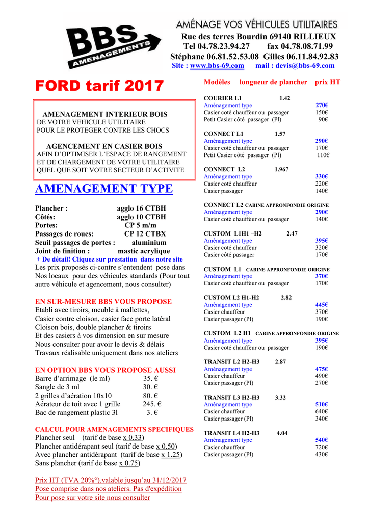 Rue des terres Bourdin 69140 RILLIEUX Tel 04.78.23.94.27 fax 04.78.08.71.99 Stéphanewww.bbs-69.com 06.81.52.53.08 [email protected] Gilles 06.11.84.92.83 Site : www.bbs-69.com FORD tarif 2017 AMENAGEMENT INTERIEUR BOIS DE VOTRE VEHICULE UTILITAIRE POUR LE PROTEGER CONTRE LES CHOCS AGENCEMENT EN CASIER BOIS AFIN D’OPTIMISER L’ESPACE DE RANGEMENT ET DE CHARGEMENT DE VOTRE UTILITAIRE QUEL QUE SOIT VOTRE SECTEUR D’ACTIVITE AMENAGEMENT TYPE Plancher : agglo 16 CTBH Côtés: agglo 10 CTBH Portes: CP 5 m/m Passages de roues: CP 12 CTBX Seuil passages de portes : aluminium Joint de finition : mastic acrylique + De détail! Cliquez sur prestation dans notre site Les prix proposés ci-contre s’entendent pose dans Nos locaux pour des véhicules standards (Pour tout autre véhicule et agencement, nous consulter) EN SUR-MESURE BBS VOUS PROPOSE Etabli avec tiroirs, meuble à mallettes, Casier contre cloison, casier face porte latéral Cloison bois, double plancher & tiroirs Et des casiers à vos dimension en sur mesure Nous consulter pour avoir le devis & délais Travaux réalisable uniquement dans nos ateliers EN OPTION BBS VOUS PROPOSE AUSSI Barre d’arrimage (le ml) 35. € Sangle de 3 ml 30. € 2 grilles d’aération 10x10 80. € Aérateur de toit avec 1 grille 245. € Bac de rangement plastic 3l 3. € CALCUL POUR AMENAGEMENTS SPECIFIQUES Plancher seul (tarif de base x 0.33) Plancher antidérapant seul (tarif de base x 0.50) Avec plancher antidérapant (tarif de base x 1.25) Sans plancher (tarif de base x 0.75) Prix HT (TVA 20%°).valable jusqu’au 31/12/2017 Pose comprise dans nos ateliers. Pas d'expédition Pour pose sur votre site nous consulter Modèles mail : [email protected] longueur de plancher prix HT COURIER L1 1.42 Aménagement type Casier coté chauffeur ou passager Petit Casier côté passager (Pl) 270€ 150€ 90€ CONNECT L1 1.57 Aménagement type Casier coté chauffeur ou passager Petit Casier côté passager (Pl) 290€ 170€ 110€ CONNECT L2 Aménagement type Casier coté chauffeur Casier passager 330€ 220€ 140€ 1.967 CONNECT L2 CABINE APPRONFONDIE ORIGINE Aménagement type 290€ Casier coté chauffeur ou passager 140€ CUSTOM L1H1 –H2 Aménagement type Casier coté chauffeur Casier côté passager 2.47 395€ 320€ 170€ CUSTOM L1 CABINE APPRONFONDIE ORIGINE Aménagement type 370€ Casier coté chauffeur ou passager 170€ CUSTOM L2 H1-H2 Aménagement type Casier chauffeur Casier passager (Pl) 2.82 445€ 370€ 190€ CUSTOM L2 H1 CABINE APPRONFONDIE ORIGINE Aménagement type 395€ Casier coté chauffeur ou passager 190€ TRANSIT L2 H2-H3 Aménagement type Casier chauffeur Casier passager (Pl) 2.87 TRANSIT L3 H2-H3 Aménagement type Casier chauffeur Casier passager (Pl) 3.32 TRANSIT L4 H2-H3 Aménagement type Casier chauffeur Casier passager (Pl) 4.04 475€ 490€ 270€ 510€ 640€ 340€ 540€ 720€ 430€