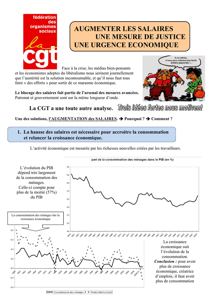 AUGMENTER LES SALAIRES UNE MESURE DE JUSTICE UNE URGENCE ECONOMIQUE Face à la crise, les médias bien-pensants et les économistes adeptes du libéralisme nous serinent journellement que l’austérité est la solution incontournable, et qu’il nous faut tous faire « des efforts » pour sortir de ce marasme économique. Le blocage des salaires fait partie de l’arsenal des mesures avancées. Patronat et gouvernement sont sur la même longueur d’onde. La CGT a une toute autre analyse. Une des solutions, l’AUGMENTATION des SALAIRES. Î Pourquoi ? Î Comment ? 1. La hausse des salaires est nécessaire pour accroitre la consommation et relancer la croissance économique. L’activité économique est mesurée par les richesses nouvelles créées par les travailleurs. L’évolution du PIB dépend très largement de la consommation des ménages. Celle-ci compte pour plus de la moitié (57%) du PIB La consommation des ménages tire la croissance économique La croissance économique suit l’évolution de la consommation. Conclusion : pour avoir plus de croissance économique, créatrice d’emplois, il faut avoir plus de consommation Le meilleur moyen pour augmenter la consommation des ménages est d’augmenter les salaires. 2. Rééquilibrer le partage de la valeur ajoutée en faveur des travailleurs. Ce qui handicape la France, ce n’est pas le « coût Autrement dit, les prélèvements financiers sont du travail » mais bien les prélèvements équivalents à 2/3 du salaire brut ! financiers. La part des salaires dans la valeur Le patronat et le En 1950, pour 100 €uros de salaires brut ajoutée (richesses créées) a reculé de gouvernement versés aux salariés (ce qui intègre les 10 points dans les années 1980. Cette prétendent qu’il tendance se poursuit. cotisations sociales payées par les n’est pas possible salariés) les entreprises versaient 10 d’augmenter les Chaque point de PIB représentant 20 €uros à leurs actionnaires et 4 €uros sous salaires. milliards d’€uros par an, c’est donc la forme de charges d’intérêt de leurs C’EST FAUX ! 200 milliards d’€uros supplémentaires dettes. qui passent, chaque année et cela depuis plus de vingt ans, du coût du travail à celui du capital et Aujourd’hui, pour 100 €uros de salaires des profits patronaux. versés aux salariés, les actionnaires reçoivent 49 €uros et les créanciers 18 €uros. Concernant le « coût du travail » en France, il se situe dans la moyenne des pays qui ont à peu près le même développement économique et social. En revanche, la France se situe dans le peloton de tête en ce qui concerne la productivité du travail, c’est-à-dire la quantité de biens et services, de marchandises, que la force de travail permet de produire en un laps de temps donné. Lorsque l’on tient compte de cette productivité, la rémunération des salariés est plus élevée au Danemark, en Suède, en Finlande, en Autriche, en Allemagne, en Italie, au Pays Bas… 3. Augmenter les salaires pour accroitre les ressources de la protection sociale. Dans le « modèle social » français, le salaire est composé de deux parties : - une partie qui est directement versée au salarié, c’est le salaire net. - L’autre partie est mise dans un « pot commun », à savoir les cotisations sociales. Il faut bien préciser que les cotisations sociales forment une partie du salaire qui, au lieu d’être directement versée au salarié, sert à financer la production des « biens publics » de l’ensemble de la protection sociale. Seuls les très riches de nos concitoyens pourraient éventuellement y parvenir. On voit tout l’intérêt de sauvegarder et d’améliorer notre système de protection sociale. Or, les politiques salariales menées depuis trente ans, le chômage qui en découle, la financiarisation de l’économie mettent à mal les ressources de la Sécurité sociale et des caisses de retraites complémentaires, assurance chômage... Les cotisations sociales dites « patronales » font partie intégrante du salaire. L’augmentation des salaires est un des paramètres incontournables, avec la réduction du chômage, d’un apport efficace en ressources. Si on supprimait les cotisations sociales, autrement dit si on changeait du jour au lendemain notre « modèle social », il faudrait augmenter les salaires nets à due concurrence. Un seul point d’augmentation de la masse salariale = 2 milliards d’€uros de cotisations supplémentaires … Tout serait directement versé aux salariés, à charge pour eux de se débrouiller pour la santé, la retraite… d’eux-mêmes et de leur famille ! Finie la solidarité ! Le rééquilibrage de la part réservée aux salariés dans la valeur ajoutée telle que nous la connaissions il y a trente ans apporterait au bas mot 30 milliards d’€uros annuels dans les caisses de la protection sociale. La société est donc confrontée à un choix politico-économique : - Soit on continue la dérive financière imposée ces trente dernières années, à savoir paupérisation de la population qui travaille au profit de la seule finance et de l’actionnariat. - Soit l’on impose une plus juste répartition des richesses engendrées par le travail au profit de ceux qui créent cette plus value. Cela contribuera à l’amélioration du niveau de vie de nos concitoyens et assurera un haut niveau de protection sociale. Avec la CGT l’expression des salariés pour l’augmentation des salaires est la seule solution. Campagne reconquête de la protection sociale : Série II – Tract 1I Ne pas jeter sur la voie publique Février 2013