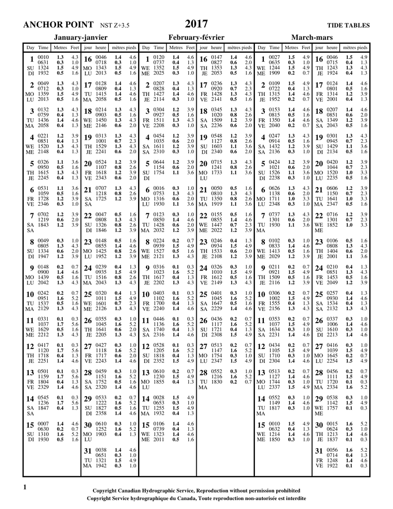 ANCHOR POINT 2017 NST Z+3.5 January-janvier Day Time Metres Feet jour heure TIDE TABLES February-février mètres pieds Day Time Metres Feet jour heure March-mars mètres pieds Day Time Metres Feet jour heure mètres pieds 1 1.3 0.3 1.5 0.5 4.3 16 0046 1.0 0718 4.9 MO 1343 1.6 LU 2013 1.4 0.3 1.5 0.5 4.6 1 0120 1.0 0737 4.9 WE 1352 1.6 ME 2025 1.4 0.4 1.5 0.3 4.6 1.3 4.9 1.0 16 0147 0827 TH 1353 JE 2053 1.4 0.6 1.3 0.5 4.6 1 0027 2.0 0635 4.3 WE 1244 1.6 ME 1909 1.5 0.3 1.5 0.2 4.9 1.0 4.9 0.7 16 0046 0715 TH 1243 JE 1924 1.5 0.4 1.3 0.4 4.9 1.3 4.3 1.3 2 1.3 0.3 1.5 0.5 4.3 17 1.0 4.9 TU 1.6 MA 0128 0809 1415 2058 1.4 0.4 1.4 0.5 4.6 1.3 4.6 1.6 2 1.3 0.4 1.4 0.3 4.3 1.3 4.6 1.0 17 0236 0920 FR 1428 VE 2141 1.3 0.7 1.3 0.5 4.3 2.3 4.3 1.6 2 1.5 0.4 1.4 0.2 4.9 1.3 4.6 0.7 17 0124 0801 FR 1314 VE 2001 1.4 0.5 1.2 0.4 4.6 1.6 3.9 1.3 3 1.3 0.4 1.4 0.4 4.3 18 0214 1.3 0903 4.6 WE 1450 1.3 ME 2146 1.3 0.5 1.3 0.6 4.3 1.6 4.3 2.0 3 1.2 0.5 1.3 0.3 3.9 1.6 4.3 1.0 18 0345 1020 SA 1509 SA 2236 1.3 0.8 1.2 0.6 4.3 2.6 3.9 2.0 3 1.4 0.5 1.4 0.2 4.6 1.6 4.6 0.7 18 0207 0851 SA 1349 SA 2043 1.4 0.6 1.2 0.5 4.6 2.0 3.9 1.6 4 1.2 0.4 1.3 0.4 3.9 1.3 4.3 1.3 19 0313 1001 TH 1529 JE 2241 1.3 0.7 1.3 0.6 4.3 2.3 4.3 2.0 4 1.2 0.6 1.2 0.3 3.9 2.0 3.9 1.0 19 0548 1127 SU 1603 DI 2340 1.2 0.8 1.1 0.6 3.9 2.6 3.6 2.0 4 1.3 0.5 1.2 0.3 4.3 1.6 3.9 1.0 19 0301 0945 SU 1429 DI 2134 1.3 0.7 1.1 0.5 4.3 2.3 3.6 1.6 5 1.1 0.5 1.3 0.4 3.6 1.6 4.3 1.3 20 0524 1107 FR 1618 VE 2343 1.2 0.8 1.2 0.6 3.9 2.6 3.9 2.0 5 1.2 0.6 1.1 3.9 20 0715 2.0 1241 3.6 MO 1733 LU 1.3 0.8 1.1 4.3 2.6 3.6 5 0424 1021 SU 1526 DI 2238 1.2 0.6 1.1 0.3 3.9 20 0420 2.0 1044 3.6 MO 1520 1.0 LU 2235 1.2 0.7 1.0 0.5 3.9 2.3 3.3 1.6 6 1.1 0.5 1.2 0.3 3.6 1.6 3.9 1.0 21 0707 1218 SA 1725 SA 1.3 0.8 1.2 4.3 6 2.6 3.9 MO LU 0016 0753 1316 1930 0.3 1.3 0.6 1.1 1.0 21 4.3 2.0 TU 3.6 MA 0050 0810 1350 1919 0.5 1.3 0.8 1.1 1.6 6 0626 4.3 1138 2.6 MO 1711 3.6 LU 2348 1.3 0.6 1.0 0.3 4.3 21 2.0 3.3 TU 1.0 MA 0606 1150 1641 2347 1.2 0.7 1.0 0.5 3.9 2.3 3.3 1.6 7 1.2 0.6 1.2 3.9 2.0 3.9 22 0047 0808 SU 1326 DI 1846 0.5 1.3 0.8 1.2 1.6 7 4.3 2.6 TU 3.9 MA 0123 0850 1428 2032 0.3 1.4 0.6 1.2 1.0 22 0155 4.6 0855 2.0 WE 1447 3.9 ME 2022 0.5 1.4 0.7 1.2 1.6 7 0737 4.6 1301 2.3 TU 1930 3.9 MA 1.3 0.6 1.1 4.3 22 0716 2.0 1301 3.6 WE 1852 ME 1.2 0.7 1.0 3.9 2.3 3.3 8 0.3 1.3 0.6 1.2 1.0 23 0148 4.3 0855 2.0 MO 1425 3.9 LU 1952 0.5 1.4 0.8 1.2 1.6 8 0224 4.6 0939 2.6 WE 1527 3.9 ME 2121 0.2 1.5 0.5 1.3 0.7 4.9 1.6 4.3 23 0246 0934 TH 1533 JE 2108 0.4 1.5 0.6 1.2 1.3 8 0102 4.9 0833 2.0 WE 1413 3.9 ME 2029 0.3 1.4 0.5 1.2 1.0 4.6 1.6 3.9 23 0106 0808 TH 1404 JE 2001 0.5 1.3 0.6 1.1 1.6 4.3 2.0 3.6 9 0148 0900 MO 1439 LU 2042 0.2 1.4 0.5 1.3 0.7 24 4.6 1.6 TU 4.3 MA 0239 0935 1516 2043 0.4 1.5 0.8 1.3 1.3 4.9 2.6 4.3 9 0316 1023 TH 1617 JE 2202 0.1 1.6 0.4 1.3 0.3 5.2 1.3 4.3 24 0326 1010 FR 1612 VE 2149 0.3 1.5 0.5 1.3 1.0 4.9 1.6 4.3 9 0211 0921 TH 1509 JE 2116 0.2 1.5 0.5 1.2 0.7 4.9 1.6 3.9 24 0210 0851 FR 1453 VE 2049 0.4 1.3 0.5 1.2 1.3 4.3 1.6 3.9 10 0242 0951 TU 1537 MA 2129 0.2 1.6 0.5 1.3 0.7 25 0320 5.2 1011 1.6 WE 1601 4.3 ME 2126 0.4 1.5 0.7 1.3 1.3 4.9 2.3 4.3 10 0403 1102 FR 1700 VE 2240 0.1 1.6 0.4 1.4 0.3 5.2 1.3 4.6 25 0401 1045 SA 1647 SA 2229 0.3 1.6 0.5 1.4 1.0 5.2 1.6 4.6 10 0306 1002 FR 1555 VE 2156 0.2 1.5 0.4 1.3 0.7 4.9 1.3 4.3 25 0257 0930 SA 1534 SA 2132 0.4 1.4 0.4 1.3 1.3 4.6 1.3 4.3 11 0331 1037 WE 1629 ME 2212 0.1 1.7 0.5 1.3 0.3 5.6 1.6 4.3 26 0355 1045 TH 1641 JE 2205 0.3 1.6 0.6 1.3 1.0 5.2 2.0 4.3 11 0446 1136 SA 1740 SA 2316 0.1 1.6 0.4 1.4 0.3 5.2 1.3 4.6 26 0436 1117 SU 1721 DI 2308 0.2 1.6 0.4 1.5 0.7 5.2 1.3 4.9 11 0353 1037 SA 1634 SA 2231 0.2 1.5 0.3 1.4 0.7 4.9 1.0 4.6 26 0337 1006 SU 1610 DI 2213 0.3 1.4 0.3 1.4 1.0 4.6 1.0 4.6 12 0417 1120 TH 1718 JE 2251 0.1 1.7 0.4 1.4 0.3 5.6 1.3 4.6 27 0427 1118 FR 1717 VE 2243 0.3 1.6 0.6 1.4 1.0 5.2 2.0 4.6 12 0528 1205 SU 1818 DI 2352 0.1 1.6 0.4 1.5 0.3 27 0513 5.2 1147 1.3 MO 1754 4.9 LU 2347 0.2 1.6 0.3 1.5 0.7 5.2 1.0 4.9 12 0.2 1.5 0.3 1.4 0.7 27 0416 4.9 1039 1.0 MO 1645 4.6 LU 2254 0.3 1.5 0.2 1.5 1.0 4.9 0.7 4.9 13 0501 1159 FR 1804 VE 2329 0.1 1.7 0.4 1.4 0.3 5.6 1.3 4.6 28 0459 1151 SA 1752 SA 2320 0.3 1.6 0.5 1.4 1.0 13 0610 5.2 1230 1.6 MO 1855 4.6 LU 0.2 1.5 0.4 0.7 4.9 1.3 28 0.3 1.6 0.2 1.0 13 5.2 0.7 MO LU 0513 1127 1744 2337 0.2 1.4 0.3 1.5 0.7 28 4.6 1.0 TU 4.9 MA 0456 1111 1720 2334 0.2 1.5 0.1 1.6 0.7 4.9 0.3 5.2 14 0545 1236 SA 1847 SA 0.1 1.7 0.4 0.3 5.6 1.3 29 0533 1222 SU 1827 DI 2358 0.2 1.6 0.5 1.4 0.7 14 5.2 1.6 TU 4.6 MA 0028 0653 1255 1932 1.5 0.3 1.5 0.4 4.9 1.0 4.9 1.3 14 0552 1149 TU 1817 MA 0.3 1.4 0.3 1.0 29 0538 4.6 1142 1.0 WE 1757 ME 0.3 1.5 0.1 1.0 4.9 0.3 15 1.4 0.2 1.6 0.5 4.6 30 0610 0.7 1252 5.2 MO 1903 1.6 LU 0.3 1.6 0.4 1.0 15 5.2 1.3 WE ME 0106 0739 1323 2011 1.4 0.4 1.4 0.5 4.6 1.3 4.6 1.6 15 1.5 0.4 1.4 0.3 4.9 1.3 4.6 1.0 30 0015 0624 TH 1213 JE 1837 1.6 0.3 1.4 0.1 5.2 1.0 4.6 0.3 31 1.4 0.3 1.5 0.3 4.6 1.0 4.9 1.0 31 1.6 0.4 1.4 0.1 5.2 1.3 4.6 0.3 0010 0631 SU 1324 DI 1932 0049 0712 MO 1359 LU 2013 0132 0759 TU 1436 MA 2058 0221 0851 WE 1520 ME 2148 0326 0950 TH 1615 JE 2245 0531 1059 FR 1728 VE 2346 0702 1219 SA 1843 SA 0049 0805 SU 1334 DI 1947 0007 0630 SU 1310 DI 1930 0038 0651 TU 1321 MA 1942 1 0207 0828 TH 1427 JE 2114 0304 0927 FR 1511 VE 2208 0454 1035 SA 1611 SA 2310 0644 1154 SU 1754 DI 0552 1216 TU 1830 MA 0109 0722 TH 1315 JE 1952 0153 0815 FR 1350 VE 2040 0247 0914 SA 1432 SA 2136 0434 1105 SU 1710 DI 2304 0010 0632 WE 1214 ME 1850 Copyright Canadian Hydrographic Service, Reproduction without permission prohibited Copyright Service hydrographique du Canada, Toute reproduction non-autorisée est interdite 0056 0714 FR 1248 VE 1922 2017 TABLE DES MARÉES April-avril Day Time Metres Feet jour heure ANCHOR POINT May-mai mètres pieds Day Time Metres Feet jour heure June-juin mètres pieds Day Time 16 0342 0951 FR 1518 VE 2154 1.2 0.4 1.1 0.4 3.9 1.3 3.6 1.3 2 1.2 0.5 1.2 3.9 1.6 3.9 17 0441 1044 SA 1652 SA 2259 1.2 0.4 1