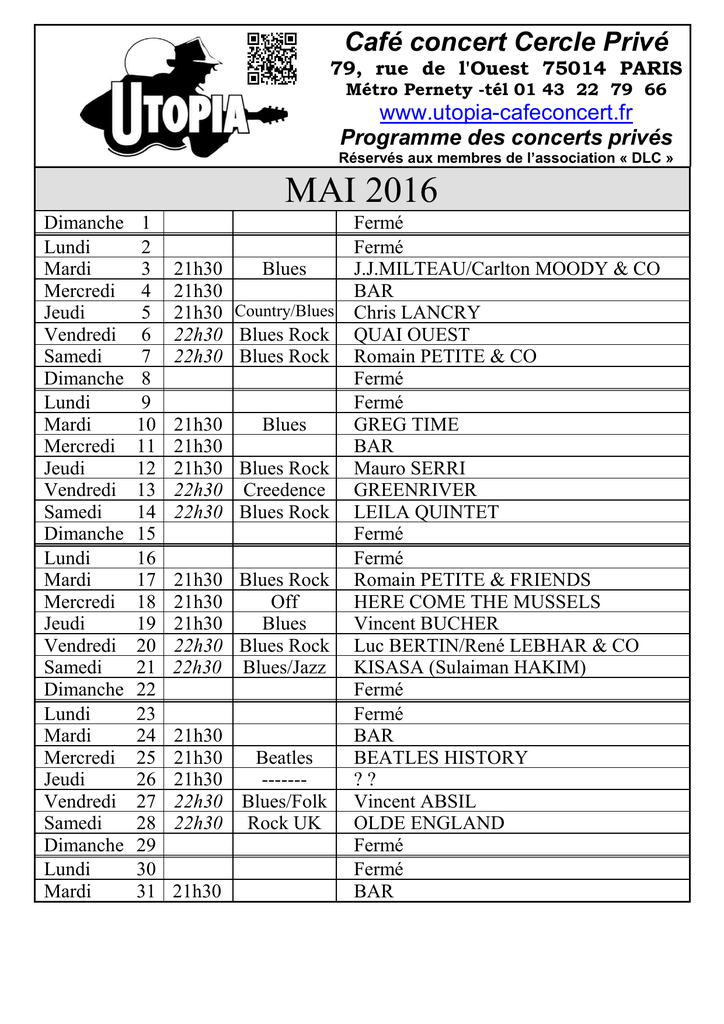 Café concert Cercle Privé 79, rue de l'Ouest 75014 PARIS Métro Pernety -tél 01 43 22 79 66 www.utopia-cafeconcert.fr Programme des concerts privés Réservés aux membres de l’association « DLC » MAI 2016 Dimanche Lundi Mardi Mercredi Jeudi Vendredi Samedi Dimanche Lundi Mardi Mercredi Jeudi Vendredi Samedi Dimanche Lundi Mardi Mercredi Jeudi Vendredi Samedi Dimanche Lundi Mardi Mercredi Jeudi Vendredi Samedi Dimanche Lundi Mardi 1 2 3 4 5 6 7 8 10 9 10 11 12 13 14 15 18 16 17 18 19 20 21 22 26 23 24 25 26 27 28 29 4 30 31 21h30 Blues 21h30 21h30 Country/Blues 22h30 Blues Rock 22h30 Blues Rock 21h30 Blues 21h30 21h30 Blues Rock 22h30 Creedence 22h30 Blues Rock 21h30 Blues Rock 21h30 Off 21h30 Blues 22h30 Blues Rock 22h30 Blues/Jazz 21h30 21h30 Beatles 21h30 ------22h30 Blues/Folk 22h30 Rock UK 21h30 Fermé Fermé J.J.MILTEAU/Carlton MOODY & CO BAR Chris LANCRY QUAI OUEST Romain PETITE & CO Fermé Fermé GREG TIME BAR Mauro SERRI GREENRIVER LEILA QUINTET Fermé Fermé Romain PETITE & FRIENDS HERE COME THE MUSSELS Vincent BUCHER Luc BERTIN/René LEBHAR & CO KISASA (Sulaiman HAKIM) Fermé Fermé BAR BEATLES HISTORY ?? Vincent ABSIL OLDE ENGLAND Fermé Fermé BAR