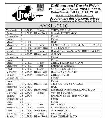 Café concert Cercle Privé 79, rue de l'Ouest 75014 PARIS Métro Pernety -tél 01 43 22 79 66 www.utopia-cafeconcert.fr Programme des concerts privés Réservés aux membres de l’association « DLC » AVRIL 2016 Vendredi Samedi Dimanche Lundi Mardi Mercredi Jeudi Vendredi Samedi Dimanche Lundi Mardi Mercredi Jeudi Vendredi Samedi Dimanche Lundi Mardi Mercredi Jeudi Vendredi Samedi Dimanche Lundi Mardi Mercredi Jeudi Vendredi Samedi 1 2 3 4 5 6 7 8 9 10 11 12 13 14 15 16 17 18 19 20 21 22 23 24 25 26 27 28 29 30 22h30 Blues 22h30 Blues Rock 21h30 21h30 Blues 21h30 Country/Blues 22h30 Blues 22h30 Blues Rock 21h30 Blues 21h30 Off 21h30 Doors 22h30 Blues Rock 22h30 Creedence 21h30 Blues Rock 21h30 21h30 Blues Rock 22h30 Blues 22h30 ------21h30 Off 21h30 ------21h30 Rockabilly 22h30 Blues 22h30 Blues Rock CHICAGO LINE Romain PETITE &CO Fermé Fermé BAR J.J.MILTEAU/C.JUDD/G.MICHEL & CO Chris LANCRY Benoit Blue Boy/Steve VERBEKE & CO ZORAN Fermé Fermé GREG TIME (Greg ZLAP) Entreprise familiale MORRISON CLUB BLUES SYNDICATE GREENRIVER Fermé Fermé 3 KINGS (Eric STARCZAN) BAR Luc BERTIN/Basile LEROUX & CO Vincent BUCHER EMPLOYEE OF THE MONTH Fermé Fermé HIT 2 SOUL Riquet/Mercier/Galvin VOCABILLY Ian KENT & CO René LEBHAR & CO