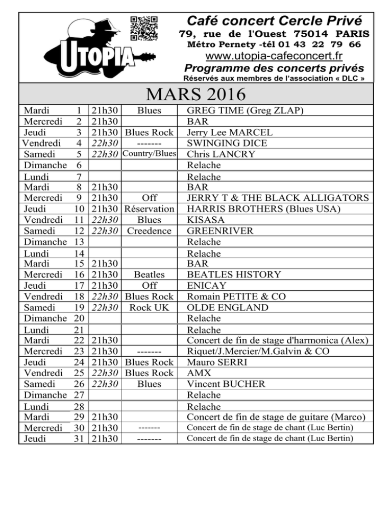 Café concert Cercle Privé 79, rue de l'Ouest 75014 PARIS Métro Pernety -tél 01 43 22 79 66 www.utopia-cafeconcert.fr Programme des concerts privés Réservés aux membres de l’association « DLC » MARS 2016 Mardi Mercredi Jeudi Vendredi Samedi Dimanche Lundi Mardi Mercredi Jeudi Vendredi Samedi Dimanche Lundi Mardi Mercredi Jeudi Vendredi Samedi Dimanche Lundi Mardi Mercredi Jeudi Vendredi Samedi Dimanche Lundi Mardi Mercredi Jeudi 1 2 3 4 5 6 7 8 9 10 11 12 13 14 15 16 17 18 19 20 21 22 23 24 25 26 27 28 29 30 31 21h30 Blues 21h30 21h30 Blues Rock 22h30 ------22h30 Country/Blues 21h30 21h30 Off 21h30 Réservation 22h30 Blues 22h30 Creedence 21h30 21h30 Beatles 21h30 Off 22h30 Blues Rock 22h30 Rock UK 21h30 21h30 ------21h30 Blues Rock 22h30 Blues Rock 22h30 Blues 21h30 21h30 21h30 ------- ------- GREG TIME (Greg ZLAP) BAR Jerry Lee MARCEL SWINGING DICE Chris LANCRY Relache Relache BAR JERRY T & THE BLACK ALLIGATORS HARRIS BROTHERS (Blues USA) KISASA GREENRIVER Relache Relache BAR BEATLES HISTORY ENICAY Romain PETITE & CO OLDE ENGLAND Relache Relache Concert de fin de stage d'harmonica (Alex) Riquet/J.Mercier/M.Galvin & CO Mauro SERRI AMX Vincent BUCHER Relache Relache Concert de fin de stage de guitare (Marco) Concert de fin de stage de chant (Luc Bertin) Concert de fin de stage de chant (Luc Bertin)