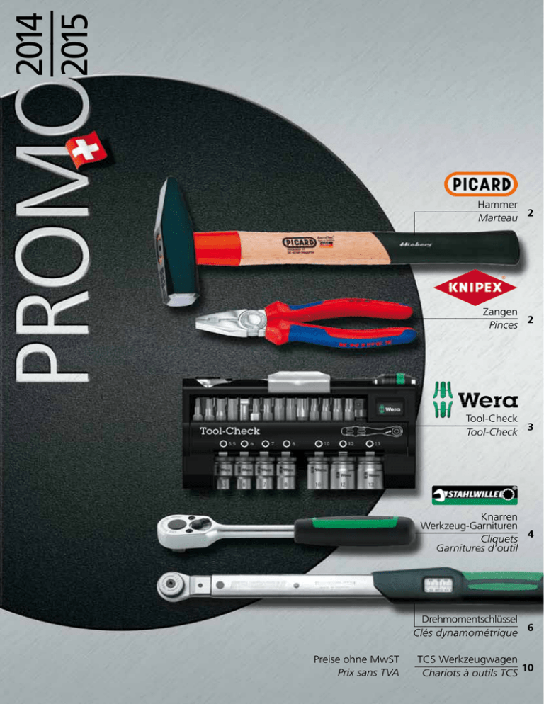 2014 —— 2015 Hammer —————————— 2 Marteau Zangen —————————— 2 Pinces Tool-Check —————————— 3 Tool-Check Knarren Werkzeug-Garnituren —————————— 4 Cliquets Garnitures d’outil Drehmomentschlüssel —————————— 6 Clés dynamométrique Preise ohne MwST Prix sans TVA TCS Werkzeugwagen —————————— 10 Chariots à outils TCS Art-Nr. / No art. Action Fr. 12HS- 200G 12HS- 300G 12HS- 400G 12HS- 500G 12HS- 600G 12HS- 800G 12HS-1000G 12HS-1500G 12HS-2000G 18.40 19.60 21.70 23.20 27.50 31.00 36.50 46.70 59.50 12HS Liste Fr. Sicherheitshammer SecuTec® mit Hickorystiel und Stielschutzhülse, Sicherung gegen wegfliegende Hammerköpfe durch Keilschraube mit Scheibenkopf 25.20 26.80 29.70 31.80 37.70 42.40 50.00 64.00 81.50 Marteau de sûreté SecuTec® avec manche en hickory et douille de protection, une vis à coin spéciale placée dans le manche empêche la tête de se détacher 12 42 195 KNIPEX MultiStrip 10, automatische Abisolierzange passt sich selbsttätig den verschiedenen Leiterquer schnitten an : dadurch keine Beschädigung der Leiter Liste : Fr. 144.– Fr. 105.– ————————————————————————————————————— KNIPEX MultiStrip 10, Pince à dénuder automatique s’adapte automatiquement aux différentes sections de fils : grâce à cela aucun dommage aux conducteurs 0.0310.0 mm2 97 53 04 Selbsteinstellende Crimpzange für Aderendhülsen, mit Seiteneinführung gleichbleibend hohe Crimpqualität durch Zwangssperre ; Kraftverstärkung durch Kniehebel Liste : Fr. 268.– Fr. 196.– ——————————————————————————————————— Pince à sertir auto-ajustable pour embouts de câble, avec accès latéral qualité de sertissage toujours élevée grâce au blocage forcé ; force amplifiée grâce à la démultiplication par genouillère 002004SB Liste : Fr. 233.– Fr. 170.– ————————————–——————————— 4811-J1; 4811-J2 4821-J11; 4821-J21 4911-A1; 4911-A2 4921-A11; 4921-A21 Liste : Fr. 126.– Fr. 92.– 002011S2 ———————————————————————– 0305-180 mm 2615-200 mm 7405-180 mm 002011S4 2 Hammer · Zangen / Marteau · pinces Liste : Fr. 174.– Fr. 127.– —————————————————————————————————— 0305-180 mm 2615-200 mm 2625-200 mm 7405-180 mm P r e i s e n etto P r i x n et 0.08-10 + 16 mm2 BC 30 UNIVERSAL 889/4/1K - 1/4’’x 50 1.0 x 5.5 3; 4; 5; 6; 8 PH 2 x 1; 3 x 2; 1 x 3 PZ 2 x 1; 3 x 2; 1 x 3 TX 10; 15; 20; 25; 30; 40 Liste : Fr. 59.50 TXBO 10; 15; 20; 25; 30 ——————————————————————————————————— Fr. 40.– TOOL-CHECK 8001A - 1/4’’x 87 889/4/1K - 1/4’’x 50 870/1 - 1/4’’x 25 1.0 x 5.5 3; 4; 5; 6; 8 PH 2 x 1; 3 x 2; 1 x 3 PZ 1 x 1; 3 x 2; 1 x 3 TX 10; 15; 20; 25; 30; 40 TXBO 10; 15; 20; 25; 30 Liste : Fr. 132.– 5.5; 6; 7; 8; 10; 12; 13 mm —————————————————————————————————— Fr. 88.– JOKER SET 4 TLG Liste : Fr. 164.– 10; 13; 17; 19 mm ————————————————————————————————————————————————————— Fr. 110.– JOKER SET 11 TLG 8; 10; 11; 12; 13; 14; Liste : Fr. 452.– 15; 16; 17; 18; 19 mm ———————————————————————————————————————————————————— Fr. 303.– 10/9CH 6 x 7; 8 x 9; 10 x 11; 12 x 13; 14 x 15; 16 x 17; 18 x 19; Liste : Fr. 107.– 20 x 22; 24 x 27———————————————————————————————————————————— mm Fr. 80.– 13/16CH 13 - 6; 7; 8; 9; 10; 11; 12; 13; 14; 15; 16; 17; 19; 22; Liste : Fr. 315.– 24; 27 mm ———————————————————————————————————————————— Fr. 227.– P r e i s e n etto P r i x n et Bit-Check · Schlüssel / Bit-Check · clés 3 Liste : Fr. 79.– ———————————–—————————————————————————————————— Fr. 57.– Liste : Fr. 91.– ———————————–—————————————————————————————————— Fr. 65.50 Liste : Fr. 100.– ———————————–—————————————————————————————————— Fr. 72.– 415CH 435CH 512CH 40/9/4CH Liste : Fr. 240.– Fr. 173.– ———————————–——————————————————————————— 40 - 5.5; 6; 7; 8; 9; 10; 11; 12; 13 mm 405-2”, 405-6” 407 415CH 1/4”-29TLG 40 - 5; 5.5; 6; 7; 8; 9; 10; 11; 12; 13; 14 mm 44K -3; 4; 5; 6; 8 mm 44KTX -T8; T9; T10; T15; T20; T25; T30 400 404 405-2”, 405-6” 407 Liste : Fr. 454.– 415CH ———————————————————————–———————–—————————— Fr. 327.– 456/13/5CH Liste : Fr. 392.– Fr. 282.– —————————————————————————————————— 456 - 8; 9; 10; 11; 12; 13; 14; 15; 16; 17; 18; 19; 22 mm 427-3”, 427-6”, 427-10” 428 435CH 3/8”-28TLG Liste : Fr. 508.– Fr. 366.– ————————————————————————————————– 456 - 8; 9; 10; 11; 12; 13; 14; 15; 16; 17; 18; 19 mm 49 - 5; 6; 8 mm 442 1414-1420 - T10; T15; T20; T25; T27; T30; T40 427-3”, 427-6”, 427-10” 428 435CH 52/18/5CH 4 Liste : Fr. 508.– Fr. 366.– —————