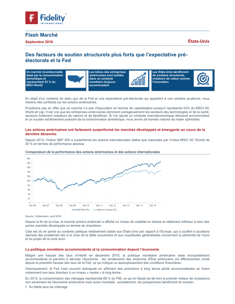 Flash Marché États-Unis Septembre 2016 Des facteurs de soutien structurels plus forts que l’expectative préélectorale et la Fed Un marché incontournable dopé par la consommation domestique et représentant 53 % du MSCI World Les bilans des entreprises américaines sont solides dans un contexte monétaire toujours accommodant Les Etats-Unis bénéficient de soutiens structurels, créateurs de valeur comme l’innovation En dépit d’un contexte de statu quo de la Fed et une expectative pré-électorale qui appellent à une certaine prudence, nous restons très confiants sur les actions américaines. N’oublions pas en effet que ce marché n’a pas d’équivalent en termes de capitalisation puisqu’il représente 53% du MSCI AC World all cap. Il est vrai que les entreprises américaines dominent outrageusement les secteurs des technologies et de la santé, secteurs fortement créateurs de valeurs et de bénéfices. Si l’on ajoute un contexte macroéconomique demeuré accommodant et un soutien extrêmement puissant de la consommation domestique, nous avons de bonnes raisons de rester optimistes. Les actions américaines ont fortement surperformé les marchés développés et émergents au cours de la dernière décennie. Depuis 2013, l’indice S&P 500 a surperformé les actions internationales (telles que mesurées par l’indice MSCI AC World) de 30 % en termes de performance absolue. Comparaison de la performance des actions américaines et des actions internationales Source : Datastream, août 2016 Depuis la fin de la crise, le marché actions américain a affiché un niveau de volatilité en baisse et nettement inférieur à celui des autres marchés développés en termes de drawdown. Cela est dû en partie au contexte politique relativement stable aux États-Unis par rapport à l’Europe, qui a souffert à plusieurs reprises des problèmes liés à la crise de la dette souveraine et aux inquiétudes généralisées concernant la pérennité de l’euro et du projet de la zone euro. La politique monétaire accommodante et la consommation dopent l’économie Malgré une hausse des taux d’intérêt en décembre 2015, la politique monétaire américaine reste incroyablement accommodante et parvient à stimuler l’économie - les rendements des emprunts d'État américains ont effectivement chuté depuis la première hausse des taux de la Fed, ce qui indique un assouplissement des conditions financières. Historiquement, la Fed s'est souvent distinguée en affichant des prévisions à long terme plutôt accommodantes en fixant notamment son taux directeur à un niveau « neutre » à long terme. En 2015, la consommation des ménages représentait 68 % du PIB, ce qui en faisait (et de loin) le premier moteur de croissance, non seulement de l’économie américaine mais aussi mondiale ; actuellement, les perspectives bénéficient du soutien : Du faible taux de chômage Des prix bas de l'énergie De la vigueur du secteur immobilier résidentiel De la hausse des salaires qui s’accélère et s’étend à l’ensemble des secteurs des biens de consommation Taux de chômage aux États-Unis (%) Revenu horaire réel moyen aux États-Unis ($/h) 11 10.9 Le taux de chômage actuel aux États-Unis (4,9 %) est bien inférieur sa moyenne sur 35 ans, qui culmine à 6,4 % (représentée par la ligne en pointillé) 10 9 Après une période prolongée de stagnation, les salaires réels repartent à la hausse aux États-Unis 10.7 10.5 8 10.3 7 10.1 6 9.9 5 9.7 4 2008 2008 2009 2010 2011 2012 2013 2014 2015 2016 9.5 2008 2009 2010 2011 2012 2013 2014 2015 2016 US unemployment rate… (ajusté des variations Taux de chômage aux États-Unis saisonnières) en % Les taux d’intérêt bas et les mesures d’assouplissement quantitatif ont dopé les prix des actions et des obligations, mais leur impact sur l’économie réelle reste à démontrer. Étant donné que pour la plupart des observateurs, la politique monétaire est proche d’avoir atteint ses limites, il est probable que le prochain levier sera celui de la relance budgétaire, et notamment des dépenses d’infrastructures. Les inquiétudes concernant le déficit croissant du secteur des infrastructures, le montant actuel des dépenses publiques d’équipement aux États-Unis (à son niveau le plus bas depuis 60 ans) et les coûts de financement toujours très bas plaident en faveur de cette hypothèse. Les actions américaines affichent des valorisations supérieures à la moyenne, mais les entreprises bénéficient de bilans solides Si les actions américaines présentent des mesures supérieures à la moyenne pour la plupart d’entre elles (ratio cours/bénéfices, ratio cours/valeur comptable, ...), elles restent bon marché par rapport aux emprunts d'État américains. Ce constat est évident lorsque l’on compare le rendement des bénéfices sur le marché actions américain * au rendement des emprunts d'État à 10 ans – l’écart entre les deux est actuellement de 3,3 %, ce qui est largement supérieur à la moyenne sur 30 ans (0,3 %). Endettement net et flux de trésorerie par action (%) 45 1200 40 1000 35 800 30 25 600 20 400 15 10 200 5 0 1998 1999 2000 2001 2002 2003 2004 2005 2006 2007 2008 2009 2010 2011 2012 2013 2014 2015 2016 Dette/actifs (LHS) Debt/Assets (éch. de gauche) FluxDebt/Share de trésorerie par action Net (RHS) (éch. de droite) 0 Detteflow/Share nette par action Cash (RHS) (éch. de droite) Source : Bloomberg, 31 juillet 2016 Les entreprises américaines affichent des bilans solides et un endettement net (soit l’endettement total moins la trésorerie disponible) largement au-dessous des niveaux antérieurs à la crise Cela s’explique principalement par la croissance significative de leurs réserves de trésorerie, comme en témoigne le total des liquidités détenues par Apple, Microsoft et Alphabet (1 680 milliards de dollars fin 2015). Dans l’ensemble, les entreprises ont enregistr
