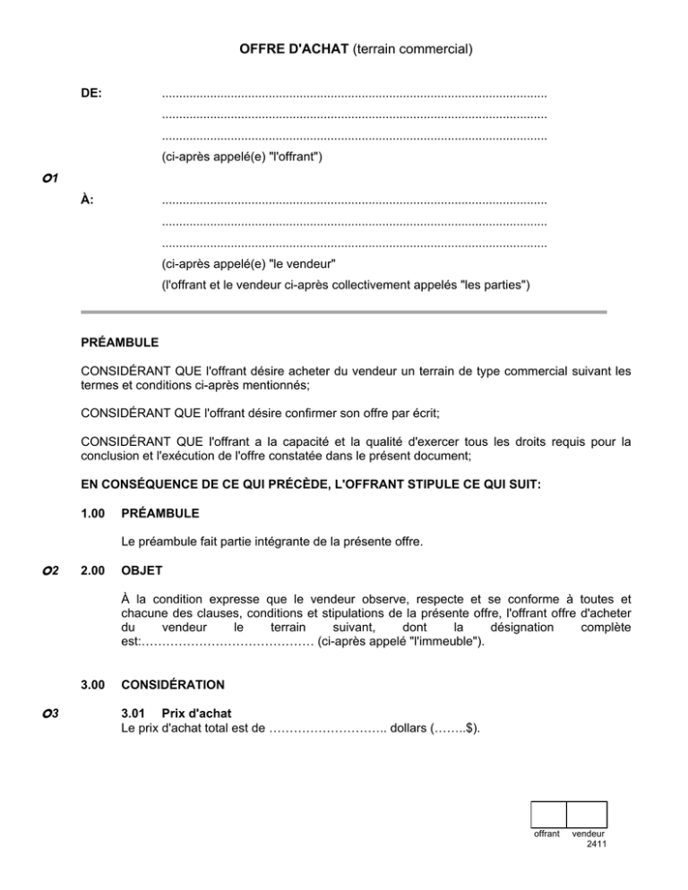 OFFRE D'ACHAT (terrain commercial) DE: ................................................................................................................ ................................................................................................................ ................................................................................................................ (ci-après appelé(e) "l'offrant") !1 À: ................................................................................................................ ................................................................................................................ ................................................................................................................ (ci-après appelé(e) "le vendeur" (l'offrant et le vendeur ci-après collectivement appelés "les parties") PRÉAMBULE CONSIDÉRANT QUE l'offrant désire acheter du vendeur un terrain de type commercial suivant les termes et conditions ci-après mentionnés; CONSIDÉRANT QUE l'offrant désire confirmer son offre par écrit; CONSIDÉRANT QUE l'offrant a la capacité et la qualité d'exercer tous les droits requis pour la conclusion et l'exécution de l'offre constatée dans le présent document; EN CONSÉQUENCE DE CE QUI PRÉCÈDE, L'OFFRANT STIPULE CE QUI SUIT: 1.00 PRÉAMBULE Le préambule fait partie intégrante de la présente offre. !2 2.00 OBJET À la condition expresse que le vendeur observe, respecte et se conforme à toutes et chacune des clauses, conditions et stipulations de la présente offre, l'offrant offre d'acheter du vendeur le terrain suivant, dont la désignation complète est:…………………………………… (ci-après appelé "l'immeuble"). 3.00 !3 CONSIDÉRATION 3.01 Prix d'achat Le prix d'achat total est de ……………………….. dollars (……..$). offrant vendeur 2411 -2!4 3.02 Modalités de paiement Ledit prix d'achat est payable de la façon suivante: a) Dépôt initial À titre de dépôt initial devant valoir sur le prix d'achat, l'offrant remet avec cette offre un chèque émis à l'ordre de ……………………., notaire (ci-après appelé "le notaire instrumentant") en fiducie, au montant de ……………………….. dollars (……..$), lequel chèque sera encaissé si la présente offre est acceptée par le vendeur. ………..$ b) Assumation de la(des) hypothèque(s) existante(s) L'offrant doit assumer, pour et à l'acquit du vendeur, la ou les hypothèques suivantes: …………………………………………………………………………………………………..… ………$ …………………………………………………………………………………………………..… ………$ …………………………………………………………………………………………………..… ………$ c) Comptant à la signature Lors de la signature du contrat de vente, l'offrant doit verser par chèque visé émis à l'ordre du notaire instrumentant en fiducie, une somme de ….. dollars (……..$). ………$ d) Solde de prix de vente L'offrant doit payer au vendeur le solde de prix de vente au montant de ……………………….. dollars (……..$), portant intérêt au taux de ……………. pour cent (…….%) l'an à compter de la date de signature du contrat de vente, et payable de la façon suivante:……………………… Ce solde de prix de vente peut être payé en tout temps, en tout ou en partie, sans pénalité. De plus, il est garanti par hypothèques et droit de résolution. ………$ !5 TOTAL: 4.00 $ DISPOSITIONS PARTICULIÈRES 4.01 Taxes applicables Le prix d'achat total de l'immeuble comprend toutes les taxes exigibles en vertu de toute loi à caractère fiscal. 4.02 Représentations et garanties du vendeur et conditions En acceptant la présente offre, le vendeur représente et garantit ce qui suit à l'offrant. De plus, il reconnaît que toutes et chacune des représentations et garanties suivantes constituent pour l'offrant des conditions sans lesquelles ce dernier n'aurait pas contracté. Lesdites représentations et garanties doivent aussi être véridiques au moment de la signature du contrat de vente. a) Le vendeur est le seul et unique propriétaire de l'immeuble, par bon et valable titre de propriété; b) Le vendeur a le droit et la capacité de posséder l'immeuble et d'en disposer librement; c) Le vendeur n'est partie à aucun contrat susceptible d'affecter ledit immeuble; d) L'immeuble est libre et clair de toutes hypothèques, réclamations, sûretés, affectations, saisies ou autres charges, de quelque nature que ce soit, pouvant le grever, sauf et excepté: ………………………………, lesquelles seront payées à même le produit de la vente et radiées, ou encore assumées selon ce que ci-haut prévu; e) Les hypothèques que l'offrant offre d'assumer sont transférables et les autorisations écrites des créanciers à cet effet doivent être obtenues par le vendeur offrant vendeur 2411