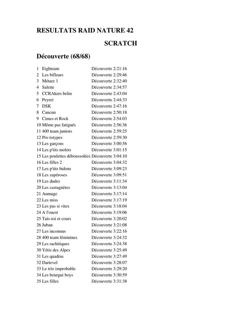 RESULTATS RAID NATURE 42 SCRATCH Découverte (68/68) 1 Eighteam Découverte 2:21:16 2 Les bifleurs Découverte 2:29:46 3 Métare 1 Découverte 2:32:40 4 Salette Découverte 2:34:57 5 CCRAkers belin Découverte 2:43:04 6 Peyret Découverte 2:44:33 7 DSK Découverte 2:47:16 8 Cancun Découverte 2:50:18 9 Cimes et Rock Découverte 2:54:03 10 Même pas fatigués Découverte 2:56:36 11 400 team juniors Découverte 2:59:25 12 Pro totypes Découverte 2:59:30 13 Les garçons Découverte 3:00:56 14 Les p'tits molets Découverte 3:01:15 15 Les poulettes déboussolées Découverte 3:04:10 16 Les filles 2 Découverte 3:04:32 Découverte 3:09:23 17 Les p'tits bidons 18 Les zapéroses Découverte 3:09:51 19 Les dudes Découverte 3:11:34 20 Les castagnètes Découverte 3:13:04 21 Anmage Découverte 3:17:14 22 Les miss Découverte 3:17:19 23 Les pas si vites Découverte 3:18:04 24 A l'ouest Découverte 3:19:06 25 Tais-toi et cours Découverte 3:20:02 26 Juban Découverte 3:21:08 27 Les inconnus Découverte 3:22:16 28 400 team féminines Découverte 3:24:32 29 Les rachitiques Découverte 3:24:38 30 Yétis des Alpes Découverte 3:25:49 31 Les quadras Découverte 3:27:49 32 Dartevel Découverte 3:28:07 33 Le trio improbable Découverte 3:29:20 34 Les bourgui boys Découverte 3:30:59 35 Les filles Découverte 3:31:38 36 Les copains sportifs 37 Baygon 69 38 Tholozan 39 Les M M M 40 Wind rock 41 L'équipe du père foireux 42 Chaminou 43 FMsup - les juniors 44 The beat men 45 FMD team 46 La classe en 7 47 Cancade 48 Bonhour 49 Rahan et les Amazones 50 Les amateurs 51 ESCA 3(00kg) 52 Pallandre 2 53 Les bourgui girls 54 Chervé section sportive 55 Les green lanterns 56 Les pieds nickelés 57 Les désorientées 58 Les cocottes 59 Alvinsan 60 Les 79 Les snake phobe Les tabazus Natilia Becheras Mure UCSG Bi bop et loula Les guerrières Découverte 3:35:57 Découverte 3:37:12 Découverte 3:39:37 Découverte 3:40:25 Découverte 3:40:36 Découverte 3:41:06 Découverte 3:42:33 Découverte 3:43:54 Découverte 3:44:15 Découverte 3:44:32 Découverte 3:48:29 Découverte 3:50:41 Découverte 3:51:16 Découverte 3:54:50 Découverte 3:56:58 Découverte 3:59:34 Découverte 4:01:40 Découverte 4:03:51 Découverte 4:04:49 Découverte 4:05:10 Découverte 4:07:40 Découverte 4:16:21 Découverte 4:17:59 Découverte 4:27:35 Découverte 4:28:29 Découverte PM Découverte PM Découverte PM Découverte PM Découverte Abandon Découverte PM Découverte Disq Découverte PM Sportif (83/83) 1 2 3 4 Team Vibram Lafuma Dédé biquet et kéké Sport nature gargomençois Les ours du Pilat Sportif 4:14:45 Sportif 4:25:29 Sportif 4:26:34 Sportif 4:29:04 5 Les sangliers du Pilat Sportif 4:40:14 6 LIGERAID42-Pouline Sportif 4:45:43 7 Les jus' raidistes de neuchaventure Sportif 4:54:55 8 Couchoud Sportif 5:06:44 9 Meltimpote Sportif 5:10:47 10 ATEA Sportif 5:13:19 Sportif 5:14:19 11 Les machines 12 Les CRRA kens Sportif 5:16:42 Sportif 5:17:29 13 Les suréquipés 14 Genest Raid Sportif 5:17:52 15 Les maris des filles du jeudi Sportif 5:19:06 Sportif 5:20:48 16 Prévert 06 17 Les CRRA terelles Sportif 5:22:57 Sportif 5:24:49 18 Ligéraid-Cantal 19 ESCA1 Sportif 5:31:46 20 Leclerc Sportif 5:36:27 21 Les CRRA poussins Sportif 5:36:40 22 La cabane sur le chien Sportif 5:40:24 23 Team MPH Sportif 5:42:48 24 Les cagueuses Sportif 5:46:48 25 Ligeraid lache les freins Sportif 5:48:47 26 Jolan Team Sportif 5:52:37 27 Richard Sportif 5:54:22 28 Les Raid' ingues Sportif 6:00:59 29 Pallandre Sportif 6:02:49 30 Roesch Sportif 6:03:11 31 Garcia Sportif 6:03:49 32 Les CRRA rolais brionnais Sportif 6:05:56 Sportif 6:11:19 33 Les zoréfiens 34 Endorphine mag Sportif 6:12:45 35 Les ventres sur pattes Sportif 6:16:11 36 VLP 71 Sportif 6:17:54 37 Les fous des guidons Sportif 6:19:03 38 Les citoyens du monde Sportif 6:19:56 39 Les sous Sportif 6:22:57 40 DSBB Sportif 6:24:10 41 CC38 Sportif 6:27:51 42 Les filles du jeudi Sportif 6:29:55 43 Carton Sportif 6:34:26 44 FM sup team 2 Sportif 6:36:28 45 Molo molo Sportif 6:39:07 46 Musique Maclas 47 Prosodie 48 Les douceurs de neuchaventure 49 Les CRRA ssules 50 Les Guenilles 51 Sport Nature Gargomençois 2 52 Le tricycle jaune 53 La crème de Neuchaventure 54 Les slips 55 Team Go Sport 56 Les 3 Tamalous 57 Les chamois 58 Kracboumuh 59 Vago 2 Santos 60 Berthiez 61 CIS Sury le Comtal 62 Les trois petits cochons 63 CC38-2 64 ESCA2 65 Team Tamalou Chamboeuf 42 66 Y'a pas le feu 67 Les jamais cassés 68 Les tapas 69 Les missiles-ligéraid 70 FM sup team 1 Les d'raid loques Les sanpaloune Etilis1 Raidbof Les minis Les autres Alfredur Les boulets Bebamax A la grande No crampes, no problem Les Marcels Le dernier sort les poubelles Sportif 6:41:04 Sportif 6:43:10 Sportif 6:45:01 Sportif 6:45:49 Sportif 6:51:55 Sportif 6:55:03 Sportif 6:59:22 Sportif 7:00:35 Sportif 7:01:42 Sportif 7:04:25 Sportif 7:04:34 Sportif 7:06:23 Sportif 7:07:30 Sportif 7:25:01 Sportif 7:26:58 Sportif 7:34:36 Sportif 7:39:59 Sportif 7:40:11 Sportif 7:49:20 Sportif 7:54:43 Sportif 7:57:27 Sportif 7:58:27 Sportif 8:01:30 Sportif 8:03:39 Sportif 8:03:56 Sportif PM Sportif PM Sportif PM Sportif PM Sportif PM Sportif PM Sportif PM Sportif PM Sportif PM Sportif PM Sportif Abandon Sportif PM Sportif PM PAR CATEGORIES Découverte (68/68) 1 Eighteam Découverte 2:21:16 2 Les bifleurs Découverte 2:29:46 3 Métare 1 Découverte 2:32:40 4 Salette Découverte 2:34:57 5 CCRAkers belin Découverte 2:43:04 6 Peyret Découverte 2:44:33 7 DSK Découverte 2:47:16 8 Cancun Découverte 2:50:18 9 Cimes et Rock Découverte 2:54:03 10 Même pas fatigués Découverte 2:56:36 11 400 team juniors Découverte 2:59:25 12 Pro totypes Découverte 2:59:30 13 Les garçons Découverte 3:00:56 Découverte 3:01:15 14 Les p'tits molets 15 Les poulettes déboussolées Découverte 3:04:10 16 Les filles 2 Découverte 3:04:32 17 Les p'tits bidons Découverte 3:09:23 18 Les zapéroses Découverte 3:09:51 19 Les dudes Découverte 3:11:34 20 Les castagnètes Découverte 3:13:04 Découverte 3:17:14 21 