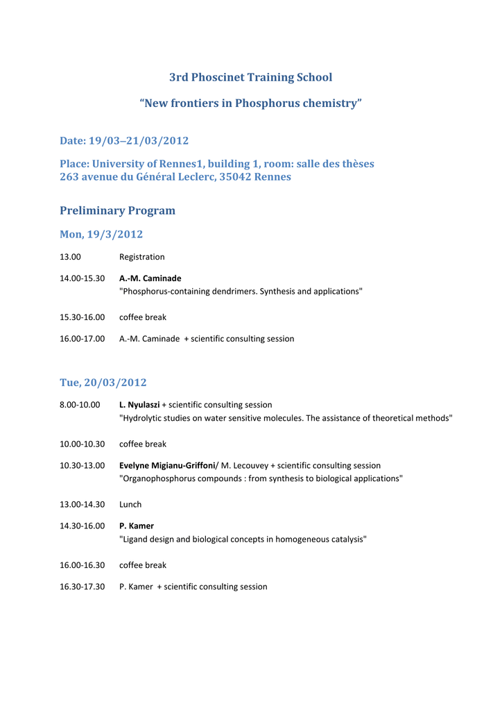 3rd Phoscinet Training School “New frontiers in Phosphorus chemistry” Date: 19/0321/03/2012 Place: University of Rennes1, building 1, room: salle des thèses 263 avenue du Général Leclerc, 35042 Rennes Preliminary Program Mon, 19/3/2012 13.00 Registration 14.00‐15.30 15.30‐16.00 A.‐M. Caminade "Phosphorus‐containing dendrimers. Synthesis and applications" coffee break 16.00‐17.00 A.‐M. Caminade + scientific consulting session Tue, 20/03/2012 8.00‐10.00 10.00‐10.30 L. Nyulaszi + scientific consulting session "Hydrolytic studies on water sensitive molecules. The assistance of theoretical methods" coffee break 10.30‐13.00 13.00‐14.30 Evelyne Migianu‐Griffoni/ M. Lecouvey + scientific consulting session "Organophosphorus compounds : from synthesis to biological applications" 14.30‐16.00 16.00‐16.30 P. Kamer "Ligand design and biological concepts in homogeneous catalysis" 16.30‐17.30 P. Kamer + scientific consulting session Lunch coffee break Wed, 21/03/2012 9.30‐11.00 11.00‐11.30 C. Darcel “Phosphorus and Catalysis“ 11.30‐12.30 C. Darcel + scientific consulting session 12.30‐14.00 Lunch 14.30‐15.30 15.30‐16.00 D. Vogt "Ligands in Homogeneous Catalysis ‐ From Concepts to Applications" 16.00‐17.30 D. Vogt + scientific consulting session coffee break coffee break
