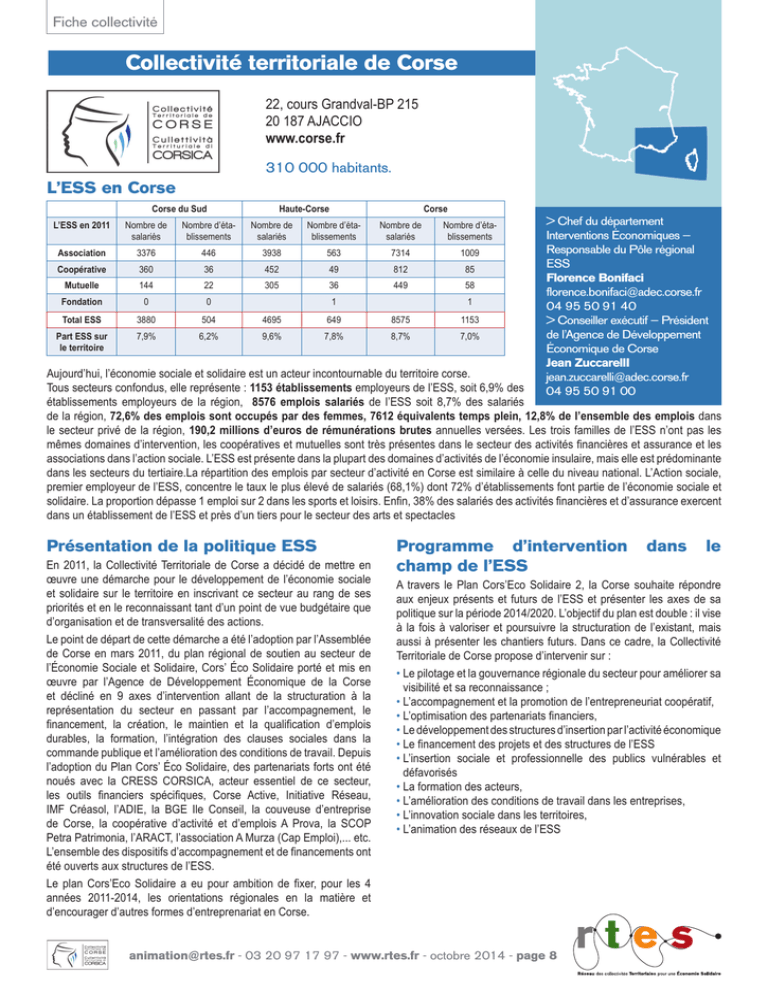 Fiche collectivité Collectivité territoriale de Corse 22, cours Grandval-BP 215 20 187 AJACCIO www.corse.fr 310 000 habitants. L’ESS en Corse Corse du Sud Haute-Corse Corse L’ESS en 2011 Nombre de salariés Nombre d’établissements Nombre de salariés Nombre d’établissements Nombre de salariés Nombre d’établissements Association 3376 446 3938 563 7314 1009 Coopérative 360 36 452 49 812 85 Mutuelle 144 22 305 36 449 58 Fondation 0 0 1 1 Total ESS 3880 504 4695 649 8575 1153 Part ESS sur le territoire 7,9% 6,2% 9,6% 7,8% 8,7% 7,0% > Chef du département Interventions Économiques – Responsable du Pôle régional ESS Florence Bonifaci [email protected] 04 95 50 91 40 > Conseiller exécutif – Président de l’Agence de Développement Économique de Corse Jean ZuccarellI [email protected] 04 95 50 91 00 Aujourd’hui, l’économie sociale et solidaire est un acteur incontournable du territoire corse. Tous secteurs confondus, elle représente : 1153 établissements employeurs de l’ESS, soit 6,9% des établissements employeurs de la région, 8576 emplois salariés de l’ESS soit 8,7% des salariés de la région, 72,6% des emplois sont occupés par des femmes, 7612 équivalents temps plein, 12,8% de l’ensemble des emplois dans le secteur privé de la région, 190,2 millions d’euros de rémunérations brutes annuelles versées. Les trois familles de l’ESS n’ont pas les mêmes domaines d’intervention, les coopératives et mutuelles sont très présentes dans le secteur des activités financières et assurance et les associations dans l’action sociale. L’ESS est présente dans la plupart des domaines d’activités de l’économie insulaire, mais elle est prédominante dans les secteurs du tertiaire.La répartition des emplois par secteur d’activité en Corse est similaire à celle du niveau national. L’Action sociale, premier employeur de l’ESS, concentre le taux le plus élevé de salariés (68,1%) dont 72% d’établissements font partie de l’économie sociale et solidaire. La proportion dépasse 1 emploi sur 2 dans les sports et loisirs. Enfin, 38% des salariés des activités financières et d’assurance exercent dans un établissement de l’ESS et près d’un tiers pour le secteur des arts et spectacles Présentation de la politique ESS En 2011, la Collectivité Territoriale de Corse a décidé de mettre en œuvre une démarche pour le développement de l’économie sociale et solidaire sur le territoire en inscrivant ce secteur au rang de ses priorités et en le reconnaissant tant d’un point de vue budgétaire que d’organisation et de transversalité des actions. Le point de départ de cette démarche a été l’adoption par l’Assemblée de Corse en mars 2011, du plan régional de soutien au secteur de l’Économie Sociale et Solidaire, Cors’ Éco Solidaire porté et mis en œuvre par l’Agence de Développement Économique de la Corse et décliné en 9 axes d’intervention allant de la structuration à la représentation du secteur en passant par l’accompagnement, le financement, la création, le maintien et la qualification d’emplois durables, la formation, l’intégration des clauses sociales dans la commande publique et l’amélioration des conditions de travail. Depuis l’adoption du Plan Cors’ Éco Solidaire, des partenariats forts ont été noués avec la CRESS CORSICA, acteur essentiel de ce secteur, les outils financiers spécifiques, Corse Active, Initiative Réseau, IMF Créasol, l’ADIE, la BGE Ile Conseil, la couveuse d’entreprise de Corse, la coopérative d’activité et d’emplois A Prova, la SCOP Petra Patrimonia, l’ARACT, l’association A Murza (Cap Emploi),... etc. L’ensemble des dispositifs d’accompagnement et de financements ont été ouverts aux structures de l’ESS. Le plan Cors’Eco Solidaire a eu pour ambition de fixer, pour les 4 années 2011-2014, les orientations régionales en la matière et d’encourager d’autres formes d’entreprenariat en Corse. Programme d’intervention champ de l’ESS dans le A travers le Plan Cors’Eco Solidaire 2, la Corse souhaite répondre aux enjeux présents et futurs de l’ESS et présenter les axes de sa politique sur la période 2014/2020. L’objectif du plan est double : il vise à la fois à valoriser et poursuivre la structuration de l’existant, mais aussi à présenter les chantiers futurs. Dans ce cadre, la Collectivité Territoriale de Corse propose d’intervenir sur : • Le pilotage et la gouvernance régionale du secteur pour améliorer sa visibilité et sa reconnaissance ; • L’accompagnement et la promotion de l’entrepreneuriat coopératif, • L’optimisation des partenariats financiers, • Le développement des structures d’insertion par l’activité économique • Le financement des projets et des structures de l’ESS • L’insertion sociale et professionnelle des publics vulnérables et défavorisés • La formation des acteurs, • L’amélioration des conditions de travail dans les entreprises, • L’innovation sociale dans les territoires, • L’animation des réseaux de l’ESS [email protected] - 03 20 97 17 97 - www.rtes.fr - octobre 2014 - page 8