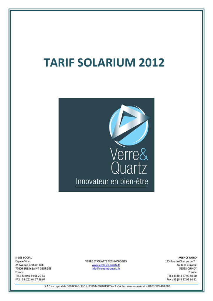 TARIF SOLARIUM 2012 R R* HP 40 0W . 25 W W R Tu be s 18 0 W R Tu be s 16 0 W R Tu be s 12 0 W R 10 0 W 80 Tu be s Tu be s Tu be s *Longueur 2mètres **Longueur 1,90mètre Tubes et émetteurs MAXLIGHT ONYX 28/1 solarium ONYX ROUGE ou BRONZE 4 PRO-LINE ROUGE BRONZE PEARL WHITE 10** 14 4 413,24 4 390,00 4 790,00 5 130,84 5 609,24 6 28 119,00 399,00 289,00 24 1 30 32 Sli 18 32 SLi Intensive 9 14 14 18 34 SLi 34 16 18 34 16 18 6 090,00 7 044,44 7 522,84 139,00 699,00 65,00 65,00 199,00 289,00 166,24 586,04 77,74 77,74 238,00 345,64 3 7 690,00 9 197,24 3 8 190,00 9 795,24 3 8 490,00 10 154,04 7 390,00 8 838,44 999,00 499,00 119,00 1 399,00 149,00 199,00 540,00 599,00 1 590,00 289,00 150,00 290,00 1 194,80 596,80 142,32 1 673,20 178,20 238,00 645,84 716,40 1 901,64 345,64 179,40 346,84 1 499,00 350,00 1 690,00 1 199,00 1 792,80 418,60 2 021,24 1 434,00 11 - Air conditionné X5 - Réflecteurs pour épaules X5 - Supplément pour Plexi ergonomique(option impérative avec la clim) X5 - Equipement audio (sauf ▲)X5 X7 - Audio Package (réflecteurs épaules, équipt audio, menu vocal) X5 - Exclusive package(réflect.épaules,plexi ergo,équipt audio,LED,Qsens et Xsens) X5 - SUNTIMER Commande à distance électronique (hors cable) X5 X7 - Kit d'évacuation d'air (gaine + 2 plaques pour fixation au mur) X5 X7 - Kit de liaison d'évacuation d'air 2* Diam 180 mm = 1*diam 300mm X5 X7 Supplement de prix pour autres couleurs NOUS CONSULTER - Air conditionné X7 - Commande IP Control X7 - WELLNESS Package (Qsens,equipt audio, menu vocal et Xsens) X7 - WELLNESS Package 42 SLI (Qsens, menu vocal et Xsens) 38 SLi 38 16 38 SLi HIGH. Intensive 3 8 990,00 10 752,04 22 3 9 490,00 11 350,04 38 3 38 SLi IP Control X7 40 SPr 40 40 SPr Intensive 18 40 SPr HIGH Intensive ORANGE VERT TENDRE BLEU NUIT 42 SLi ▲ 42 SLi Intensive ▲ 42 SLi HIGH Intensive ▲ 42 SLi IP Control 24 11 708,84 14 088,88 23 8 990,00 10 752,04 23 9 490,00 11 350,04 40 23 24 24 9 790,00 11 780,00 22 18 18 6 326,84 6 685,64 6 490,00 OPTIONS POUR X5 ET X7 - Qsens (diffuseur de brume) X5 X7 - Xsens (diffuseur d'arômes au choix : exotic, citrus, ocean) X5 X7 - Eclairage décoratif par LED des ventilateurs X5 38 SLi Intensive 5 290,00 5 590,00 3 - Bandeau lumineux+équipement audio avec connection Mp3 - Kit évacuation d'air (enjoliveur et 6m de gaine diam 180mm) - Panneau arrière/lit - Ventilateur de tête - SUNTIMER Commande à distance électronique (hors cable) 34 SLi Intensive 142,32 477,20 345,64 3 OPTIONS - Bandeau de liaison entre lit et plafonnier de couleur gris 34 SPr BLEU NUIT ORANGE 4 174,04 3 690,00 34 SLi HIGH. Intensive X5 3 590,00 28/1 solarium ONYX PEARL WHITE 30 SLi BLEU LAGON ROSE FUSCHIA PEARL WHITE P.U. TTC (€) 28V cabine verticale ROUGE ou BRONZE 28 28V Intensive ROUGE OPTIONS - Ventilateur supplémentaire pour cabine verticale ONYX - Plafond avec ventilateur et haut parleur pour cabine verticale ONYX - SUNTIMER commande à distance électronique (hors cable) 30 SPr X3 II 1 P.U. HT (€) 18 9 790,00 11 708,84 4 10 490,00 12 546,04 4 10 990,00 13 144,04 4 11 490,00 13 742,04 13 740,00 16 433,04 18 Tubes à puissance variable 80W à 180W* 24 Tubes à puissance variable 80W à 180W Tu be s8 0W R Tu be s1 00 W Tu R be s1 20 W Tu R* be s1 40 W Tu R be s1 60 W Tu R be s1 80 W Tu R* be s1 20 W Tu R LC be * s1 80 W La R LC m pe * sH -P 40 La 0W m pe sH -P 52 0W Tubes et émetteurs MAXLIGHT X10 CRYSTAL WHITE 46 Sli 46 Sli Intensive 46 Sli HIGH Intensive 46 Sli IP Control 52 Sli 52 Sli Intensive 52 Sli HIGH Intensive - 26 - 20 20 - - 26 26 20 - - - - 30 30 - 22 22 - - 30 22 - - - 22 Tubes à puissance variable de 80WR à 180WR* 30 Tubes à puissance variable de 80WR à 180WR 52 Sli IP Control 4 4 4 4 4 4 4 *Longueur 2mètres P.U. HT (€) P.U. TTC (€) 18 990,00 22 712,04 19 490,00 23 310,04 19 990,00 23 908,04 21 740,00 26 001,04 20 490,00 24 506,04 20 990,00 25 104,04 21 490,00 25 702,04 4 23 240,00 27 795,04 4 4 4 4 4 4 4 20 740,00 21 240,00 21 740,00 23 990,00 22 240,00 22 740,00 23 240,00 24 805,04 25 403,04 26 001,04 28 692,04 26 599,04 27 197,04 27 795,04 4 25 490,00 30 486,04 289,00 540,00 690,00 350,00 1 599,00 490,00 690,00 1 299,00 369,00 299,00 449,00 799,00 1 890,00 345,64 645,84 825,24 418,60 1 912,40 586,04 825,24 1 553,60 441,32 357,60 537,00 955,60 2 260,44 ADMORESPHERE 46 Sli 46 Sli Intensive 46 Sli HIGH Intensive 46 Sli IP Control 52 Sli 52 Sli Intensive 52 Sli HIGH Intensive - 26 - 20 20 - - 26 26 20 - - - - 30 30 - 22 22 - - 30 22 - - - 52 Sli IP Control SUPPLEMENT DE PRIX POUR COULEUR PEARL WHITE ARTIC BLUE 490,00 € V5 ORANGE VERT TENDRE SUPPLEMENT DE PRIX POUR COULEUR PEARL WHITE = 290,00€ V7 ETERNAL BLUE DEEP YELLOW VERT TENDRE SUPPLEMENT DE PRIX POUR COULEUR PEARL WHITE = 290,00€ EDIT.GLAMOUR=490,00€ OPTIONS : - SUNTIMER Commande à distance électronique (hors cable) option IMPERATIVE - Equipement audio BASIC - Equipement audio PLUS - Commande IP Control - Air conditionné - Xsens I (Diffuseur d'arômes 1 parfum au choix : OCEAN- FLEURI- EPICE) - Xsens II (Diffuseur d'arômes 3 parfums OCEAN- FLEURI- EPICE) - Qsens (diffuseur de brume) - Sli Plus pour 46 sli (dispositif de réfléchissement) - Compact Air exhaust - Tour extraction d'air - Tour extraction d'air avec retour air chaud - Wellness package : Qsens , Equipement audio PLUS et Xsens III - Exclusive Package : Tour extraction d'air avec retour air chaud, air conditionné, Qsens, Equipement audio plus et Xsens III 42 XL 42 42 XL Intensive 42 42 XLc 42 42 XLc Intensive 42 OPTIONS : - AudiO + MP3 incl.haut parleur - Set de 2 Hauts Parleurs - Xsens, audio + MP3 incl.haut parleur - Qsens, audio + MP3 incl.haut parleur - Wellness package : Hauts parleurs,Qsens , Xsens, connectique MP3 - Cabine de déshabillage couleur identique au solarium (supplément de 290,00€ pour la couleur PEARL WHITE) 48 XL 48 48 XL High Intensive 48 48 XLc 48 48 XLc High Intensive 48 OPTIONS : - AudiO + MP3 - Xsens , Audio + MP3 - Qsens , Audio + MP3 - Plate forme vibrapla
