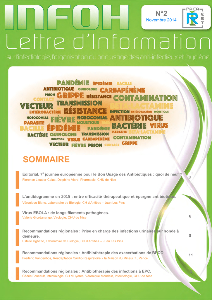 N°2 Novembre 2014 SOMMAIRE Editorial. 7e journée européenne pour le Bon Usage des Antibiotiques : quoi de neuf ? Florence Lieutier-Colas, Delphine Viard, Pharmacie, CHU de Nice 2 L’antibiogramme en 2015 : entre efficacité thérapeutique et épargne antibiotique. 3 Véronique Blanc. Laboratoire de Biologie, CH d’Antibes – Juan Les Pins Virus EBOLA : de longs filaments pathogènes. Valérie Giordanengo, Virologie, CHU de Nice 6 Recommandations régionales : Prise en charge des infections urinaires sur sonde à demeure. 8 Recommandations régionales : Antibiothérapie des exacerbations de BPCO Frédéric Vandenbos, Réadaptation Cardio-Respiratoire « la Maison du Mineur », Vence 11 Recommandations régionales : Antibiothérapie des infections à EPC. 13 Estelle Ughetto, Laboratoire de Biologie, CH d’Antibes – Juan Les Pins Cédric Foucault, Infectiologie, CH d’Hyères, Véronique Mondain, Infectiologie, CHU de Nice 1 Editorial. 7eme journée européenne pour le Bon Usage des antibiotiques : quoi de neuf ? Florence Lieutier-Colas, Delphine Viard Pôle Pharmacie, CHU de Nice La première Journée Européenne pour le Bon Usage des antibiotiques s’est tenue le 18 novembre 2008. Depuis, en France comme en Europe, de nombreuses actions ont été entreprises pour lutter contre le développement des résistances aux antibiotiques. En France, sous l’égide du Ministère des Affaires Sociales, de la Santé et des Droits des Femmes, le 3ème « Plan national d’alerte sur les antibiotiques » visant à la juste utilisation des antibiotiques a été mis en place pour la période 2011-2016. Du fait de l’augmentation des impasses thérapeutiques constituant une menace de santé publique majeure, ce troisième plan se veut plus « stringent », d’autant plus que la consommation antibiotique en France reste d’un niveau bien supérieur à la moyenne européenne. Par conséquent, un des objectifs de ce Plan est la réduction de 25% des consommations d’ici 2016, notamment en ambulatoire. Le dernier rapport de l’ANSM, publié en novembre 2014, sur l’évolution des consommations d’antibiotiques en France entre 2000 et 2013, montre que la consommation globale a diminué de 10,7% entre 2000 et 2013. Cependant une augmentation de 5,9% est observée depuis 2010. Il existe une progression significative des molécules associées à l’émergence de la résistance, notamment céphalosporines de 3ème génération et amoxicilline/acide clavulanique. En 2013 la durée moyenne de traitement, toutes causes confondues, est de 9,2 jours, alors que la plupart des durées d’antibiothérapies recommandées ont baissé d’au moins 30% ces 20 dernières années. Ainsi le score ICATB-2 (Indice Composite du bon usage AnTiBiotique) inclut maintenant la justification de l’antibiothérapie au-delà de 7 jours. A l’hôpital, la consommation française se situe désormais dans la moyenne européenne. Les pénicillines restent les antibiotiques les plus utilisés (57% en 2013), les quinolones sont à la baisse (-20,9% entre 2000 et 2013), mais une progression notable de la consommation des carbapénèmes est observée (+144% entre 2000 et 2013). Des disparités régionales, mais aussi bien sûr entre médecine hospitalière et médecine ambulatoire avaient déjà été montrées dans de précédents rapports. Ainsi les actions nationales et régionales entreprises pour parvenir à une plus juste utilisation des antibiotiques restent des priorités de Santé Publique, comme par exemple la constitution d’un groupe de travail sur la politique de bon usage des antibiotiques en région PACA à l’initiative de l’OMEDIT PACA Corse, en collaboration avec l’ARLIN et le soutien de l’ARS en juillet 2014. La connaissance de la consommation en antibiotiques et de la résistance bactérienne à l’échelle des établissements de santé est un préalable indispensable à l’optimisation des consensus internes d’antibiothérapie probabilistes (obligatoires selon ICATB-2). L’outil web CONSORES développé par le CHU de Nancy et le CCLIN-Est permet de suivre et d’analyser les consommations et résistances à l’échelle de nos services. Suite à la présentation de cet outil en janvier 2014 dans le cadre de notre Réso Infectio, Antibes, Brignoles, Cannes, Draguignan, Grasse, Nice et d’autres établissements privés utilisent (ou s’apprêtent à utiliser) CONSORES. Une seconde réunion aura lieu début 2015 afin d’analyser les tendances régionales. La mise en commun d’outils au sein de notre Réseau Régional (Consores, liste commune d’antibiotiques ciblés, homogénéisation des consensus antibiotiques, audits régionaux de prise en charge des infections) est une opportunité pour nos patients et les praticiens d’aller ensemble vers la « juste utilisation » des antibiotiques. A terme, le site internet du Réso www.reso-infectio.fr mettra ces documents à disposition pour l’ensemble des praticiens de notre région. 2 L’antibiogramme en 2015 : entre efficacité thérapeutique et épargne antibiotique Véronique Blanc Laboratoire de Biologie, CH d’Antibes – Juan Les Pins Résistance bactérienne : velles stratégies ? de nou- La lutte contre la résistance bactérienne est une préoccupation majeure de Santé Publique. Elle repose sur 2 piliers : la prévention de la diffusion via les mesures d’hygiène et l’usage raisonné des antibiotiques. La Politique Nationale du Bon Usage des Antibiotiques nous a incités, depuis plusieurs années déjà, à en contrôler la prescription pour en diminuer la pression de sélection, impliquant ainsi très directement les Infectiologues et les Pharmaciens. Malgré l’implication de tous, la consommation antibiotique, en particulier des antibiotiques dits « de réserve » tels que les carbapénèmes, est restée excessive, et même augmente, et parallèlement, nous avons assisté à l’émergence de bactéries hautement résista