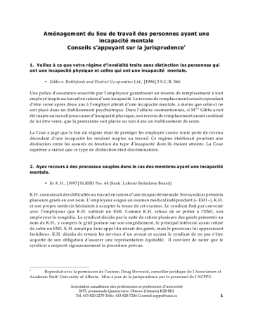 Aménagement du lieu de travail des personnes ayant une incapacité mentale Conseils s’appuyant sur la jurisprudence1 1. Veillez à ce que votre régime d’invalidité traite sans distinction les personnes qui ont une incapacité physique et celles qui ont une incapacité mentale. • Gibbs v. Battlefords and District Co-operative Ltd., [1996] 3 S.C.R. 566 Une police d’assurance souscrite par l’employeur garantissait un revenu de remplacement à tout employé inapte au travail en raison d’une incapacité. Le revenu de remplacement cessait cependant d’être versé après deux ans à l’employé atteint d’une incapacité mentale, à moins que celui-ci ne soit placé dans un établissem ent psy chiatrique. Dans l’affaire susmentionnée, si M me Gibbs avait été inapte au travail pour cause d’incapacité physique, son revenu de remplacement aurait continué de lui être versé, que la prestataire soit placée ou non d ans un établissement de soins. La Cour a jugé que le but du régime était de protéger les employés contre toute perte de revenu découlant d’une incap acité les rendant inap tes au travail. Ce régime établissait pourtant une distinction entre les assurés en fon ction du type d’incapacité dont ils étaient atteints. La Cour suprême a statué que ce type de distinction était discriminatoire. 2. Ayez recours à des processus souples dans le cas des me mbres ayant une incapacité mentale. • Re K .H., [1997] SLRBD No. 44 (Sask. Labour Relations Board) K.H. connaissait des difficultés au travail en raison d’une incapa cité mentale. So n syn dicat présenta plusieurs griefs en son nom. L’employeur exigea un examen médical indé pendant (« EMI »). K.H. et son p ropre médecin hésitaient à accepter la tenue de cet examen. Le syndicat finit p ar convenir avec l’employeur que K.H. subirait un EMI. Comm e K.H. refusa de se prêter à l’EM I, son employeur le congédia. Le syndicat décida par la suite de retirer plusieurs des griefs présentés au nom de K.H., y compris le grief portant sur son congédiement, le principal intéressé ayant refusé de subir un EM I. K.H. aurait pu faire appel du retrait des griefs, mais le pro cessus lui apparaissait fastidieux. K.H . décida de retenir les services d’un avocat et accusa le syndicat de n e pas s’être acquitté de son obligation d’assurer une représentation équitable. Il convient de noter que le syndicat a respecté rigoureusement la procédure prévue. 1 Reproduit avec la permission de l’auteur, Doug Dorward, conseiller juridique de l’Association of Academic Staff: University of Alberta. Mise à jour de la jurisprudence par le personnel de l’ACPPU. Association canadienne des professeures et professeurs d’université 2675, promenade Queensview, Ottawa (Ontario) K2B 8K2 Tél. 613-820-2270 Téléc. 613-820-7244 Courriel [email protected] 1 Bulletin de l’ACPP U - octobre 2006 La Comm ission des relation s de tra vail jugea que le synd icat avait fait preuve de discrimination à l’endroit de K.H . et ne s’était donc pas a cquitté adéquatem ent de so n devo ir de représentation équitable, concluant ce qui suit : Nous ne prétendons pas qu’il soit facile aux syndicats de trouver des façons de veiller à ce que les politiques et les pratiques qu’ils ont établies - lesquelles peuvent répondre de façon juste et adéquate aux attentes légitimes des employés ordinaires soient appliquées avec suffisamment de souplesse pour ne pas avoir d’effet discriminatoire sur des particuliers ou groupes faisant partie de l’unité de négociation. Il n’existe sans doute pas de plus grands défis à cet égard que ceux qui se posent dans le cas des personnes frappées d’une incapacité mentale. K .H. luimême a reconnu qu’en raison de son incap acité, il lui était difficile de traiter en tout temps de façon rationnelle, cohérente et conciliante avec le syndicat ou d’autres employés. Vu son incapacité mentale, il avait du mal à évaluer sa propre situation, à exprimer ses préoccu pation s ou à traiter de façon efficace avec les représentants du synd icat chargé de s’occuper de ses griefs. À notre avis, il lui était tout particulièrem ent difficile de se prévaloir du mécanisme d’app el s’offrant à lui. On peut assez facilement com prendre la situation délicate dans laquelle se trouvaient les représentants du syndicat chargé de défendre les griefs présentés par K.H. Ils se sont acqu ittés de leur tâche de bonne foi et de façon raisonnablement consciencieuse et n’ont certainement pas accepté comme allant de soi les difficultés et les retards qui se sont produits. Néanm oins, nous sommes d’avis que le syndicat n’a pas suffisamment tenu compte de l’incapacité de K.H. et qu’il a fait preuve de discrimination à son endroit dans le traitement de ses griefs. [traduction libre] • Re W innipeg Police Service, [2000] MLBD N o. 10 Dans une affaire semblable dont a été saisie la Commission des relations de travail du Manitoba, la Commission a déclaré ceci : « La Commission convient qu’un syndicat devant traiter avec une personne dont l’équilibre psychologique est aussi délicat doit faire preuve d’une plus grande circonspection qu’à l’habitude ». La Comm ission n’a cependant pas jugé que l’association avait une obligation plus étend ue à l’égard de M . Buckboro du fait de l’incapacité mentale de ce dernier. En particulier, la Com mission n’a pas jugé qu e l’association devait prend re à l’encontre du fournisseur de l’assurance-invalidité de longue durée des mesures que ne prévoyait pas la convention collective. 3. Si l’accom modem ent prévu consiste en un em ploi à tem ps partiel, il n’est pas discrim inatoire de verser à l’em ployé un salaire à temps partiel. • Canad a Safeway Ltd. v. Retail, W holesale and Department Store Union, Local 454 [2004] S.J. No. 153 (Saskatchewan 