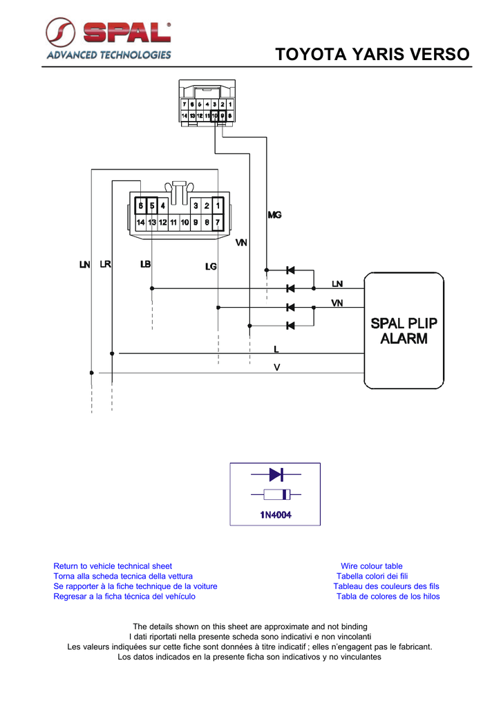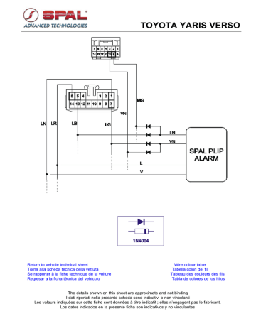 TOYOTA YARIS VERSO Return to vehicle technical sheet Torna alla scheda tecnica della vettura Se rapporter à la fiche technique de la voiture Regresar a la ficha técnica del vehículo Wire colour table Tabella colori dei fili Tableau des couleurs des fils Tabla de colores de los hilos The details shown on this sheet are approximate and not binding I dati riportati nella presente scheda sono indicativi e non vincolanti Les valeurs indiquées sur cette fiche sont données à titre indicatif ; elles n’engagent pas le fabricant. Los datos indicados en la presente ficha son indicativos y no vinculantes COLORS Return to electrical diagram Torna allo schema elettrico Se rapporter au schéma électrique Regresar al esquema eléctrico COLORS Return to electrical diagram Torna allo schema elettrico Se rapporter au schéma électrique Regresar al esquema eléctrico