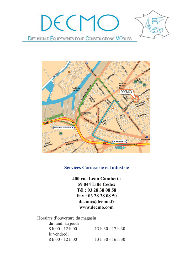 Services Carosserie et Industrie 400 rue Léon Gambetta 59 044 Lille Cedex Tél : 03 28 38 08 58 Fax : 03 28 38 08 50 [email protected] www.decmo.com Horaires d’ouverture du magasin du lundi au jeudi 8 h 00 - 12 h 00 13 h 30 - 17 h 30 le vendredi 8 h 00 - 12 h 00 13 h 30 - 16 h 30
