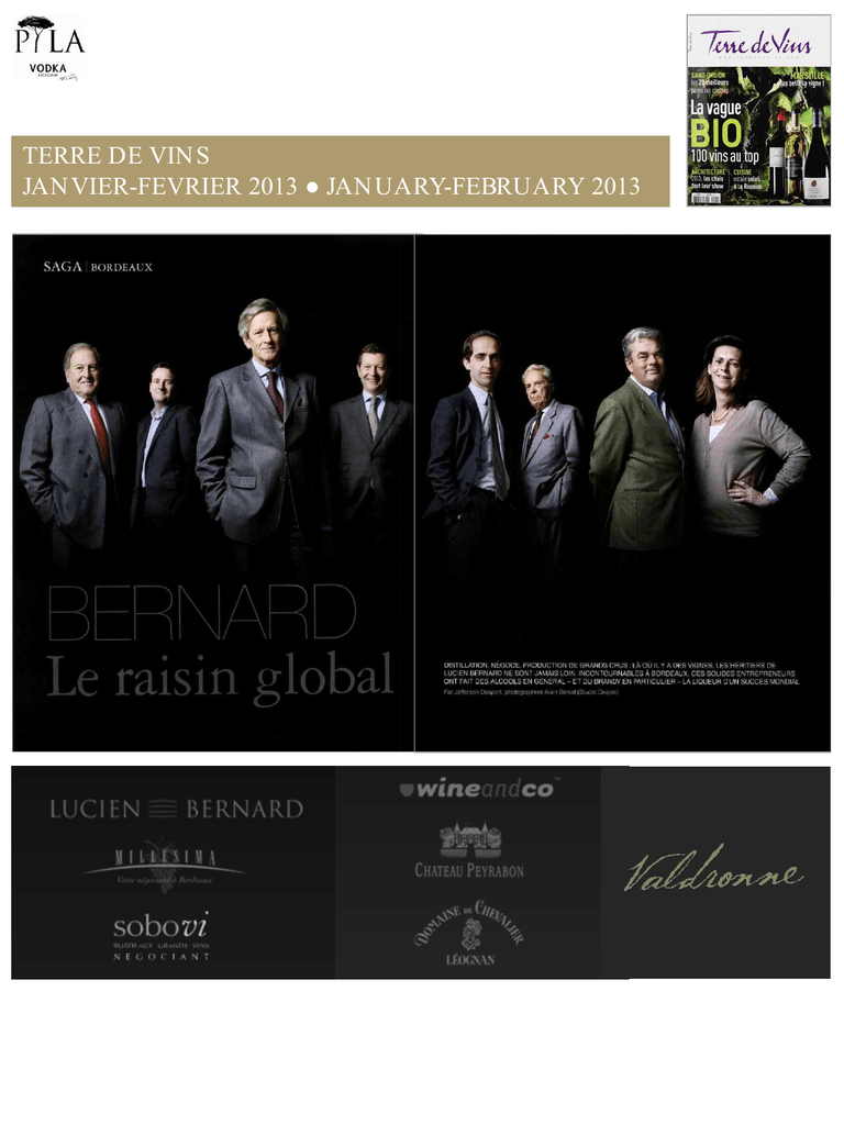 TERRE DE VIN S JAN VIER-FEVRIER 2013 ● JAN UARY-FEBRUARY 2013 TERRE DE VIN S JAN VIER-FEVRIER 2013 ● JAN UARY-FEBRUARY 2013 « Notre bac à sable, c’est le monde. » Créateur de slogans à la minute, Patrick Bernard, le PDG de Millésima, aurait pu faire les beaux jours de la pub. Malheureusement pour les traders en « temps de cerveau disponible », ce spécialiste de la vente en ligne de grands crus a choisi l’aventure familiale. Qui lui en voudra ? Que vous soyez dans un bar branche à Singapour, un étoilé à Paris ou à un cocktail à Moscou, il y a de fortes chances pour que votre verre ait quelque chose non pas de Tennessee mais de Bernard. Reste à savoir lequel. Vous servez un premier de 1855, demandez Patrick ! À moins que ce ne soit Christophe… Vous dînez à la vodka, pensez à Eymeric. Vous appréciez un brandy, choisissez Jean! Vous partagez un Domaine de Chevalier, votez Olivier, un des piliers de l’appellation Pessac-Léognan. Distillation, négoce, production : la stratégie des Bernard est là, dans cet ingénieux trident porté par près de 230 salariés et une force de frappe qui serait capable de livrer jusqu’au Groenland. Pour peu que l’ours polaire ait décidé d’améliorer l’ordinaire de ses glaçons… Un rayonnement, à n’en pas douter, sourire le créateur de cette fructueuse affaire de liquoristes : Lucien Bernard. Un homme parti de rien et revenu de tout. Même de la mort. C’est d’ailleurs parce qu’elle n’a pas voulu de lui, en 1916, sur les champs de bataille de la Grande Guerre, que ce natif de Lille, a épousé… une Bordelaise. Et amorcé cette trajectoire nord-est-sud-ouest née d’un coup de fusil. « Pendant les combats, mon grand-père a été grièvement blessé au poumon, raconte Patrick Bernard. Quand ses hommes l’ont amené à l’infirmerie, le chirurgien a estimé que ce n’était pas la peine de perdre son temps avec lui. À ses yeux, il était condamné. Mais l’interne de service a décidé de s’en occuper : il l’a sauvé. » Durant sa convalescence passée à l’arrière, il rencontre sa future épouse. Puis retourne au front et termine la guerre, les poumons en marmelade. « Après ça, l’armée a décidé qu’il n’était plus apte », sourit Patrick Bernard. Puisqu’il est marié à une Girondine, ses aînés l’expédient à Bordeaux pour diriger une de leurs distilleries. Une spécialité qui déjà fait les beaux jours de ces Nordistes. C’est ainsi que, en janvier 1928 – et après quelques différends familiaux -, l’ex-militaire fonde la distillerie Lucien Bernard, sur la rive droite de la Garonne, quai Deschamps, entre le pont Saint-Jean et le pont de pierre. “Porter le nom de Bernard n’est pas une garantie. La compétence prime avant tout.” JEAN BERNARD Une activité qui, quatre-vingt-cinq ans plus tard, reste plus que jamais le « canal historique » de la famille et sur laquelle veille un des petits-fils, Jean, le frère de Patrick. Jean, qui se trouve être aussi le président du groupe Bernard, cette holding qui chapeaute l’ensemble des sociétés familiales. C’est d’ailleurs sa connaissance des grandes entreprises et des spiritueux qui l’a amené là. Et à quitter LVMH, chez qui il émargeait depuis treize ans. «J’étais dans la finance, raconte-t-il. J’avais démarré à Cognac. Mais, en 1992, le fils de Lucien, qui était le président de la holding, commençait à penser à sa succession. Comme Claude, notre père, était mort un an avant, il m’a proposé de le rejoindre pour, à terme, diriger le groupe. À l’époque, la filière alcool était dirigée par Dominique Bernard. Mais, en 2004, il est décédé d’un infarctus massif. C’est comme ça que j’ai aussi pris sa suite. » À son arrivée, cette branche distillation, forte de diverses révolutions, tourne déjà à plein régime. « Dans les années 1950, Lucien Bernard a été rejoint par ses trois fils : Yves, Claude et Jean, raconte-t-il. C’est à ce moment- là que la société a souhaité se diversifier. » Jusque-là, les Bernard distillaient leurs vins en alcool extra neutre, c’est-à-dire à 95 degrés, que l’on retrouvait essentiellement dans les apéritifs. « L’activité était florissante, poursuit-il, mais sous la réflexion d’Yves, ils se sont dit qu’il était dommage d’avoir des vins de bonne qualité et de les distiller en perdant toute notion d’origine, alors qu’avec on pouvait faire de l’eau-de-vie de vin. » Laquelle présente l’avantage de se vendre bien plus cher. Seulement, la contrepartie n’est pas mince. En effet, avant d’être bues, ces eaux-de-vie de vin doivent vieillir en fûts de bois. Ce qui impose des capacités de stockage. « C’est ainsi qu’à la fin des années 1950, l’entreprise a acheté les chais des quais de Paludate, à Bordeaux, explique Jean. Ils étaient à l’abandon depuis la guerre et avaient besoin d’être rénovés. » Ce qui a été fait au début des années 1960, peu après la mort de Lucien Bernard. Entre-temps, l’intuition d’Yves se confirme: ce marche se développe, dopé par un produit qui, aujourd’hui encore, fait leur fortune: le brandy. TERRE DE VIN S JAN VIER-FEVRIER 2013 ● JAN UARY-FEBRUARY 2013 Conséquence de cet emballement: dix ans plus tard, les chais de Paludate deviennent trop petits. Si bien que, en 1972, les Bernard migrent à Bassens, sur la rive droite de la Garonne, où ils rachètent une propriété appartenant à la bellefamille de Lucien Bernard. Alors que les raffineries de pétrole sont déjà installées sur la presqu’île girondine, ils construisent une immense zone de stockage. Soit neuf chais pour le vieillissement des eaux-de-vie de vin et vingt-sept cuves inox pouvant contenir jusqu’à 270 000 hectolitres. Pour bien comprendre l’importance de cet investissement, il suffit de savoir que la société Lucien Bernard, qui possède aussi une distillerie en Espagn