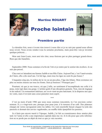 1 Martine ROUART Proche lointain Première partie La dernière fois, nous n’avons rien trouvé à nous dire et je ne sais pas quand nous allons nous revoir. Nous avons rendez-vous la semaine prochaine, mais peut-être vais-je inventer quelque prétexte… Mon ami Jean-Louis, mon ami très cher, nous finirons par ne plus partager grand-chose. Rien que des banalités. Septembre 2008. Nous sommes à la fin de l’été et je rentre par le sentier des écoliers. Je ne suis pas pressé. Chez moi m’attendent ma femme Judith et ma fille Claire. Aujourd’hui, c’est l’anniversaire de Claire, elle a dix-neuf ans. Un bel âge, mais tous les âges ne sont-ils pas beaux ? Cinquante-cinq ans, le milieu de la vie ou un peu plus, l’âge des bilans. Mon existence est plus ou moins réussie sur tous les fronts. Suis-je heureux ? Pourquoi pas ? Pourtant, où que je me trouve, où que j’aille, un sentiment d’incomplétude me colle à la peau, reste tapi dans ma gorge. L’arrière-goût d’une déception gratuite. Non, rien de tragique ni de radical. Un remuement intérieur, un va-et-vient un peu lancinant. Je le disperse aux quatre vents, mais il revient sans cesse parasiter mon esprit. *** C’est au mois d’août 1986 que nous nous sommes rencontrés, tu t’en souviens certainement. Il y a vingt-trois ans, presque jour pour jour, à la terrasse d’un café. Des plateaux chargés de verres naviguaient entre les tables. Un vent ensoleillé faisait claquer la toile des parasols et donnait des envies vagabondes, un souffle tiède éparpillait les pensées. Je n’étais pas encore marié à l’époque. Judith, j’ai fait sa connaissance deux années plus tard. Je l’aime et elle a une importance capitale dans ma vie. Je le dis pour que cette information ne se perde pas en dépit de tout ce que je vais raconter. Tous droits de reproduction, d'adaptation et de traduction réservés pour tous pays. © EDITIONS DRICOT – LIEGE-BRESSOUX – BELGIQUE 2 Ainsi, toi et moi, l’esprit vacant, aussi libres l’un que l’autre, nous regardions passer une femme, la suivant des yeux jusqu’à ce qu’elle fût avalée par la foule. Je m’en souviens comme si c’était hier. Elle portait une jupe à fleurs un peu démodée s’ouvrant en corolle au-dessus des genoux et un chemisier blanc ajusté. Un foulard noué dans sa nuque dissimulait entièrement sa chevelure et elle avançait à grands pas lents et réguliers, les yeux fixés droit devant elle, imperturbable comme un navire fendant les flots. Je ne me rappelle pas son visage ni si elle était vraiment jolie. Nos regards se croisèrent, comme par hasard. Je parle de toi, Jean-Louis, dont j’allais bientôt faire la connaissance. Sans cette femme surgie de nulle part, nous nous serions levés après avoir fini notre bière et vidé notre esprit de toutes ses songeries volatiles, chacun reprenant sa route. Un espacetemps qui aurait pu tout aussi bien ne pas exister, n’ajoutant rien, ne retranchant rien non plus. Quelques minutes ne représentant pas autre chose que le temps qui passe. L’on se serait à la fin salué d’un hochement de tête mécanique, celui que s’échangent des gens restés un certain temps côte à côte à goûter une même atmosphère sans partager quoi que ce soit. Cette inconnue avait réveillé un souvenir dans nos mémoires. Pour ma part, le foulard m’avait forcément fait songer à Éléonore. Oui, c’est elle. C’est bien cette passante, apparaissant et disparaissant, qui nous présenta l’un à l’autre. Toi et moi échangeâmes un sourire. Il ne signifiait rien d’autre que la conscience d’avoir regardé dans la même direction et d’une pensée secrète qui avait clapoté tout au fond. Une seconde en un point du monde, à la fois propre et universelle. Dualité du regard et superposition des perceptions, des petits points de connexion qui avaient suffi pour faire naître un sentiment d’unicité. En réalité, cette femme évoquait chez l’un et l’autre des pensées qui n’avaient pas grandchose en commun. Tu ne pensais pas comme moi. Mais je ne m’en rendrais compte que des années plus tard. Suis-je en train de dire que notre amitié a démarré sur un malentendu ? Bien sûr que non. Avant tout, ce fut une belle rencontre de hasard. Celle de deux esprits tournés de la même façon. Nous commençâmes à bavarder en évitant d’emblée les banalités telles que le temps radieux de ce jour-là, étant du genre à discuter de celui qui fuit sans jamais revenir. Jean-Louis. Voici que de ma mémoire surgit l’image flash qui m’apparut lors de notre première conversation et l’impression que tu m’avais donnée, alors que je ne savais rien de toi. La pensée qui me vint, tu vas rire, c’était que tu étais beau. Je le pense toujours, d’ailleurs. Tu fais partie de ce type d’homme qui vieillit bien. Tous droits de reproduction, d'adaptation et de traduction réservés pour tous pays. © EDITIONS DRICOT – LIEGE-BRESSOUX – BELGIQUE 3 C’est étrange que cette réflexion me fût passée par la tête, car, je te l’assure, ni à ce moment-là ni ensuite, je n’ai éprouvé pour un homme autre chose que de l’amitié. Ton charisme indiscutable m’avait frappé, un éblouissement pris en pleine figure qui aujourd’hui ne me paraît pas moins naturel qu’alors. Simplement, depuis, l’émotion s’en est allée et j’ai compris qui tu étais. Donc, moi qui suis de taille moyenne, frêle et étriqué de partout, le cheveu plat et mou tirant sur le blond et la figure pâle, j’admirai ton visage bronzé, carré et volontaire, presque anguleux, et ton regard chaud, aussi sombre que tes cheveux coupés très courts. Tu portais un polo Lacoste couleur lavande un peu lâche et un pantalon de toile claire. Une élégance naturelle, sans effort. Je me sentais tout raide et engoncé dans mon costume bleu marine et je me souviens d’avoir instinctivement dénoué ma cravate. Je songea