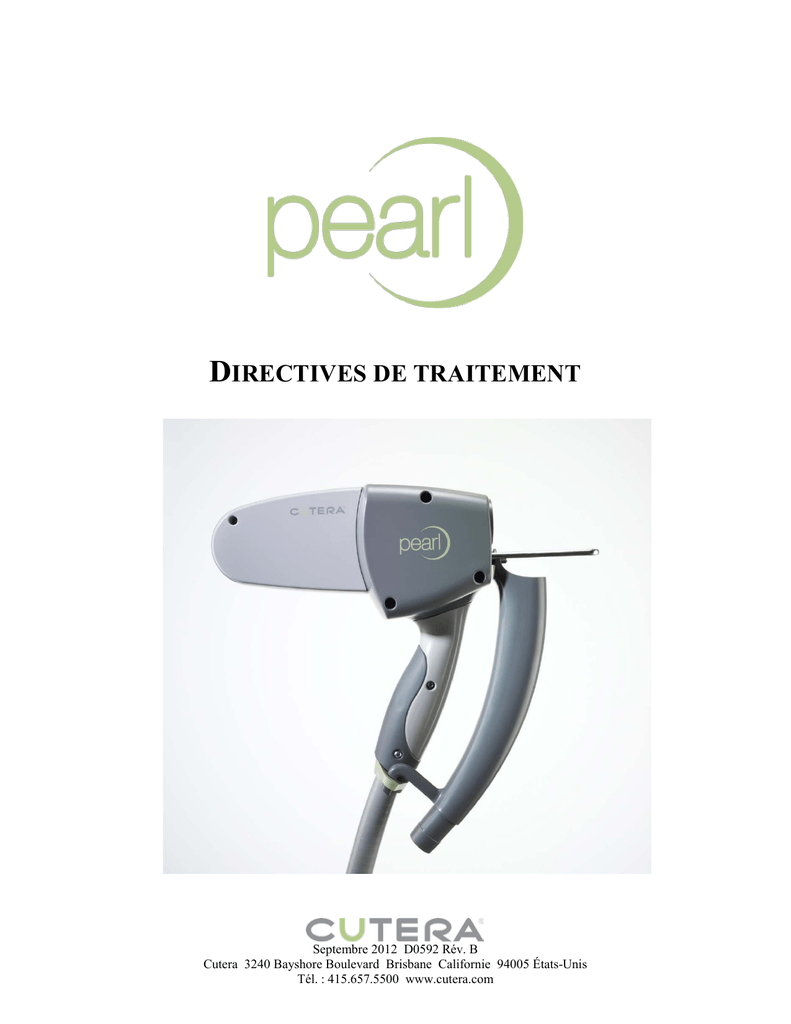 DIRECTIVES DE TRAITEMENT Septembre 2012 D0592 Rév. B Cutera 3240 Bayshore Boulevard Brisbane Californie 94005 États-Unis Tél. : 415.657.5500 www.cutera.com Directives de traitement laser Pearl Les directives suivantes ont été établies à partir des informations recueillies auprès de médecins lors de traitements effectués avec le système laser Pearl chez des patients de type de peau I-IV selon l’échelle de Fitzpatrick. Pour obtenir des informations complémentaires sur le traitement, consulter le CD de formation clinique Pearl inclus avec le système. Seuls des praticiens dûment qualifiés et formés ayant lu attentivement le manuel d’utilisation du système laser Pearl sont autorisés à l’utiliser. Pour plus d’informations, y compris sur les contre-indications, les événements transitoires prévus et les effets indésirables potentiels, consulter le manuel d’utilisation. INFORMATIONS SUR LES SOINS DU PATIENT : Il est important de savoir que les patients sont plus vulnérables aux irritations ou aux infections après une intervention qui modifie la surface de la peau. Le cas échéant, il est important de poser un diagnostic correct et de traiter convenablement ces lésions pour éviter de retarder la cicatrisation des plaies, la formation de cicatrices ou la propagation d’une infection. Ces lésions nécessitent souvent l’utilisation de médicaments délivrés sur ordonnance. • Pendant les 3 à 4 premiers jours qui suivent le traitement, la plus grande vulnérabilité de la peau aux irritations peut entraîner une dermite de contact. Cette affection cutanée pouvant être déclenchée par des substances qui n’irritent habituellement pas la peau, il est important que le patient évite tout contact cutané avec des produits autres que ceux spécifiquement recommandés pour les soins postopératoires, et qu’il se lave toujours soigneusement les mains avant de se toucher le visage. • Il est possible qu’un traitement réactive le virus de l’herpès simplex dans la zone traitée et entraîne ainsi la formation de cicatrices. Dans la mesure où les porteurs du virus de l’herpès simplex ne se savent pas toujours porteurs, de nombreux médecins proposent une prophylaxie antivirale orale à tous leurs patients avant de procéder à un traitement ablatif. Toutefois, il a été démontré qu’un traitement prophylactique n’élimine pas totalement l’incidence de la réactivation de l’herpès. Il est donc également important de surveiller et de traiter la survenue d’une réactivation post-opératoire. • La peau est également plus vulnérable aux infections bactériennes et fongiques après une modification par une intervention ablative. De bons soins post-opératoires de la peau permettent de réduire le risque d’infection, par exemple un nettoyage régulier, l’application de compresses imbibées de vinaigre (acide acétique) [1 cuillère à café pour 2 tasses d’eau (env. 5 ml pour 500 ml)] et en minimisant les contacts avec la peau du visage. • En conséquence, il est important de donner des instructions au patient relatives aux soins postopératoires de sa peau et de lui demander de contacter le cabinet où il a reçu son traitement s’il présente un symptôme suspect comme une douleur intense, un écoulement, des démangeaisons accrues, une rougeur sévère ou de la fièvre, la survenue d’un herpès labial, d’une cloque ou d’une sensation de picotement similaire, ou tout autre signe indiquant que la cicatrisation ne se déroule pas normalement. • Ces renseignements ont pour objectif de fournir des informations sur ces points, mais ne sont en aucun cas exhaustifs. Pour des informations complémentaires sur les irritations et infections possibles suite à un traitement par ablation laser et les soins à instaurer, consulter la littérature médicale. L’une de ces sources est le chapitre intitulé « Complications in Laser and Light Surgery » (Complications des lasers et lampes) par Tina S. Alster et Elizabeth L. Tanzi, dans le livre « Laser and Lights, Volume 2 » (Laser et lampes, Volume 2), édité par David J. Goldberg, dans la collection « Procedures in Cosmetic Dermatology » (Avancées en dermatologie cosmétique), édité par Jeffrey S. Dover (Jean-Luc Lévy pour l’édition française). Cet ouvrage a été publié en 2005 par Elsevier Saunders (en 2006 par Elsevier France). Septembre 2012, D0592F Rév. B Directives de traitement laser Pearl Page 2 sur 7 FOURNITURES ET MATÉRIEL • • • • • • • • • Évacuateur de fumée o Le remplacement des tuyaux et des filtres doit être effectué conformément aux recommandations du fabricant. Masques de protection contre le panache laser (filtrant jusqu’à 0,1 μm) facultatifs Alcool isopropylique Compresses de gaze Abaisse-langues Gants Anesthésique topique O D’autres formes de prise en charge de la douleur peuvent également être utilisées pour améliorer le confort du patient. Pommade occlusive – (p. ex., vaseline ou Aquaphor) TOUTES les personnes présentes dans la salle de traitement doivent porter des protections oculaires. o Le patient doit porter des protections oculaires opaques rigides fournies par Cutera. o Lunettes pour opérateurs – densité optique (DO) de 2,5 ou plus à 2 790 nm ÉTAPES PRÉ-OPÉRATOIRES : • Avant le traitement, recevoir le patient pour une consultation complète et un examen de ses antécédents. • La zone de la barbe doit être rasée de près avant le traitement, car les poils absorberont l’énergie laser, ce qui en diminue l’efficacité. • Nettoyer la peau et retirer tout maquillage ou produit de soin pour la peau. • Réaliser des clichés pré-opératoires avant le premier traitement en utilisant toujours la même technique (position du patient, réglages de l’appareil photo et éclairage) pour les utiliser comme référence générale. Des copies des clichés pré-opératoires peuvent également ê