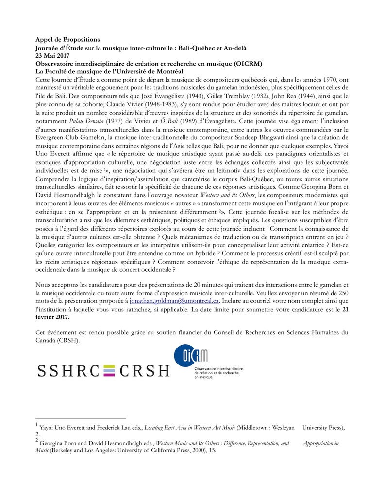 Appel de Propositions Journée dʼÉtude sur la musique inter-culturelle : Bali-Québec et Au-delà 23 Mai 2017 Observatoire interdisciplinaire de création et recherche en musique (OICRM) La Faculté de musique de l’Université de Montréal Cette Journée dʼÉtude a comme point de départ la musique de compositeurs québécois qui, dans les années 1970, ont manifesté un véritable engouement pour les traditions musicales du gamelan indonésien, plus spécifiquement celles de lʼîle de Bali. Des compositeurs tels que José Évangélista (1943), Gilles Tremblay (1932), John Rea (1944), ainsi que le plus connu de sa cohorte, Claude Vivier (1948-1983), sʼy sont rendus pour étudier avec des maîtres locaux et ont par la suite produit un nombre considérable dʼœuvres inspirées de la structure et des sonorités du répertoire de gamelan, notamment Pulau Dewata (1977) de Vivier et Ô Bali (1989) dʼÉvangélista. Cette journée vise également lʼinclusion dʼautres manifestations transculturelles dans la musique contemporaine, entre autres les oeuvres commandées par le Evergreen Club Gamelan, la musique inter-traditionnelle du compositeur Sandeep Bhagwati ainsi que la création de musique contemporaine dans certaines régions de lʼAsie telles que Bali, pour ne donner que quelques exemples. Yayoi Uno Everett affirme que « le répertoire de musique artistique ayant passé au-delà des paradigmes orientalistes et exotiques dʼappropriation culturelle, une négociation juste entre les échanges collectifs ainsi que les subjectivités individuelles est de mise 1», une négociation qui sʼavérera être un leitmotiv dans les explorations de cette journée. Comprendre la logique dʼinspiration/assimilation qui caractérise le corpus Bali-Québec, ou toutes autres situations transculturelles similaires, fait ressortir la spécificité de chacune de ces réponses artistiques. Comme Georgina Born et David Hesmondhalgh le constatent dans lʼouvrage novateur Western and its Others, les compositeurs modernistes qui incorporent à leurs œuvres des éléments musicaux « autres » « transforment cette musique en lʼintégrant à leur propre esthétique : en se lʼappropriant et en la présentant différemment 2 ». Cette journée focalise sur les méthodes de transculturation ainsi que les dilemmes esthétiques, politiques et éthiques impliqués. Les questions susceptibles dʼêtre posées à lʼégard des différents répertoires explorés au cours de cette journée incluent : Comment la connaissance de la musique dʼautres cultures est-elle obtenue ? Quels mécanismes de traduction ou de transcription entrent en jeu ? Quelles catégories les compositeurs et les interprètes utilisent-ils pour conceptualiser leur activité créatrice ? Est-ce quʼune œuvre interculturelle peut être entendue comme un hybride ? Comment le processus créatif est-il sculpté par les récits artistiques régionaux spécifiques ? Comment concevoir lʼéthique de représentation de la musique extraoccidentale dans la musique de concert occidentale ? Nous acceptons les candidatures pour des présentations de 20 minutes qui traitent des interactions entre le gamelan et la musique occidentale ou toute autre forme dʼexpression musicale inter-culturelle. Veuillez envoyer un résumé de 250 mots de la présentation proposée à [email protected]. Inclure au courriel votre nom complet ainsi que lʼinstitution à laquelle vous vous rattachez, si applicable. La date limite pour soumettre votre candidature est le 21 février 2017. Cet événement est rendu possible grâce au soutien financier du Conseil de Recherches en Sciences Humaines du Canada (CRSH). 1 Yayoi Uno Everett and Frederick Lau eds., Locating East Asia in Western Art Music (Middletown : Wesleyan 2. 2 Georgina Born and David Hesmondhalgh eds., Western Music and Its Others : Difference, Representation, and Music (Berkeley and Los Angeles: University of California Press, 2000), 15. University Press), Appropriation in Call for Proposals Study Day on intercultural music: Bali-Quebec and Beyond 23 May 2017 Observatoire interdisciplinaire de création et recherche en musique (OICRM) La Faculté de musique de l’Université de Montréal This Study Day takes as its starting point the music of composers of concert music in Quebec who, beginning in the early 1970s, became spellbound by the gamelan musical traditions of Indonesia, particularly that of the island of Bali. Composers such as José Evangelista (1943), Gilles Tremblay (1932), John Rea (1944), and the best-known composer of their cohort, Claude Vivier (1948-1983), travelled to the region and studied with local masters and subsequently produced a considerable corpus of works inspired by the structure and sonorities of gamelan repertoire, including Vivier’s Pulau Dewata (1977) and Evangelista’s Ô Bali (1989). The day also expands outward to encompass other transcultural gestures in contemporary music, including the works commissioned by the Evergreen Club Gamelan, and Sandeep Bhagwati’s intertraditional music and contemporary concert music in Asian regions including Bali, to give but a few examples. Yayoi Uno Everett has argued that “as the repertory of art music has moved beyond the Orientalist and exotic paradigms of cultural appropriation, it invites a careful negotiation between collective discourses and individual subjectivities,”1 a negotiation which will return as a leitmotif in the day’s explorations. Understanding the logic of inspiration/assimilation that characterizes the Bali-Quebec corpus, as well as many other analogous transcultural situations, brings out the cultural specificity of each artistic response. As Georgina Born and David Hesmondhalgh have noted in their path-breaking volume Western Music and its Others, modernist composers who incorporate elements of musical ‘others’ in their work “are transforming that music through incorporation into their own aesthetic: appro