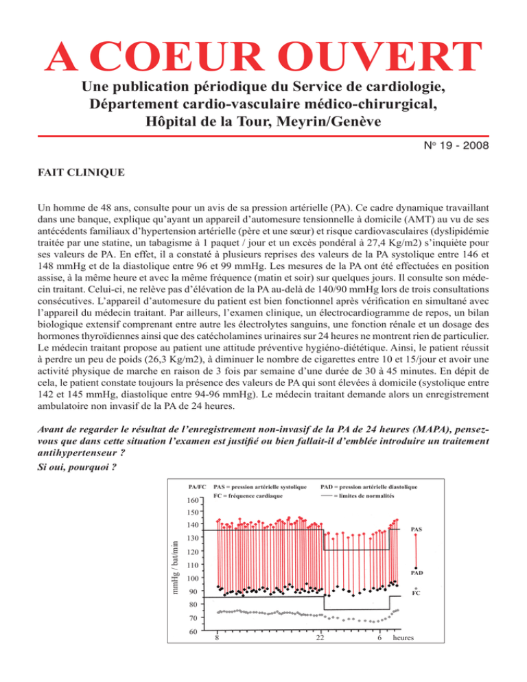 A COEUR OUVERT Une publication périodique du Service de cardiologie, Département cardio-vasculaire médico-chirurgical, Hôpital de la Tour, Meyrin/Genève No 19 - 2008 FAIT CLINIQUE Un homme de 48 ans, consulte pour un avis de sa pression artérielle (PA). Ce cadre dynamique travaillant dans une banque, explique qu’ayant un appareil d’automesure tensionnelle à domicile (AMT) au vu de ses antécédents familiaux d’hypertension artérielle (père et une sœur) et risque cardiovasculaires (dyslipidémie traitée par une statine, un tabagisme à 1 paquet / jour et un excès pondéral à 27,4 Kg/m2) s’inquiète pour ses valeurs de PA. En effet, il a constaté à plusieurs reprises des valeurs de la PA systolique entre 146 et 148 mmHg et de la diastolique entre 96 et 99 mmHg. Les mesures de la PA ont été effectuées en position assise, à la même heure et avec la même fréquence (matin et soir) sur quelques jours. Il consulte son médecin traitant. Celui-ci, ne relève pas d’élévation de la PA au-delà de 140/90 mmHg lors de trois consultations consécutives. L’appareil d’automesure du patient est bien fonctionnel après vérification en simultané avec l’appareil du médecin traitant. Par ailleurs, l’examen clinique, un électrocardiogramme de repos, un bilan biologique extensif comprenant entre autre les électrolytes sanguins, une fonction rénale et un dosage des hormones thyroïdiennes ainsi que des catécholamines urinaires sur 24 heures ne montrent rien de particulier. Le médecin traitant propose au patient une attitude préventive hygiéno-diététique. Ainsi, le patient réussit à perdre un peu de poids (26,3 Kg/m2), à diminuer le nombre de cigarettes entre 10 et 15/jour et avoir une activité physique de marche en raison de 3 fois par semaine d’une durée de 30 à 45 minutes. En dépit de cela, le patient constate toujours la présence des valeurs de PA qui sont élevées à domicile (systolique entre 142 et 145 mmHg, diastolique entre 94-96 mmHg). Le médecin traitant demande alors un enregistrement ambulatoire non invasif de la PA de 24 heures. Avant de regarder le résultat de l’enregistrement non-invasif de la PA de 24 heures (MAPA), pensezvous que dans cette situation l’examen est justifié ou bien fallait-il d’emblée introduire un traitement antihypertenseur ? Si oui, pourquoi ? PA/FC 160 PAS = pression artérielle systolique PAD = pression artérielle diastolique = limites de normalités FC = fréquence cardiaque 150 mmHg / bat/min 140 PAS 130 120 110 PAD 100 90 FC 80 70 60 8 22 6 heures RÉPONSE Comme vous pouvez le constater sur la figure, la MAPA du patient montre une hypertension artérielle systolo-diastolique en phase diurne (moyenne systolique à 139 mmHg et diastolique à 91 mmHg). Cet examen permet de préciser, contrairement à la mesure conventionnelle en milieu médical ou à domicile par le patient comment varient les valeurs de PA en période nocturnes. Qui, je vous rappelle sont pronostic en terme de survenue d’événements cardiovasculaires indépendamment des valeurs diurnes. Chez notre patient, le profil nocturne est anormalement élevé (moyenne systolique à 131 mmHg et diastolique à 89 mmHg). Sur la base de l’histoire clinique du patient et de différentes investigations effectuées, le diagnostic d’Hypertension Artérielle Essentielle Masquée a été retenu. Définition de l’Hypertension Masquée: Au cours de ces 15 dernières années, on a montré que le niveau tensionnel basal était mieux défini par la mesure ambulatoire (MAPA) ou l’automesure tensionnelle à domicile (AMT) que par la méthode conventionnelle en milieu médical. Très récemment, plusieurs études ont démontré, tant pour la MAPA que pour l’AMT, que la morbi-mortalité cardiovasculaire était mieux prédite par le niveau tensionnel défini par ces deux méthodes que celui mesuré en consultation médicale. Cependant, il n’y a pas d’étude prospective montrant qu’une méthode est supérieure à l’autre en terme pronostic. Néanmoins, on peut supposer que par le nombre de mesures obtenues par la MAPA et sans interférence de contrôle par le sujet sur les valeurs enregistrées ainsi que d’autre part de l’analyse du profil tensionnel nocturne, cette méthode est plus précise dans le diagnostic, l’évaluation de la stratification du risque cardiovasculaire et dans la surveillance du patient hypertendu traité. La comparaison des résultats des mesures tensionnelles obtenues par les différentes méthodes a conduit les sociétés savantes à classer les patients en quatre catégories (tableau) : normotendu ou ( normotendu contrôlé s’il prend un traitement antihypertenseur ) ; hypertension ou ( hypertension non contrôlée sous traitement ) ; hypertension de la blouse blanche ou encore hypertension de consultation ; enfin hypertension masquée. Mesure Conventionnelle en Milieu Médical Automesure à Domicile (moyenne) Ou Mesure Ambulatoire de 24h (moyenne diurne) <140 et 90 mmHg >ou=140 ou 90 mmHg <135 et 85 mmHg Normotendu Contrôlé Hypertension de la Blouse blanche >ou=135 ou 85 mmHg Hypertension Masquée Hypertension Non contrôlée Prévalence et évolution de l’Hypertension Masquée: La prévalence de l’hypertension masquée varie, selon les études disponibles, de 8 à 55%, écarts d’estimation principalement dus à des différences de définition et/ou de population étudiée. Si l’on restreint son évaluation à la population des sujets apparemment normotendus ou contrôlés par un traitement antihypertenseur en consultation, elle va de 23% dans une population générale non sélectionnée à 40%-55% chez les patients adressés ou suivis pour une hypertension. Autrement dit, le quart à la moitié des patients apparemment contrôlés en consultation sont en fait des hypertendus non contrôlés. Il n’existe pas d’étude publiée de reproductibilité de l’identification ou du diagnostic de l’hyp