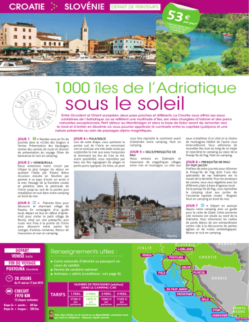 CROATIE SLOVÉNIE DÉPART DE PRINTEMPS 53 € pa 1000 îles de l’Adriatique atie nie cro r jour * Tarif * p 2 persar adulte, b ase onnes 1 cam dans ping-c ar sous le soleil Entre Occident et Orient européen, deux pays proches et différents. La Croatie vous offrira ses eaux cristallines de l’Adriatique, où se reflètent une multitude d’îles, ses villes chargées d’histoire et des parcs naturelles exceptionnels. Petit détour au Monténégro et dans la baie de Kotor avant de remonter vers le nord et d’entrer en Slovénie où vous pourrez apprécier le contraste entre la capitale Ljubljana et une nature préservée au sein de paysages alpins magnifiques. slove JOUR 1 > Rendez-vous en fin de journée dans la «Citée des Doges» à Venise. Présentation des équipages, remise des carnets de route et réunion de présentation du voyage. Dîner de bienvenue et nuit en camping. JOUR 2 > VENISE/PULA Nous entamons notre circuit par l’étape la plus longue du séjour en quittant l’Italie par Trieste. Brève incursion ensuite en Slovénie qui permet à ce pays d’avoir un accès à la mer. Passage de la frontière croate et pénétrez dans la péninsule de l’Istrie jusqu’au sud de la pointe puis installation et nuit dans notre camping en bord de mer. JOUR 4 > PULA/SELCE Lors de cette étape, vous quitterez la pointe sud de l’Istrie en remontant vers le nord par une très belle route qui surplombe la mer aux eaux turquoises et dominant les îles de Cres et Krk. Autre possibilité, vous rejoindrez par bacs ces îles regorgeant de plages et petits ports typiques. De Krka, un pont vous fera rejoindre le continent avant d’atteindre notre camping. Nuit en camping. JOUR 5 > SELCE/PRESQU’ÎLE DE PAG Nous entrons en Dalmatie et traversons de magnifiques villages entre mer et montagne. La côte aux JOUR 3 > Matinée libre pour découvrir le charmant village de Fazana. En compagnie d’un guide local, départ en bus en début d’aprèsmidi pour visiter le petit village de Rovinj, situé sur une presqu’île, puis route vers Pula à la pointe de l’Istrie pour découvrir entre autres les vestiges d’arènes romaines. Retour de l’excursion et nuit en camping. DEPART VENISE Italie FIN DE VOYAGE POSTOJNA Slovénie 28 JOURS 13 étapes roulantes Etape la + courte : 60 km Etape la + longue : 300 km JOUR 6 > PRESQU’ÎLE DE PAG/ SV FILIP JACOV Profitez de cette journée pour sillonner la Presqu’île de Pag dont l’une des spécialités de ses habitants est le travail de la dentelle. Pour les amateurs de cuisine, vous vous régalerez avec les différents plats à base d’agneau local. De la presqu’île de Pag, vous rejoindree le camping situé aux portes de l’ancienne capitale croate : Biograd. Nuit en camping en bord de mer. JOUR 7 > Départ en autocar depuis notre camping avec un guide pour la visite de Zadar. Cette ancienne cité romaine est située au nord de la Dalmatie. Vous sillonnerez les ruelles de pavés blancs de son extraordinaire centre ville à la découverte de petites églises et de ruines archéologiques. Retour et nuit en camping. AUTRICHE Rovinj Renseignements utiles : Carte nationale d’identité ou passeport en cours de validité Permis de conduire national Animaux = admis (conditions : voir page 6) HONGRIE SLOVÉNIE I TA L I E LJUBLJANA VENISE POSTOJNA C R OAT I E SELCE PLIVITCE PULA BOSNIE du 21 mai au 17 juin 2013 CIRCUIT 1970 KM eaux cristallines d’un côté et la chaine de montagnes Velebit de l’autre vous émerveilleront. Vous admirerez de nouvelles îles tout au long de ce trajet et rejoindrez le camping au cœur de la Presqu’île de Pag. Nuit en camping. NOMBRE DE PERSONNES (adultes) DANS LE CAMPING-CAR TARIFS 1 PERS. 2 PERS. 3 PERS. 4 PERS. 1720 € 1470 € 1260 € 1120 € par personne par personne par personne par personne SV. FILIP JAKOV PACOSTANE SPLIT STON Pour plus d’infos sur le circuit ou sa disponibilité, contactez-nous par mail ou téléphone - Réponse rapide assurée. DUBROVNIK M ON TEN EGRO autocar Baie de Kotor Sur la route touristique en direction de Split, ne manquez pas de vous arrêter à la très ancienne cité de Sibenik, mais surtout de visiter la petite ville moyenâgeuse de Primosten, un joyau avancé sur la mer adriatique. Camping en bord de mer. JOUR 9 > Départ du camping en bateau pour rejoindre et participer à une visite commentée par un guide local de la presqu’île de Trogir. Le centre médiéval de la cité est entouré d’une muraille qui protège jalousement son précieux château. Retour en bateau et nuit en camping. JOUR 10 > TROGIR/ZIVOGOSCE Nous contournons la ville de Split que nous visiterons au retour puis poursuivons notre séjour par une belle route côtière nous permettant d’admirer au passage les îles de Brac et d’Hvar. Etape à Zivogosce en bord de mer pour profiter d’un peu de détente. Nuit en camping. JOUR 11 > ZIVOGOSCE/ DUBROVNIK En longeant le bord de mer, courte traversée de la Bosnie Herzégovine permettant un accès à la mer à ce pays. En direction de la «Perle de l’Adriatique», vous découvrirez un paysage enchanteur à chaque virage et apprécierez une vue panoramique imprenable de Dubrovnik. Installation et nuit en camping en bord de mer. JOUR 12 > Départ en bateau du camping pour débarquer dans le petit port de Dubrovnik. Visite guidée des principaux monuments le matin. Déjeuner en ville puis temps libre pour escalader les remparts parmi les mieux conservés d’Europe et vue sur les toits de Dubrovnik. Rendez-vous en fin de journée pour rejoindre le camping par la mer. JOUR 13 > Départ en autocar pour assister à un spectacle de danses et de chants traditionnels croates. Retour au camping vers 13h puis après-midi libre. Nuit en camping. JOUR 14 > Départ en autocar le matin à la découverte du Monténégro et notamment la baie de Kotor qui, en entrant de 28 kilomètres dans les terres, forme un fjord aux multiples bras cerné par de hautes falaises