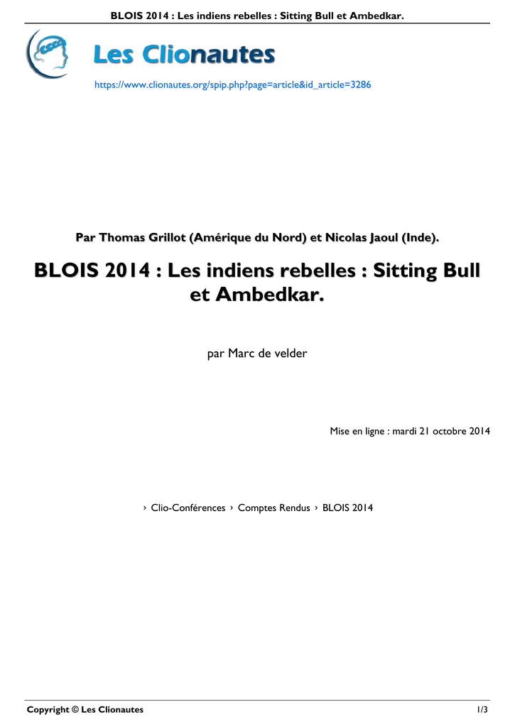 BLOIS 2014 : Les indiens rebelles : Sitting Bull et Ambedkar. https://www.clionautes.org/spip.php?page=article&id_article=3286 Par Thomas Grillot (Amérique du Nord) et Nicolas Jaoul (Inde). BLOIS 2014 : Les indiens rebelles : Sitting Bull et Ambedkar. par Marc de velder Mise en ligne : mardi 21 octobre 2014 i Copyright © Les Clionautes Clio-Conférences i Comptes Rendus i BLOIS 2014 1/3 BLOIS 2014 : Les indiens rebelles : Sitting Bull et Ambedkar. I le Rebelle Sitting Bull. (GRILLOT) Ce guerrier sioux vit l’âge d’or entre 1825 et 1851, quand ce peuple indien domine les Grandes plaines et signe 2 Traités avec les blancs. Mais c’est un chef « hostile », qui refuse les rations, de vivre dans les réserves, de s’intégrer et de se ruraliser. Il refusera aussi de signer le 3ème Traité de Fort Laramy en 1868. En 1876, à la bataille de Little Big Horn, Crazy Horse combat, Sitting Bull assiste à la bataille mais ne combat pas. Cette défaite de Custer symbolise la dernière défaite des blancs dans une erreur stratégique. En 1880/1885, Sitting Bull joue dans le Wild West Show de Buffalo Bill, il devient une icône connue en Europe. Il meurt en martyr en 1890, année de la dernière guerre indienne et de la fin de la « frontière »,arrêté par la police indienne pour avoir participé à un mouvement pacifique, la Danse des esprits, que les Blancs prennent à tort pour une danse de guerre. Plus que Geronimo ou Crazy Horse, Sitting Bull devient l’image de l’indien rebelle... II le Rebelle Intouchable Ambedkar. (JAOUL). Oublié de l’Histoire de l’Inde, Ambedkar sera le chef de l’émancipation des Dalits (« ceux qui sont écrasés », terme que les Intouchables se donnent). Il nait d’un père instructeur militaire en 1891 (un an après la mort de Sitting Bull) qui lui paye des études aux Etats-Unis, à New York, entre 1914 et 1918. Il s’inspire des théories marxistes et socialistes et écrit une thèse sur l’inégalité graduée. Copyright © Les Clionautes 2/3 BLOIS 2014 : Les indiens rebelles : Sitting Bull et Ambedkar. Mais, à son retour en Inde, c’est le choc, personne ne veut partager sa chambre en colocation et ses subordonnés lui jettent de loin les dossierscar il est resté un Intouchable. Il milite alors dans le rejet de l’hindouisme et de ses castes, il s’habille toujours à l’occidental et se convertit au bouddhisme (300.000 dalits le suivront sur cette voie). En 1932, il s’oppose à Gandhi et fait une grève de la faim, en vain, pour réclamer un statut de minorité pour les dalits, que le Mahatma a fait annuler. Il reproche à gandhi son paternalisme et veut que les Intouchables s’émancipent d’eux mêmes... En 1947, il rédige la Constitution Indienne (car c’est un étudiant brillant de droit) et devient ministre du gouvernement d’indépendance. Mais tès vite il se heurte aux conservateurs hindous du Parti du Congrès et doit claquer la porte en 1951. En 1956, il milite pour un fondamentaliste bouddhiste républicain aux valeurs de liberté, d’égalité et de fraternité. Il participe à une conférence mondiale à Katmandu, où il prône la non violence et le marxisme sans dictature du prolétariat. Il meurt en 1956 et est caricaturé comme un suppôt des Britanniques et un traître à l’hindouisme. Les nationalistes hindous l’écartent et l’image de Gandhi l’oblitère. C’est seulement vers 1991 que les révoltes des dalits le font ressurgir comme leur leader et l’îcone du rebelle intouchable. Conclusion : Entre Sitting Bull, le rebelle armé et perdant, et Ambedkar le leader dalit non violent il y a peu de points communs : ce sont cependant des rebellions en milieu colonial et des victimes du racisme des blancs ou des hindous. Mais Sitting Bull a été récupéré comme une figure médiatique de l’histoire américaine ; alors qu’Ambedkar a été nié pendant 44 ans et que le combat des dalits n’est toujours pas fini. La fabrique des icônes rebelles est complexe et ambivalente. Copyright © Les Clionautes 3/3