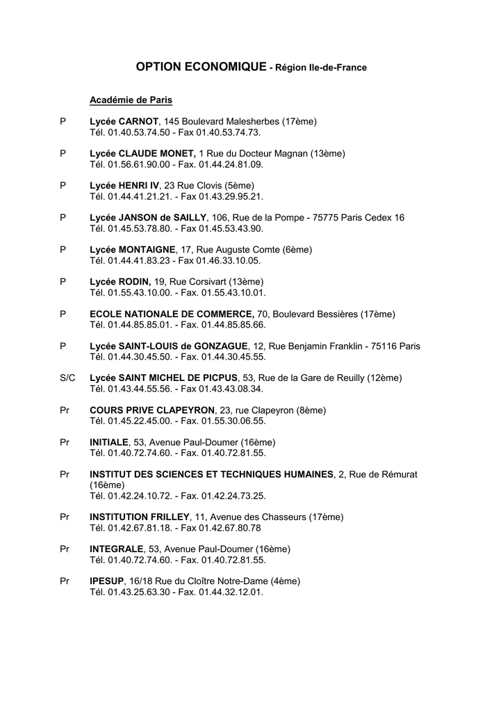 OPTION ECONOMIQUE - Région Ile-de-France Académie de Paris P Lycée CARNOT, 145 Boulevard Malesherbes (17ème) Tél. 01.40.53.74.50 - Fax 01.40.53.74.73. P Lycée CLAUDE MONET, 1 Rue du Docteur Magnan (13ème) Tél. 01.56.61.90.00 - Fax. 01.44.24.81.09. P Lycée HENRI IV, 23 Rue Clovis (5ème) Tél. 01.44.41.21.21. - Fax 01.43.29.95.21. P Lycée JANSON de SAILLY, 106, Rue de la Pompe - 75775 Paris Cedex 16 Tél. 01.45.53.78.80. - Fax 01.45.53.43.90. P Lycée MONTAIGNE, 17, Rue Auguste Comte (6ème) Tél. 01.44.41.83.23 - Fax 01.46.33.10.05. P Lycée RODIN, 19, Rue Corsivart (13ème) Tél. 01.55.43.10.00. - Fax. 01.55.43.10.01. P ECOLE NATIONALE DE COMMERCE, 70, Boulevard Bessières (17ème) Tél. 01.44.85.85.01. - Fax. 01.44.85.85.66. P Lycée SAINT-LOUIS de GONZAGUE, 12, Rue Benjamin Franklin - 75116 Paris Tél. 01.44.30.45.50. - Fax. 01.44.30.45.55. S/C Lycée SAINT MICHEL DE PICPUS, 53, Rue de la Gare de Reuilly (12ème) Tél. 01.43.44.55.56. - Fax 01.43.43.08.34. Pr COURS PRIVE CLAPEYRON, 23, rue Clapeyron (8ème) Tél. 01.45.22.45.00. - Fax. 01.55.30.06.55. Pr INITIALE, 53, Avenue Paul-Doumer (16ème) Tél. 01.40.72.74.60. - Fax. 01.40.72.81.55. Pr INSTITUT DES SCIENCES ET TECHNIQUES HUMAINES, 2, Rue de Rémurat (16ème) Tél. 01.42.24.10.72. - Fax. 01.42.24.73.25. Pr INSTITUTION FRILLEY, 11, Avenue des Chasseurs (17ème) Tél. 01.42.67.81.18. - Fax 01.42.67.80.78 Pr INTEGRALE, 53, Avenue Paul-Doumer (16ème) Tél. 01.40.72.74.60. - Fax. 01.40.72.81.55. Pr IPESUP, 16/18 Rue du Cloître Notre-Dame (4ème) Tél. 01.43.25.63.30 - Fax. 01.44.32.12.01. OPTION ECONOMIQUE - Région Ile-de-France Pr PREPARATION COMMERCIALE SUPERIEURE, 1 Rue Bougainville (7ème) Tél. 01.45.51.32.59. - Fax. 01.47.05.74.75. Pr PREPACOM, 38, Rue des Blancs Manteaux - (4ème) Tél. 01.42.77.27.26 - Fax. 01.42.77.23.97 Pr PREPA-SCIENCES - IPECOM, 39, Rue du Ranelagh (16ème) Tél. 01.45.24.24.00. - Fax 01.40.50.00.01. Académie de Créteil MEAUX P Lycée HENRI MOISSAN 20, Cours de Verdun 77100 MEAUX Tél. 01.60.09.77.70 - Fax 01.60.09.77.76. NOGENT/MARNE S/C Ensemble scolaire ALBERT DE MUN 14, Avenue des Marronniers 94736 NOGENT SUR MARNE Cedex Tél. 01.48.73.79.91 - Fax. 01.43.94.20.26. SAINT-MAUR P Lycée MARCELIN BERTHELOT 6 Boulevard Maurice Berteaux 94107 SAINT MAUR DES FOSSES Cedex Tél. 01.45.11.51.11 - Fax 01.45.11.51.10. VINCENNES P Lycée HECTOR BERLIOZ 106, Avenue de Paris 94307 VINCENNES Cedex Tél. 01.43.28.32.82. - Fax. 01.43.28.57.80. Académie de Versailles CERGY P Lycée ALFRED KASTLER 26, avenue de la Palette 95011 CERGY PONTOISE Cedex Tél. 01.30.32.47.47. - Fax 01.30.32.33.92. MANTES LA JOLIE P Lycée SAINT-EXUPERY 8, Rue Marcel Fouque 78201 MANTES-LA-JOLIE Cedex Tél. 01.30.63.21.21. - Fax. 01.30.33.50.73. MASSY Lycée PARC DE VILGENIS 80, Rue de Versailles - B.P. 112 91305 MASSY Cedex Tél. 01.69.53.74.00. - Fax. 01.69.53.74.27. P OPTION ECONOMIQUE - Région Ile-de-France (suite et fin) NEUILLY S/C Lycée SAINTE CROIX DE NEUILLY 30, avenue du Roule 92200 NEUILLY SUR SEINE CEDEX Tél. 01.46.43.19.50. - Fax 01.46.37.23.12. RUEIL MALMAISON P Lycée MADELEINE DANIELOU 61/63 Rue du Général de Miribel 92508 RUEIL MALMAISON Cedex Tél. 01.41.39.25.82. - Fax. 01.41.39.25.83. SAINT-CLOUD P Lycée FLORENT SCHMITT 112, Boulevard de la République 92210 SAINT CLOUD Tél. 01.49.11.38.38. - Fax 01.49.11.38.39. SARCELLES P Lycée JEAN JACQUES ROUSSEAU 2, Rue Jean-Jacques Rousseau 95200 SARCELLES Tél. 01.39.33.26.00. - Fax. 01.39.33.26.14. SAVIGNY/ORGE P Lycée JEAN-BAPTISTE COROT B.P. 118 91605 SAVIGNY SUR ORGE Cedex Tél. 01.69.44.55.66. - Fax. 01.69.05.98.48. VERSAILLES P Lycée HOCHE 73, avenue de Saint-Cloud 78002 VERSAILLES Cedex Tél. 01.39.50.58.21. - Fax. 01.39.50.62.17. S/C Lycée NOTRE DAME DU GRANDCHAMP 97, rue royale 78000 VERSAILLES Tél. 01.39.24.12.80. - Fax 01.30.21.17.00. OPTION ECONOMIQUE - Province Académie d'Aix-en-Provence AIX EN PROVENCE S/C Lycée Privé DE LA NATIVITE 32, rue l'Opéra 13626 AIX EN PROVENCE Cedex Tél. 04.42.38.20.27. - Fax. 04.42.38.95.19. GAP P Lycée DOMINIQUE VILLARS Place de Verdun - B.P. 1004 05010 GAP Cedex Tél. 04.92.52.26.91. - Fax. 04.92.52.55.75. OPTION ECONOMIQUE - Province MARSEILLE P Lycée SAINT-CHARLES 5, Rue Guy Fabre 13232 MARSEILLE Cedex 1 Tél. 04.91.08.20.50. - Fax. 04.91.08.20.61. S/C Lycée Général et Technologique privé "LA CADENELLE" 134, Boulevard des Libérateurs - Les Caillols 13012 MARSEILLE Tél. 04.91.18.10.50. - Fax. 04.91.45.47.65. Académie d'Amiens AMIENS P Lycée MADELEINE MICHELIS 43, rue des Otages 80037 AMIENS Cedex 1 Tél. 03.22.91.65.16. - fax. 03.22.91.78.59. Académie de Besançon BELFORT P Lycée GUSTAVE COURBET Avenue du Général Gambiez - B.P. 804 90020 BELFORT Cedex Tél. 03.84.54.06.07. - Fax. 03.84.54.06.22. Académie de Bordeaux BORDEAUX PERIGUEUX P Lycée MONTAIGNE 118, Cours Victor-Hugo 33075 BORDEAUX Cedex Tél. 05.56.33.66.82. - Fax.05.56.33.66.95. Pr Cours Privé CASSO 8 à 10, Rue Hanappier 33200 BORDEAUX Tél. 05.56.24.16.21. - Fax. 05.56.24.16.65. S/C COGESUP Lycée Privé SAINT JOSEPH 23, Avenue Georges Pompidou 24000 PERIGUEUX Tél. 05.53.06.84.00. - Fax. 05.53.09.30.78. OPTION ECONOMIQUE - Province (suite) Académie de Caen CAEN SAINT-LO P Lycée CHARLES DE GAULLE 39, Rue Hastings 14000 CAEN Tél. 02.31.50.14.50. - Fax. 02.31.39.03.56. S/C Lycée JEANNE D'ARC 27, Rue Claude Chappe - B.P. 6256 14065 CAEN Cedex 4 Tél. 02.31.29.33.88. - Fax. 02.31.29.33.80. P Lycée LE VERRIER Rue Le Verrier - B.P. 382 50002 SAINT-LO Cedex Tél. 02.33.72.67.00. - Fax. 02.33.57.81.99. Académie de Clermont-Ferrand CLERMONT-FERRAND MONTLUCON P Lycée BLAISE PASCAL 36, Avenue Carnot 63037 CLERMONT-FERRAND Cedex Tél. 04.73.98.26.50. - Fax. 04.73.90.50.59. S/C INSTITUTION SAINT-ALYRE 20, Rue Sainte George 63037 CLERMONT-FERRAND Cedex 1 Tél. 04.73.31.70.30. - Fax. 04.73.31.70.40. P Lycée "MADAME DE STAEL" 1, Rue Madame de Staël 03100 MONTLUCON Tél. 04.70.28.96.00. - Fax. 04.70.28.96.09. Académie de Dijon DIJON P L