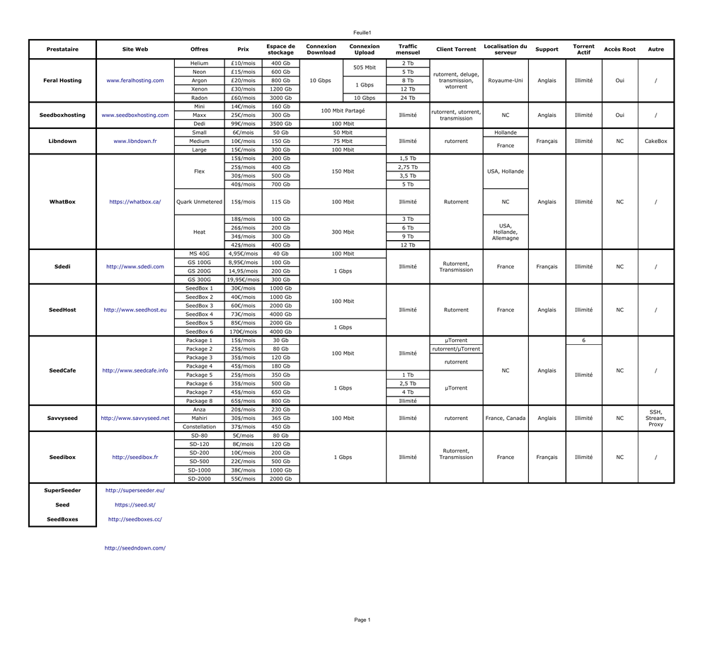 Feuille1 Prestataire Feral Hosting Seedboxhosting Libndown Site Web www.feralhosting.com www.seedboxhosting.com www.libndown.fr Offres Prix Espace de stockage Helium £10/mois 400 Gb Neon £15/mois 600 Gb Argon £20/mois 800 Gb Xenon £30/mois 1200 Gb Radon £60/mois 3000 Gb Mini 14€/mois 160 Gb Maxx 25€/mois 300 Gb Dedi 99€/mois 3500 Gb 100 Mbit Small 6€/mois 50 Gb 50 Mbit Medium 10€/mois 150 Gb 75 Mbit Large 15€/mois 300 Gb 100 Mbit 15$/mois 200 Gb 25$/mois 400 Gb 30$/mois 500 Gb 40$/mois 700 Gb 15$/mois 115 Gb 18$/mois 100 Gb 26$/mois 200 Gb 34$/mois 300 Gb 42$/mois 400 Gb MS 40G 4,95€/mois 40 Gb GS 100G 8,95€/mois 100 Gb GS 200G 14,95/mois 200 Gb GS 300G 19,95€/mois 300 Gb SeedBox 1 30€/mois 1000 Gb SeedBox 2 40€/mois 1000 Gb SeedBox 3 60€/mois 2000 Gb SeedBox 4 73€/mois 4000 Gb SeedBox 5 85€/mois 2000 Gb SeedBox 6 170€/mois 4000 Gb Package 1 15$/mois 30 Gb Package 2 25$/mois 80 Gb Package 3 35$/mois 120 Gb Package 4 45$/mois 180 Gb Package 5 25$/mois 350 Gb Package 6 35$/mois 500 Gb Package 7 45$/mois 650 Gb Package 8 65$/mois 800 Gb Anza 20$/mois 230 Gb Mahiri 30$/mois 365 Gb Constellation 37$/mois 450 Gb SD-80 5€/mois 80 Gb SD-120 8€/mois 120 Gb SD-200 10€/mois 200 Gb SD-500 22€/mois 500 Gb SD-1000 38€/mois 1000 Gb SD-2000 55€/mois 2000 Gb Flex WhatBox https://whatbox.ca/ Quark Unmetered Heat Sdedi SeedHost SeedCafe Savvyseed Seedibox http://www.sdedi.com http://www.seedhost.eu http://www.seedcafe.info http://www.savvyseed.net http://seedibox.fr SuperSeeder http://superseeder.eu/ Seed https://seed.st/ SeedBoxes http://seedboxes.cc/ Connexion Download Connexion Upload 505 Mbit 10 Gbps 1 Gbps 10 Gbps 100 Mbit Partagé Traffic mensuel Client Torrent Localisation du serveur Support Torrent Actif Accès Root Autre rutorrent, deluge, transmission, wtorrent Royaume-Uni Anglais Illimité Oui / rutorrent, utorrent, transmission NC Anglais Illimité Oui / Français Illimité NC CakeBox Anglais Illimité NC / 2 Tb 5 Tb 8 Tb 12 Tb 24 Tb Illimité Hollande Illimité rutorrent France 1,5 Tb 2,75 Tb 150 Mbit USA, Hollande 3,5 Tb 5 Tb 100 Mbit Illimité Rutorrent NC 3 Tb USA, Hollande, Allemagne 6 Tb 300 Mbit 9 Tb 12 Tb 100 Mbit 1 Gbps Illimité Rutorrent, Transmission France Français Illimité NC / Illimité Rutorrent France Anglais Illimité NC / NC / 100 Mbit 1 Gbps µTorrent 100 Mbit Illimité 6 rutorrent/µTorrent rutorrent 1 Tb 2,5 Tb 1 Gbps 4 Tb NC Anglais Illimité µTorrent Illimité 100 Mbit Illimité rutorrent France, Canada Anglais Illimité NC SSH, Stream, Proxy 1 Gbps Illimité Rutorrent, Transmission France Français Illimité NC / http://seedndown.com/ Page 1