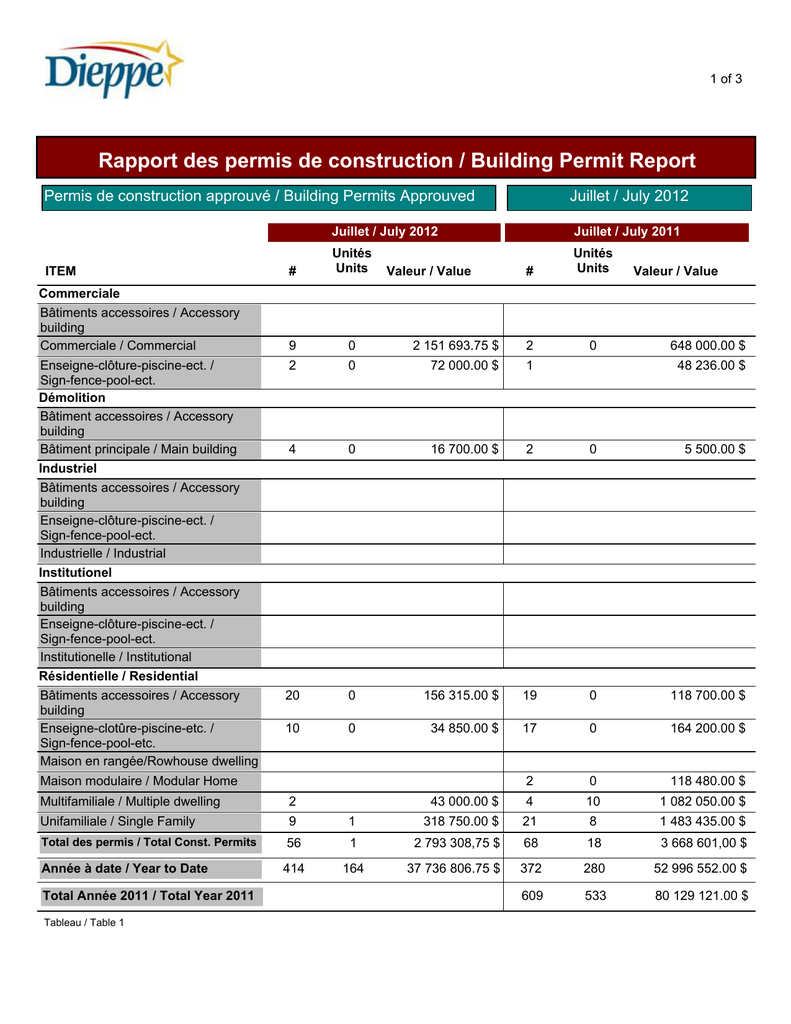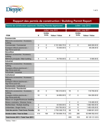 1 of 3 Rapport des permis de construction / Building Permit Report Permis de construction approuvé / Building Permits Approuved ITEM Commerciale Bâtiments accessoires / Accessory building Commerciale / Commercial Enseigne-clôture-piscine-ect. / Sign-fence-pool-ect. Démolition Bâtiment accessoires / Accessory building Bâtiment principale / Main building Juillet / July 2012 Juillet / July 2012 Juillet / July 2011 # Unités Units # Unités Units 9 0 2 151 693.75 $ 2 0 2 0 72 000.00 $ 1 4 0 16 700.00 $ 2 0 5 500.00 $ 20 0 156 315.00 $ 19 0 118 700.00 $ 10 0 34 850.00 $ 17 0 164 200.00 $ 2 0 118 480.00 $ 43 000.00 $ 4 10 1 082 050.00 $ Valeur / Value Valeur / Value 648 000.00 $ 48 236.00 $ Industriel Bâtiments accessoires / Accessory building Enseigne-clôture-piscine-ect. / Sign-fence-pool-ect. Industrielle / Industrial Institutionel Bâtiments accessoires / Accessory building Enseigne-clôture-piscine-ect. / Sign-fence-pool-ect. Institutionelle / Institutional Résidentielle / Residential Bâtiments accessoires / Accessory building Enseigne-clotûre-piscine-etc. / Sign-fence-pool-etc. Maison en rangée/Rowhouse dwelling Maison modulaire / Modular Home Multifamiliale / Multiple dwelling 2 Unifamiliale / Single Family 9 1 318 750.00 $ 21 8 1 483 435.00 $ Total des permis / Total Const. Permits 56 1 2 793 308,75 $ 68 18 3 668 601,00 $ 414 164 37 736 806.75 $ 372 280 52 996 552.00 $ 609 533 80 129 121.00 $ Année à date / Year to Date Total Année 2011 / Total Year 2011 Tableau / Table 1 2 of 3 Rapport des permis de construction / Building Permit Report Juillet / July 2012 Juillet / July 2012 # Unités Units Commerciale 11 0 Démolition 4 0 ITEM Année / Year to Date # Unités Units 2 223 693.75 $ 72 1 13 315 276.75 $ 16 700.00 $ 15 0 107 358.00 $ 3 0 156 125.00 $ 324 163 Valeur / Value Valeur / Value Industriel Institutionel Résidentielle / Residential 41 1 552 915.00 $ 24 158 047.00 $ Tableau / Table 2 État Comparatif des Quinze Dernières Années / Fifteen-Year Comparative Statement Juillet / July 2012 # Unités Units Juillet / July 1997 47 19 Juillet / July 1998 60 Juillet / July 1999 Année / Year to Date # Unités Units 2 916 586.00 $ 242 106 18 684 426.00 $ 45 3 286 022.00 $ 224 128 12 695 993.00 $ 47 32 2 897 550.00 $ 269 186 14 824 325.00 $ Juillet / July 2000 49 27 2 639 000.00 $ 259 156 15 052 000.00 $ Juillet / July 2001 57 12 5 004 540.00 $ 268 174 22 555 590.66 $ Juillet / July 2002 53 25 2 679 253.40 $ 299 172 20 069 799.21 $ Juillet / July 2003 59 48 6 858 475.50 $ 352 274 29 977 441.68 $ Juillet / July 2004 65 39 5 794 841.69 $ 375 233 28 912 172.23 $ Juillet / July 2005 65 27 6 330 329.81 $ 376 224 39 106 125.96 $ Juillet / July 2006 84 47 6 146 135.58 $ 407 369 47 251 659.89 $ Juillet / July 2007 83 50 6 271 954.02 $ 398 228 38 585 882.43 $ Juillet / July 2008 87 26 4 216 937.64 $ 427 219 45 182 102.53 $ Juillet / July 2009 85 126 19 363 357.00 $ 371 291 44 617 633.84 $ Juillet / July 2010 82 114 11 648 498.00 $ 421 368 45 906 640.00 $ Juillet / July 2011 68 18 3 668 601.00 $ 372 280 52 996 552.00 $ Juillet / July 2012 56 1 2 793 308.75 $ 414 164 37 736 806.75 $ Mois & Année / Month & Year Tableau / Table 3 Valeur / Value Valeur / Value 3 of 3 Rapport des constructions par unités créées Construction année 2012 Commerciale / Commercial Maison modulaire / Modular Home Multifamiliale / Multiple dwelling Janvier 3 Mars Avril Unifamiliale / Single Family 1 Mai 1 Juin 10 3 50 18 43 16 10 8 Juillet 1 Août 1 Total Unités 1 41 2 4 154 53 Tableau / Table 4 Total final pour l'année: 210 Rapport des constructions par unités créées Construction année 2011 Commerciale / Commercial Maison modulaire / Modular Home Multifamiliale / Multiple dwelling Février Unifamiliale / Single Family 1 Mars 28 13 2 33 13 Mai 2 73 13 Juin 1 72 10 10 8 Avril 1 Juillet 42 7 Septembre Août 1 30 20 Octobre 1 49 10 8 5 76 1 Novembre Décembre Total unités 1 2 2 9 421 101 Tableau / Table 5 Total final pour l'année: 533