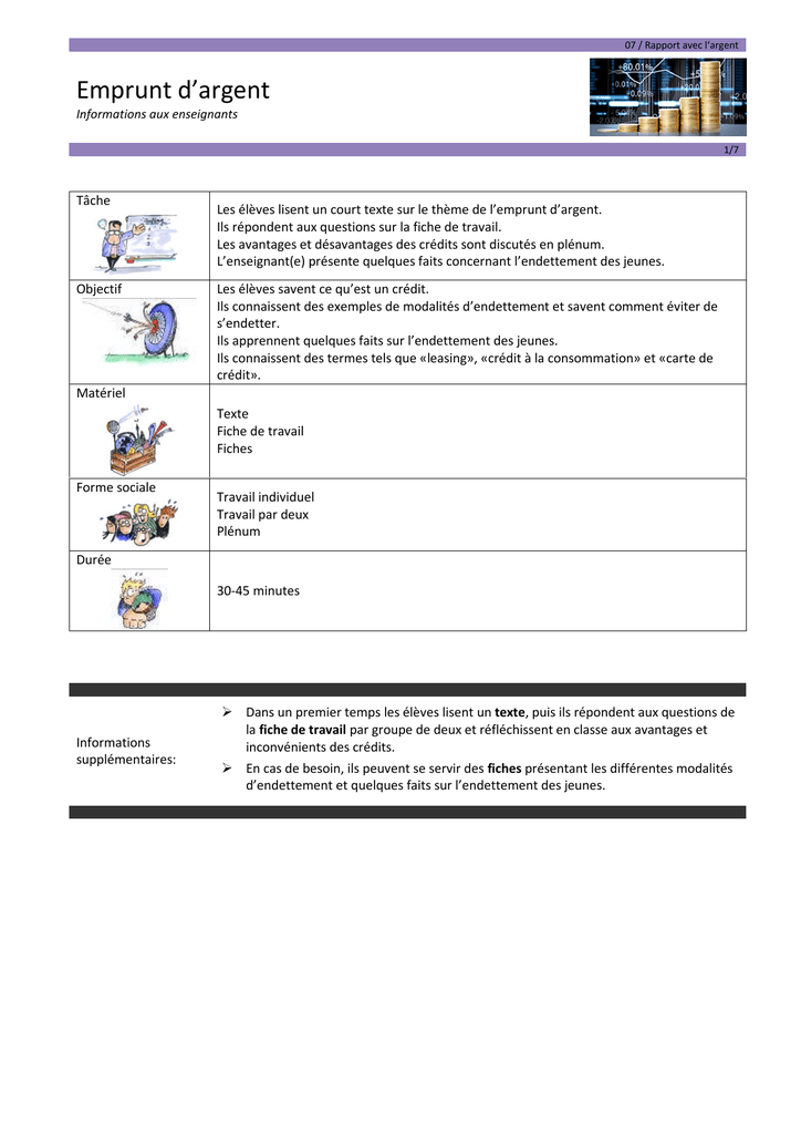 07 / Rapport avec l‘argent Emprunt d’argent Informations aux enseignants 1/7 Tâche Objectif Les élèves lisent un court texte sur le thème de l’emprunt d’argent. Ils répondent aux questions sur la fiche de travail. Les avantages et désavantages des crédits sont discutés en plénum. L’enseignant(e) présente quelques faits concernant l’endettement des jeunes. Les élèves savent ce qu’est un crédit. Ils connaissent des exemples de modalités d’endettement et savent comment éviter de s’endetter. Ils apprennent quelques faits sur l’endettement des jeunes. Ils connaissent des termes tels que «leasing», «crédit à la consommation» et «carte de crédit». Matériel Texte Fiche de travail Fiches Forme sociale Travail individuel Travail par deux Plénum Durée 30-45 minutes Informations supplémentaires: Dans un premier temps les élèves lisent un texte, puis ils répondent aux questions de la fiche de travail par groupe de deux et réfléchissent en classe aux avantages et inconvénients des crédits. En cas de besoin, ils peuvent se servir des fiches présentant les différentes modalités d’endettement et quelques faits sur l’endettement des jeunes. 07 / Rapport avec l‘argent Emprunt d’argent Informations aux enseignants 2/7 Fiche Montrer cette fiche aux élèves pour leur donner différents exemples de modalités d’endettement. Alternative: laisser les élèves trouver individuellement ou par groupe de deux des exemples illustrant ce qu’est le piège de l’endettement. Emprunt d’argent: le piège de l’endettement et ses différentes facettes 1. Crédit à la consommation Il s’agit d’un crédit qui permet d’acheter des biens de consommation, par ex. un smartphone dernier cri, ou de s’offrir quelque chose de particulier, par ex. un beau voyage. L’argent nécessaire n’a pas été épargné, mais on désire tout de même réaliser son souhait. Les crédits à la consommation impliquent automatiquement des intérêts qui pèsent sur le budget. 2. Leasing Il s’agit d’une sorte de «location» ou d’achat par tranches. Cette modalité d’achat est très fréquente pour le secteur automobile. Au lieu d’acheter en une fois une voiture chère, le consommateur paie par tranches mensuelles sur une durée allant souvent jusqu’à plusieurs années. Ces tranches semblent parfois représenter une somme raisonnable, mais elles creusent de relativement gros trous dans le porte-monnaie, puisqu’elles tombent chaque mois! Selon le type de leasing, la voiture n’appartient pas forcément au consommateur une fois le contrat terminé. A la fin du contrat de leasing, il reste souvent encore une somme à payer pour devenir propriétaire du véhicule. 3. Cartes de crédit Les cartes de crédit peuvent également mener les consommateurs à l’endettement. Le problème est que l’on peut dépenser de l’argent jusqu’à la limite de la carte de crédit sans s’en «rendre compte». Ce n’est qu’à la fin du mois que la facture tombe. L’argent disponible sur le compte est-il alors suffisant? 4. Contrats à long terme Les contrats, par exemple pour un nouveau téléphone portable, peuvent engendrer des dépenses élevées sur une longue durée. Dans certains cas, il arrive même que les dépenses liées au contrat aillent en augmentant. Là aussi les factures tombent tous les mois, comme pour un leasing, et alourdissent le budget. 07 / Rapport avec l‘argent Emprunt d’argent Informations aux enseignants 3/7 Fiche Montrer cette fiche aux élèves pour clore la leçon. Possibilité de discuter des faits en classe. Quelques faits concernant l’endettement des jeunes 17% des jeunes ont un comportement d’achat qui relève de la dépendance 55% des jeunes sont menacés par l’endettement. 38% des jeunes ne peuvent pas payer leurs factures. 80% des jeunes surendettés contractent leurs dettes avant 25 ans; la plus grosse partie est contractée entre les 18e et 19e anniversaires. L’endettement moyen s’élève à CHF 500.-; ce montant est supérieur à CHF 2000.- pour 10% des jeunes et peut s’élever à plus de CHF 120 000.- dans certains cas extrêmes. 25% des jeunes endettées ont plus de CHF 2500.- de dettes. 63% des jeunes endettés âgés de 20 ans ou moins sont des femmes. Les créanciers sont avant tout les parents. 37% des jeunes endettés dont l’âge se situe entre 18 et 25 ans ont encore au minimum une créance (recouvrement) en cours cinq ans après leur premier endettement. Sources: Haute école spécialisée du Nord-Ouest de la Suisse 2007, Université de Zurich (2010), Intrum Justitia (2012) 07 / Rapport avec l‘argent Emprunt d’argent Texte, fiche de travail 4/7 Devoir: Lire le texte relatif à l’emprunt d’argent. Surligner les mots nouveaux et les notions importantes. Emprunt d’argent Emprunt et crédit Lorsque tu empruntes de l’argent à quelqu’un, cela se passe essentiellement de deux manières. Soit tu reçois un prêt d’un privé, soit tu demandes un crédit auprès d’une institution de crédit, par ex. une banque. Lorsqu’un privé te prête CHF 1000.- sous forme de prêt sans intérêts, tu devras lui rembourser CHF 1000.-. Pour un crédit, les choses se passent différemment : en plus du remboursement de la somme empruntée, tu dois payer des intérêts au créancier - personne ou une entreprise - qui t’a accordé le crédit. Il s’agit d’une sorte de «location» que tu paies en contrepartie du droit d’utiliser l’argent du créancier. Voici un exemple: pour une demande de crédit de CHF 1000.avec un taux d’intérêt fixé à 8%, tu devras au créancier CHF 1080.- après un an, soit CHF 80.- de plus que ce que tu as emprunté un an auparavant. Parfois, le remboursement se fait par tranches. Tu peux ainsi rembourser par étapes l’argent emprunté, par ex. une fois par mois ou quatre fois par année. Contraction de dettes Emprunter de l’argent a toujours un revers. Cela équiv
