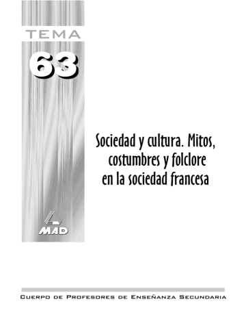 TEMA 63 Sociedad y cultura. Mitos, costumbres y folclore en la sociedad francesa Cuerpo de Profesores de Enseñanza Secundaria Temario sintetizado. Volumen II PLAN DU THÈME INTRODUCTION 1. LA VIE NATIONALE 1.1. France, terre d’accueil 1.2. La vie politique 1.3. L’enseignement 1.4. Les médias 2. LA VIE QUOTIDIENNE 2.1. La famille 2.2. Une nouvelle conception du mariage 2.3. Environnement et consommation 2.4. Divertissements et loisirs 2.5. Le sport, en pratique et à la télévision 3. FÊTES ET TRADITIONS 3.1. Les fêtes religieuses 3.2. Carnaval ou pelote basque 3.3. Folklore et sons et lumières 4. DE L’ART D’ÊTRE FRANÇAIS 4.1. La mode 4.2. Le patrimoine 4.3. Le caractère français 4.4. L’argent ne fait pas le bonheur... 4.5. L’instinct de propriété 5. LA GASTRONOMIE 5.1. Les différentes cuisines françaises 5.2. Du nord au sud de la France BIBLIOGRAPHIE 4 CUERPO DE PROFESORES DE ENSEÑANZA SECUNDARIA Sociedad y cultura INTRODUCTION Nous allons traiter dans ce sujet la société et la culture française. Il s’agit là d’une gamme très ample de notions qu’il est évidemment difficile de résumer en quelques lignes. Par conséquent, notre intention ici est d’en donner les grandes lignes et de parler des points essentiels qui définissent la société française. Tout d’abord, nous parlerons de la vie nationale, c’est-à-dire ce qu’est la France en tant que nation, la vie quotidienne qui permettra de mieux connaître la caractère français. Par la suite, nous mentionnerons les fêtes et traditions françaises et enfin des éléments qui font de la France un pays internationalement connu: la mode et la gastronomie. 1. LA VIE NATIONALE 1.1. France, terre d’accueil Les philosophes du XVIIIe siècle prêchaient déjà la justice sociale et le respect des droits de l’homme. La Révolution française puis l’Empire ont répandu en Europe leurs idées de liberté et d’égalité. Si la guerre d’Indépendance des Etats-Unis avait déjà énoncé les principes sur lesquels doivent se fonder les relations entre les hommes, la Déclaration des droits de l’homme du 26 août 1789 les a donnés au monde. La France a pour elle de posséder une tradition de terre d’accueil. Elle n’a jamais cessé de la mettre en oeuvre pour les réfugiés de tous les pays. À partir des années 60, l’afflux massif de travailleurs étrangers a encore fait croître le chiffre de l’immigration. Depuis 1973, les entrées des immigrés ont été régulées. La France reste cependant le pays d’Europe qui reçoit le plus d’étrangers. Voici un nouveau défi pour le peuple français: réussir ce melting-pot culturel en offrant une politique d’assimilation, tout en ayant le respect de chacun. 1.2. La vie politique Deux tendances prédominent en France depuis le début de la Ve République: la gauche socialiste qui gouverne à partir de 1981 après vingt-trois ans d’absence, et la droite libérale ou gaulliste, composée de divers mouvements, le RPR, l’UDF, dans laquelle on retrouve plusieurs partis de droite et du centre. A l’heure actuelle ils sont rassemblés sous l’UMP, l’Union Majoritaire Présidentielle, parti créé au lendemain du premier tour des élections présidentielles où la France s’est vu menacée par l’accroissement spectaculaire du parti d’extrême droite de Jean-Marie Le Pen. Ce parti représente la réaction et l’Union de divers partis de droite et du centre pour vaincre au deuxième tour. Avec la conjoncture internationale actuelle, ces courants politiques, une fois au pouvoir, sont devenus pragmatiques, ce qui peut donner l’impression que les vieilles querelles françaises entre gauche et droite sont aujourd’hui révolues. Beaucoup de Français se désengagent de la FRANCÉS 5 Temario sintetizado. Volumen II politique, las de ce clivage gauche/droite, et recherchent des hommes proches du concret pour résoudre la crise économique, le chômage et l’inflation. Le relatif succès du parti écologiste est le résultat de ce compromis. Les partis d’extrême gauche et le parti communiste restent marginaux, tout comme l’extrême droite et le Front national, même si les récentes élections nationales et européennes ont donné à ce dernier un certain crédit. 1.3. L’enseignement Depuis une vingtaine d’années, le système d’éducation français a connu toute une série de réformes. Aujourd’hui, il présente quatre degrés. L’école maternelle, en plein essor, reçoit près de 2,5 millions d’enfants. À deux ans, un enfant sur trois est à la maternelle. L’enseignement primaire dure cinq ans; il est également en plein accroissement, moins par la croissance démographique, faible, que par l’essor du taux de scolarisation. Le secondaire dure sept ans; il est sanctionné par le baccalauréat, visa nécessaire à l’entrée dans les universités et les grandes écoles. L’école étant obligatoire jusqu’à seize ans, beaucoup d’élèves quittent l’enseignement secondaire après quatre ans pour suivre un enseignement spécialisé. Les parents peuvent choisir pour leurs enfants des écoles publiques ou privées. Les Français sont favorables à la cohabitation des deux systèmes. Si les écoles privées coûtent plus cher que les lycées publics, leur image est assez bonne. Un élève sur six, pour les trois premiers niveaux d’enseignement, est dans le privé. Le baccalauréat d’enseignement général ne prépare pas directement à un métier mais permet aux jeunes de poursuivre leurs études dans l’enseignement supérieur. La majorité se dirigent vers les universités d’État (la part du privé dans l’enseignement supérieur est très faible), dont l’enseignement est pratiquement gratuit. Face à ces universités, la voie des grandes écoles est plus difficile. Pour y être admis, le baccalauréat et deux années de préparation sont nécessaires avant un concours d’entrée. Polytechnique, C