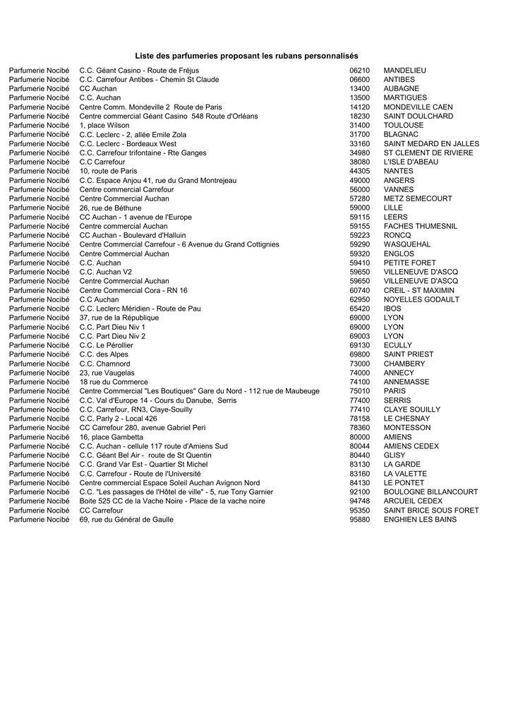Liste des parfumeries proposant les rubans personnalisés Parfumerie Nocibé Parfumerie Nocibé Parfumerie Nocibé Parfumerie Nocibé Parfumerie Nocibé Parfumerie Nocibé Parfumerie Nocibé Parfumerie Nocibé Parfumerie Nocibé Parfumerie Nocibé Parfumerie Nocibé Parfumerie Nocibé Parfumerie Nocibé Parfumerie Nocibé Parfumerie Nocibé Parfumerie Nocibé Parfumerie Nocibé Parfumerie Nocibé Parfumerie Nocibé Parfumerie Nocibé Parfumerie Nocibé Parfumerie Nocibé Parfumerie Nocibé Parfumerie Nocibé Parfumerie Nocibé Parfumerie Nocibé Parfumerie Nocibé Parfumerie Nocibé Parfumerie Nocibé Parfumerie Nocibé Parfumerie Nocibé Parfumerie Nocibé Parfumerie Nocibé Parfumerie Nocibé Parfumerie Nocibé Parfumerie Nocibé Parfumerie Nocibé Parfumerie Nocibé Parfumerie Nocibé Parfumerie Nocibé Parfumerie Nocibé Parfumerie Nocibé Parfumerie Nocibé Parfumerie Nocibé Parfumerie Nocibé Parfumerie Nocibé Parfumerie Nocibé Parfumerie Nocibé Parfumerie Nocibé Parfumerie Nocibé C.C. Géant Casino - Route de Fréjus C.C. Carrefour Antibes - Chemin St Claude CC Auchan C.C. Auchan Centre Comm. Mondeville 2 Route de Paris Centre commercial Géant Casino 548 Route d'Orléans 1, place Wilson C.C. Leclerc - 2, allée Emile Zola C.C. Leclerc - Bordeaux West C.C. Carrefour trifontaine - Rte Ganges C.C Carrefour 10, route de Paris C.C. Espace Anjou 41, rue du Grand Montrejeau Centre commercial Carrefour Centre Commercial Auchan 26, rue de Béthune CC Auchan - 1 avenue de l'Europe Centre commercial Auchan CC Auchan - Boulevard d'Halluin Centre Commercial Carrefour - 6 Avenue du Grand Cottignies Centre Commercial Auchan C.C. Auchan C.C. Auchan V2 Centre Commercial Auchan Centre Commercial Cora - RN 16 C.C Auchan C.C. Leclerc Méridien - Route de Pau 37, rue de la République C.C. Part Dieu Niv 1 C.C. Part Dieu Niv 2 C.C. Le Pérollier C.C. des Alpes C.C. Chamnord 23, rue Vaugelas 18 rue du Commerce Centre Commercial "Les Boutiques" Gare du Nord - 112 rue de Maubeuge C.C. Val d'Europe 14 - Cours du Danube, Serris C.C. Carrefour, RN3, Claye-Souilly C.C. Parly 2 - Local 426 CC Carrefour 280, avenue Gabriel Peri 16, place Gambetta C.C. Auchan - cellule 117 route d'Amiens Sud C.C. Géant Bel Air - route de St Quentin C.C. Grand Var Est - Quartier St Michel C.C. Carrefour - Route de l'Université Centre commercial Espace Soleil Auchan Avignon Nord C.C. "Les passages de l'Hôtel de ville" - 5, rue Tony Garnier Boite 525 CC de la Vache Noire - Place de la vache noire CC Carrefour 69, rue du Général de Gaulle 06210 06600 13400 13500 14120 18230 31400 31700 33160 34980 38080 44305 49000 56000 57280 59000 59115 59155 59223 59290 59320 59410 59650 59650 60740 62950 65420 69000 69000 69003 69130 69800 73000 74000 74100 75010 77400 77410 78158 78360 80000 80044 80440 83130 83160 84130 92100 94748 95350 95880 MANDELIEU ANTIBES AUBAGNE MARTIGUES MONDEVILLE CAEN SAINT DOULCHARD TOULOUSE BLAGNAC SAINT MEDARD EN JALLES ST CLEMENT DE RIVIERE L'ISLE D'ABEAU NANTES ANGERS VANNES METZ SEMECOURT LILLE LEERS FACHES THUMESNIL RONCQ WASQUEHAL ENGLOS PETITE FORET VILLENEUVE D'ASCQ VILLENEUVE D'ASCQ CREIL - ST MAXIMIN NOYELLES GODAULT IBOS LYON LYON LYON ECULLY SAINT PRIEST CHAMBERY ANNECY ANNEMASSE PARIS SERRIS CLAYE SOUILLY LE CHESNAY MONTESSON AMIENS AMIENS CEDEX GLISY LA GARDE LA VALETTE LE PONTET BOULOGNE BILLANCOURT ARCUEIL CEDEX SAINT BRICE SOUS FORET ENGHIEN LES BAINS