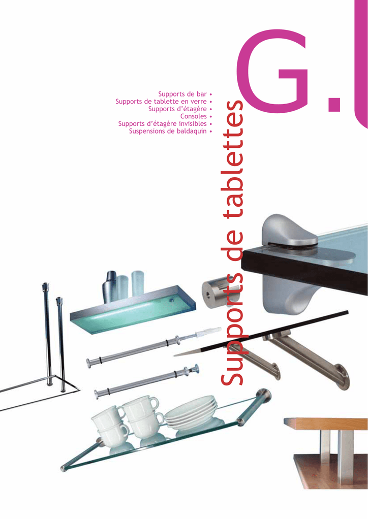 • • • • • • G. Supports de tablettes Supports de bar Supports de tablette en verre Supports d’étagère Consoles Supports d’étagère invisibles Suspensions de baldaquin : (02)529 50 50 : (02)524 22 24 : [email protected] www.bermabru.be Exécution Code Prix/€ alu chromé chromé mat inox 4405-1000 4405-1200 4405-1600 4405-1900 49,00 54,00 56,00 58,00 chromé chromé mat inox 4405-4200 4405-4600 4405-4900 21,50 22,50 28,00 chromé chromé mat inox 4405-5200 4405-5600 4405-5900 58,00 59,00 69,00 chromé chromé mat inox 4405-4200 4405-4600 4405-4900 21,50 22,50 28,00 chromé chromé mat inox 4405-6200 4405-6600 4405-6900 57,00 58,00 73,00 chromé chromé mat inox 4405-4200 4405-4600 4405-4900 21,50 22,50 28,00 tablette en verre 1100 x 400 mm + adaptateur pour verre 4406-2109 331,00 tablette en verre ø 550 mm + adaptateur pour verre 4406-2409 136,00 SUPPORTS DE BAR RONDS Droit Pour tablette en bois ou en verre. ø: 45 mm H: 195 mmur l'emploi avec une tablette en 195 OPTION Adaptateur pour verre ø 90 mm ø 45 SUPPORTS DE BAR RONDS Bari Pour tablette en bois ou en verre. ø: 45 mm H: 210 mm OPTION Adaptateur pour verre ø 90 mm ø 90 ø 45 210 Supports de tablettes KiBermabru tchen ° 60 ø 8,5 SUPPORTS DE BAR RONDS Brindisi Pour tablette en bois ou en verre. ø: 45 mm, H: 180 mm 180 ø 90 45 45° 180 ø OPTION Adaptateur pour verre ø 90 mm SUPPORTS DE BAR RONDS Tablette en verre 1100 600 G. 2 400 180 ø 550 Tablette en verre avec adaptateurs pour verre précollés convient pour les supports de bar ronds. R 20 Sous réserve de changement de prix et modèle. Prix particulier, TVA comprise. KITF1100 : (02)529 50 50 : (02)524 22 24 : [email protected] www.bermabru.be SUPPORTS DE BAR Elegance KiBermabru tchen Exécution Code Prix/€ chromé 4404-1200 80,00 320 mm 167 mm 36-46 mm JUMBO Support de bar Jumbo alu inox-look Option Adaptateur pour verre 4405-9600 4405-9900 81,00 85,00 4405-9909 82,00 Support de bar droit 80 x 80 mm Hauteur: 230 mm Peut être combiné avec les pieds de table Jumbo. Voir chapitre F. JUMBO Jumbo powerstation alu inox-look B 6341-7600 6341-7900 184,00 165,00 4405-9909 82,00 FR Option Adaptateur pour verre Support de bar droit 80 x 80 mm avec 2 prises de courant incorporées. Hauteur: 230 mm Peut être combiné avec les pieds de table Jumbo. Voir chapitre F. JUMBO Tablette en verre Jumbo 4406-2309 457,00 400 180 1100 600 R 20 Tablette en verre, avec côtés arrondis et adaptateurs pour verre précollés, convient pour les supports de bar Jumbo. Emballée par pièce. KITF1100 Prix particulier, TVA comprise. Sous réserve de changement de prix et modèle. G. 3 : (02)529 50 50 : (02)524 22 24 : [email protected] www.bermabru.be SUPPORTS DE BAR Exécution Code Prix/€ alu inox 4405-7600 4405-7900 26,00 52,00 Capri droit inox: pour tablette en bois ou en verre. max. 250 (adaptateur pour verre à commander séparément, voir option) alu: pour tablette en bois. 50 x 50 50 x 50 mm h: 190 mm Option 4405-7909 Adaptateur pour verre 65 x 65 x 4 mm Pour support de bar en inox. SUPPORTS DE BAR 190 Supports de tablettes KiBermabru tchen Capri incliné alu inox 46,00 4405-8600 4405-8900 62,00 79,00 4405-8909 31,00 4406-2209 347,00 Pour tablette en bois ou en verre. 50 x 50 mm h: 190 mm Option Adaptateur pour verre 65 x 65 x 4 mm Pour support de bar en inox. SUPPORTS DE BAR Tablette en verre Capri 400 180 1100 600 Tablette en verre, avec adaptateurs pour verre précollés, convient pour les supports de bar capri. R 20 SUPPORTS DE BAR Pour fixation horizontale alu 4404-0000 36,00 170 mm 270 mm 140 mm 100 mm SUPPORTS DE BAR alu 4404-0050 G. 4 Sous réserve de changement de prix et modèle. 100 mm 322,5 mm 150 mm 36,00 40 mm Pour fixation verticale Prix particulier, TVA comprise. KITF1100 : (02)529 50 50 : (02)524 22 24 : [email protected] www.bermabru.be KiBermabru tchen TABLETTES LUMINEUSES TABLETTES LUMINEUSES EN LED VOIR CHAPITRE A. KITF1100 Prix particulier, TVA comprise. Sous réserve de changement de prix et modèle. G. 5 Supports de tablettes KiBermabru tchen : (02)529 50 50 : (02)524 22 24 : [email protected] www.bermabru.be SUPPORTS POUR TABLETTE EN BOIS ET EN VERRE Exécution Code Prix/€ alu-look chromé inox-look 4403-8030 4403-8230 4403-8930 10,50 11,00 12,30 4403-8020 4403-8220 4403-8920 15,50 17,00 18,00 4403-8000 4403-8200 4403-8500 4403-8700 4403-8900 19,50 21,50 21,50 19,50 26,00 gris argent chromé doré blanc inox-look 4403-8010 4403-8210 4403-8510 4403-8710 4403-8910 9,30 11,00 11,00 9,30 14,00 inox-look laiton poli 4025-3618 4025-3818 8,70 9,10 ø 25 mm: pour vitre d' épaisseur max. de 8 mm inox-look laiton poli 4025-3625 4025-3825 12,00 12,50 ø 40 mm: pour vitre d' épaisseur max. de 12 mm inox-look laiton poli 4025-3640 4025-3840 33,00 33,00 4025-2200 4025-2800 3,40 3,00 Navy mini Réglable en hauteur (6-18 mm) et fourni avec le matériel de fixation. Min. 1 paire SUPPORTS POUR TABLETTE EN BOIS ET EN VERRE Navy mini alu-look chromé inox-look Réglable en hauteur (20-40 mm) et fourni avec le matériel de fixation. Min. 1 paire SUPPORTS POUR TABLETTE EN BOIS ET EN VERRE Tucano maxi Réglable en hauteur et fourni avec le matériel de fixation. Charge maximale: 60 kg (max. 60 cm entre 2 supports) Profondeur max. tablette: 25 cm Epaisseur tablette: 4 à 36 mm paire gris argent chromé doré blanc inox-look SUPPORTS POUR TABLETTE EN BOIS ET EN VERRE Tucano mini Réglable en hauteur et fourni avec le matériel de fixation. Charge maximale: 20 kg. (max. 60 cm entre 2 supports) Profondeur max. tablette: 20 cm Epaisseur tablette: 5 à 16 mm Min. 1 paire SUPPORTS POUR TABLETTE EN BOIS ET EN VERRE Pince - glace ø 18 mm: pour vitre d' épaisseur max. de 6 mm SUPPORTS POUR TABLETTE EN BOIS ET EN VERRE Support pour tablette en verre chromé laiton Epaisseur maximale: 10 mm. Le support s'adapte à l'épaisseur de la tablette au moyen de la vis de blocage en nylon. G. 6 Sous réserve de changement de prix et modèle. Prix particulier, TVA comprise. KITF1100