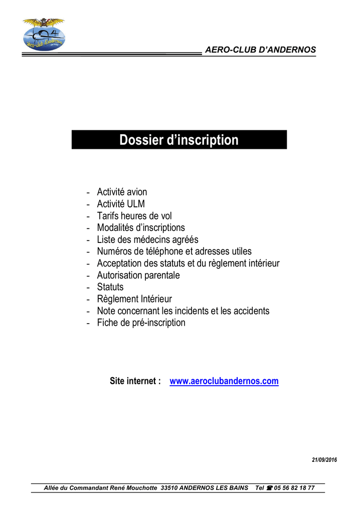 AERO-CLUB D’ANDERNOS Dossier d’inscription - Activité avion Activité ULM Tarifs heures de vol Modalités d’inscriptions Liste des médecins agréés Numéros de téléphone et adresses utiles Acceptation des statuts et du règlement intérieur Autorisation parentale Statuts Règlement Intérieur Note concernant les incidents et les accidents Fiche de pré-inscription Site internet : www.aeroclubandernos.com 21/09/2016 Allée du Commandant René Mouchotte 33510 ANDERNOS LES BAINS Tel 05 56 82 18 77 COMMENT APPRENDRE A PILOTER AVION Le but essentiel d’un aéro-club est de former des pilotes puis, à l’issue de leur formation, de mettre à leur disposition des avions d’entraînement ou de voyage. La démarche L’aéroclub assure la formation pour deux types de brevets : le PPL (Private Pilot Licence) et le BB (Brevet de Base). Pour ces deux brevets la démarche est sensiblement la même. La démarche type se caractérise par les étapes suivantes : première visite au club avec éventuellement un baptême ou un vol d’initiation, l’inscription au club, les premières leçons en vol, les cours théoriques et les examens. Le premier pas Le premier pas pour piloter est de passer à l’aéroclub, au cours de cette visite un membre vous présentera le déroulement de la formation. Suite à cette présentation vous pouvez prendre rendez-vous pour un baptême de l’air ou même un premier vol avec un instructeur (vol d'initiation). Maintenant il ne vous reste plus qu’a remplir les formalités administratives. Tout d’abord l’adhésion à l’aéroclub ainsi qu’à la Fédération Française aéronautique. Ensuite il faudra acheter le carnet de vol, un livret de progression et enfin le manuel du pilote privé qui contient les informations théoriques nécessaires à l’obtention du PPL. Enfin il faudra prendre rendez-vous auprès d’un médecin agréé aéronautique afin de passer une visite médicale. Les leçons en vol Il est maintenant temps de prendre les premières leçons en vols. Les leçons débutent par un briefing ou l’instructeur explique les points qui seront abordés pendant le vol. Les premiers vols ont pour but de prendre en main l’avion, on apprend donc comment monter, descendre, tourner puis progressivement la difficulté augmente il faut apprendre à atterrir. Une fois que ces leçon sont maitrisés vient le moment le plus marquant de la formation : le lâché. C’est un vol ou l’instructeur descend de l’avion et laisse l’élève pilote réaliser seul un tour de piste (un décollage suivi d’un circuit pour se poser). Ensuite viennent les vols de navigation, puis les navigations seul à bord. Et enfin vous êtes prêt pour passer le test final. Les cours théoriques La pratique c’est essentiel, mais la théorie … aussi. Les cours théoriques ont lieu souvent en week-end au club, quand la météo est mauvaise par exemple. Chaque leçon aborde un thème qu’il est important de connaître. Les cours théoriques sont gratuits et ouverts à tous les membres du club. Une grosse partie de la théorie est aussi dispensée lors de briefing long, avec votre instructeur, avant ou après une leçon en vol. Les examens Il y a deux types d’examens : le théorique et le pratique. L’examen théorique est un QCM d’un certain nombre de questions qu’il faut passer avant l’examen pratique. Une fois le théorique en poche, il faut passer l’examen pratique en vol avec un examinateur. Il s’agit d’un vol pendant lequel vous devrez démontrer tout ce que vous savez faire en toute sécurité. La suite… Une fois déclaré apte, vous pourrez voler dans le cadre de la licence ou du brevet. Cela suffit à certaines personnes, d’autres veulent aller plus loin : qualifications sur d’autres machines, vol de nuit, rallye aérien, voltige, vol aux instruments… LE BREVET DE BASE Le Brevet de base est le premier niveau de formation du pilote, accessible aux jeunes dès 15 ans. Il vous permet de voler seul à bord de l’avion sur lequel vous avez été formé, dans un rayon de 30 km autour de l’aérodrome, hors des espaces contrôlés ou réglementés. Des autorisations additionnelles telles que celle d’emport de passagers, d’évolution en zone contrôlée, atterrissage sur un aérodrome extérieur peuvent être délivrées par l’instructeur lorsqu’un niveau d’expérience seul à bord est atteint. Les conditions d’obtention sont : - Totaliser au moins 6 heures de vol en double commande et 4 heures de vol seul à bord ainsi que 20 atterrissages seul à bord. - Avoir 15 ans révolus le jour de l’examen en vue de l’obtention du brevet. - Subir avec succès les examens théoriques, pratiques et radio prévus par arrêtés. - Avoir passé la visite médicale auprès d’un médecin agréé aéronautique. Programme de formation : Pendant cette formation, votre instructeur sera chargé de votre progression et vous accompagnera pendant toute la durée de votre apprentissage. Les séances seront programmées en fonction de vos disponibilités, de celles de l’instructeur et de celles du matériel. Jusqu’à l’obtention du brevet de base, l’élève paiera le tarif double-commande pour toutes les heures effectuées à l'exception des vols solo supervisés par l’instructeur pour lesquels la part double commande ne sera facturée qu'à 50%. Vous alternerez : - Des séances de cours théoriques (gratuites et illimitées). - Les leçons de vol en double commande. - Le premier lâché en solo pour des tours de pistes. - Les vols en solo et en double commande. LE PPL (Licence de Pilote Privé) : Après votre brevet de base, à partir de 17 ans, vous pouvez obtenir la licence de pilote privé (PPL) qui permet de voyager et d’emporter sans rémunération des passagers sans limitation de distance. Les conditions d’obtention sont : - Totaliser au minimum 45 heures de vol, dont au moins : 25 heures de double commande, 10 heures de vol en sol