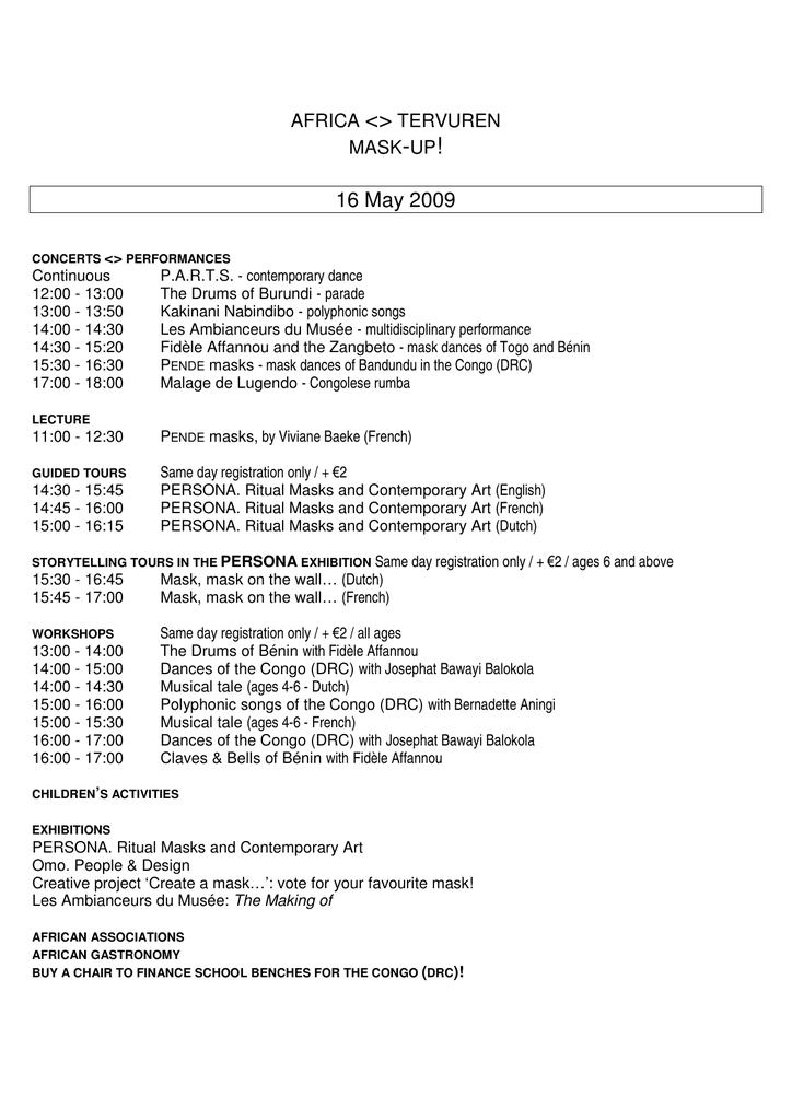 AFRICA <> TERVUREN MASK-UP! 16 May 2009 CONCERTS <> PERFORMANCES Continuous 12:00 - 13:00 13:00 - 13:50 14:00 - 14:30 14:30 - 15:20 15:30 - 16:30 17:00 - 18:00 LECTURE P.A.R.T.S. - contemporary dance The Drums of Burundi - parade Kakinani Nabindibo - polyphonic songs Les Ambianceurs du Musée - multidisciplinary performance Fidèle Affannou and the Zangbeto - mask dances of Togo and Bénin PENDE masks - mask dances of Bandundu in the Congo (DRC) Malage de Lugendo - Congolese rumba 11:00 - 12:30 PENDE masks, by Viviane Baeke (French) GUIDED TOURS Same day registration only / + 2 PERSONA. Ritual Masks and Contemporary Art (English) PERSONA. Ritual Masks and Contemporary Art (French) PERSONA. Ritual Masks and Contemporary Art (Dutch) 14:30 - 15:45 14:45 - 16:00 15:00 - 16:15 Same day registration only / + 2 / ages 6 and above Mask, mask on the wall… (Dutch) Mask, mask on the wall… (French) STORYTELLING TOURS IN THE PERSONA EXHIBITION 15:30 - 16:45 15:45 - 17:00 WORKSHOPS 13:00 - 14:00 14:00 - 15:00 14:00 - 14:30 15:00 - 16:00 15:00 - 15:30 16:00 - 17:00 16:00 - 17:00 Same day registration only / + 2 / all ages The Drums of Bénin with Fidèle Affannou Dances of the Congo (DRC) with Josephat Bawayi Balokola Musical tale (ages 4-6 - Dutch) Polyphonic songs of the Congo (DRC) with Bernadette Aningi Musical tale (ages 4-6 - French) Dances of the Congo (DRC) with Josephat Bawayi Balokola Claves & Bells of Bénin with Fidèle Affannou CHILDREN’S ACTIVITIES EXHIBITIONS PERSONA. Ritual Masks and Contemporary Art Omo. People & Design Creative project ‘Create a mask…’: vote for your favourite mask! Les Ambianceurs du Musée: The Making of AFRICAN ASSOCIATIONS AFRICAN GASTRONOMY BUY A CHAIR TO FINANCE SCHOOL BENCHES FOR THE CONGO (DRC)! 17 May 2009 CONCERTS <> PERFORMANCES Continuous 12:00 - 12:15 12:15 - 12:30 12:30 - 13:30 13:45 - 14:15 14:15 - 14:45 14:45 - 15:45 15:30 - 16:30 15:45 - 16:00 16:00 - 16:45 17:00 - 18:30 GUIDED TOURS 14:30 - 15:45 14:45 - 16:00 15:30 - 16:45 P.A.R.T.S. - contemporary dance Les Ambianceurs du Musée - multidisciplinary performance Just Dance - urban dance PENDE masks - mask dances of Bandundu in the Congo (DRC) Antwerp Kids Song - young talents Trio-Compagny - young talents PENDE masks - mask dances of Bandundu in the Congo (DRC) Dounia - variety show - for ages 8 and above (French) Simb: The Ritual of the False Lion - Sénégal Creative project prize awards: ‘Create a mask…’ accompanied by vocal trio Sylvie Nawasadio, Nicole Letuppe and Freddy Massamba Dobet Gnahoré - in concert with her new album Na Afriki Same day registration only / + 2 PERSONA. Ritual Masks and Contemporary Art (English) PERSONA. Ritual Masks and Contemporary Art (French) PERSONA. Ritual Masks and Contemporary Art (Dutch) Same day registration only / + 2 / ages 6 and above Mask, mask on the wall… (Dutch) Mask, mask on the wall… (French) STORYTELLING TOURS IN THE PERSONA EXHIBITION 15:30 - 16:45 15:45 - 17:00 WORKSHOPS 13:00 - 14:00 13:00 - 14:00 13:30 - 14:00 14:00 - 15:00 14:30 - 15:00 15:00 - 16:00 15:30 - 16:30 15:30 - 16:30 15:30 - 16:00 16:30 - 17:00 Same day registration only / + 2 / all ages Dance! with Sidonie Madoki Percussion Instruments of the Congo (DRC) with Josephat Bawayi Balokola Musical tale (ages 4-6 - Dutch) Claves & Bells of Bénin with Fidèle Affannou Musical tale (ages 4-6 - French) Dance! With Sidonie Madoki Dances of the Congo (DRC) with Josephat Bawayi Balokola Claves & Bells of Bénin with Fidèle Affannou Musical tale (ages 4-6 - Dutch) Musical tale (ages 4-6 - French) CHILDREN’S ACTIVITIES EXHIBITIONS PERSONA. Ritual Masks and Contemporary Art Omo. People & Design Creative Project ‘Create a mask…’: vote for your favourite mask! Les Ambianceurs du Musée: The Making of AFRICAN ASSOCIATIONS AFRICAIN GASTRONOMY BUY A CHAIR TO FINANCE SCHOOL BENCHES FOR THE CONGO (DRC)!