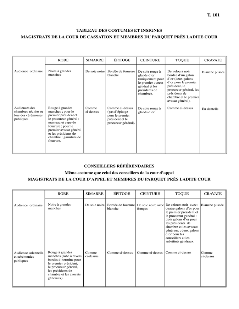 T. 101 TABLEAU DES COSTUMES ET INSIGNES MAGISTRATS DE LA COUR DE CASSATION ET MEMBRES DU PARQUET PRÈS LADITE COUR ROBE SIMARRE ÉPITOGE CEINTURE TOQUE CRAVATE Audience ordinaire Noire à grandes manches De soie noire Bordée de fourrure De soie rouge à blanche glands d’or (uniquement pour le premier avocat général et les présidents de chambre). De velours noir Blanche plissée bordée d’un galon d’or (deux galons d’or pour le premier président, le procureur général, les présidents de chambre et le premier avocat général). Audiences des chambres réunies et lors des cérémonies publiques Rouge à grandes manches ; pour le premier président et le procureur général : manteau et cape de fourrure ; pour le premier avocat général et les présidents de chambre : garniture de fourrure. Comme ci-dessus Comme ci-dessus Comme ci-dessus De soie rouge à (pas d’épitoge glands d’or pour le premier président et le procureur général). En dentelle CONSEILLERS RÉFÉRENDAIRES Même costume que celui des conseillers de la cour d’appel MAGISTRATS DE LA COUR D’APPEL ET MEMBRES DU PARQUET PRÈS LADITE COUR ROBE SIMARRE ÉPITOGE CEINTURE TOQUE CRAVATE Audience ordinaire Noire à grandes manches De soie noire Bordée de fourrure De soie noire avec De velours noir avec : Blanche plissée quatre galons d’or pour blanche franges le premier président et le procureur général ; trois galons d’or pour les présidents de chambre et les avocats généraux ; deux galons d’or pour les conseillers et les substituts généraux. Audience solennelle et cérémonies publiques Rouge à grandes manches (robe à revers bordés d’hermine pour le premier président, le procureur général, les présidents de chambre et les avocats généraux). Comme ci-dessus Comme ci-dessus Comme ci-dessus Comme ci-dessus Comme ci-dessus T. 102 MAGISTRATS DU TRIBUNAL SUPÉRIEUR D’APPEL ET MEMBRES DU PARQUET PRÈS LEDIT TRIBUNAL Président du tribunal supérieur d’appel et procureur de la République près cette juridiction, même costume que celui, respectivement, des conseillers de la cour d’appel et des substituts généraux. Vice-présidents, juges au tribunal supérieur d’appel et substituts du procureur de la République près cette juridiction, même costume que celui des magistrats du tribunal de grande instance et des membres du parquet près le tribunal de grande instance. (le reste sans changement) MAGISTRATS DU TRIBUNAL DE GRANDE INSTANCE ET DU TRIBUNAL D’INSTANCE ET MEMBRES DU PARQUET PRÈS LE TRIBUNAL DE GRANDE INSTANCE ROBE SIMARRE Audience ordinaire Noire à grandes manches Audience solennelle et cérémonies publiques Comme ci-dessus (robe rouge à grandes manches pour le président du tribunal de grande instance de Paris et le procureur de la République près cette juridiction). ÉPITOGE CEINTURE De soie noire Bordée de fourrure blanche Comme ci-dessus Comme ci-dessus De soie bleuclair avec franges (dans le ressort des cours d’appel de Paris et de Versailles : de soie noire avec franges). TOQUE CRAVATE De laine noire avec un galon d’argent (double galon d’argent pour le président et le procureur de la République). Blanche plissée Comme ci-dessus (même toque que celle des chefs de cour d’appel pour le président du tribunal de grande instance de Paris et le procureur de la République près cette juridiction). Comme ci-dessus AUDITEURS DE JUSTICE ROBE Noire à grandes manches SIMARRE CEINTURE TOQUE De soie noire De soie bleu-clair avec franges De laine noire avec galon d’argent CRAVATE Blanche plissée PRÉSIDENT ET JUGES DU TRIBUNAL DE COMMERCE ROBE Noire à grandes manches avec revers de velours (pour le président du tribunal de commerce de Paris, lors des audiences solennelles et cérémonies publiques : robe rouge avec des parements de velours noir). SIMARRE De soie noire TOQUE CRAVATE Blanche plissée Noire avec un galon d’argent (deux galons pour le président) T. 103 MEMBRES DES COMMISSIONS DE PREMIÈRE INSTANCE DE SÉCURITÉ SOCIALE Insigne métallique, dont les caractéristiques sont fixées par le garde des sceaux, ministre de la justice, et le ministre chargé de la sécurité sociale. MEMBRES DES CONSEILS DE PRUD’HOMME (Art. R. 512-12 du Code du travail) (Ancien art. R. 514-3 du Code du travail) (D. n. 79-1022, 23 nov. 1979, art. 1er et 11.) - Les membres du conseil de prud’hommes portent, soit à l’audience, soit dans les cérémonies publiques, suspendue à un ruban, en sautoir, une médaille signe de leurs fonctions. Cette médaille est en bronze doré pour le président du conseil de prud’hommes et, à l’audience, pour le président du bureau de jugement ; elle est en bronze argenté pour les autres conseillers. D’un module de 65 mm, elle porte à l’avers la mention de la République française et une tête symbolisant la République, placée de profil, tournée à droite. Au moyen d’une attache d’une largeur de 75 mm portant un rameau d’olivier, la médaille est suspendue à un ruban d’une largeur de 75 mm, divisé dans le sens vertical en deux parties égales, rouge et bleu. GREFFIERS EN CHEF, GREFFIERS ET SECRÉTAIRES-GREFFIERS JURIDICTION GRADE Cour de cassation Greffier en chef Cour d’appel Secrétaire-greffier Greffier en chef Tribunal de grande instance et tribunal d’instance Secrétaire-greffier Tribunal de commerce Secrétaire -greffier Greffier Commis-greffier assermenté Greffier en chef COSTUME Même costume que les conseillers de la Cour de cassation, sans or à la toque. Ceinture rouge à franges rouges. Robe noire sans simarre et toque noire. Même costume que les conseillers de la cour d’appel, sans galon à la toque. Robe noire sans simarre et toque noire. Même costume que les juges du tribunal de grande instance, sans galon à la toque. Robe noire sans simarre et toque noire. Même costume que les juges consulaires, sans galon à la toque. Robe noire sans simarre et toque noire.