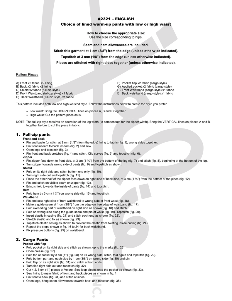 #2321 – ENGLISH Choice of lined warm-up pants with low or high waist How to choose the appropriate size: Use the size corresponding to hips. Seam and hem allowances are included. Stitch this garment at 1 cm (3/8") from the edge (unless otherwise indicated). Topstitch at 3 mm (1/8”) from the edge (unless otherwise indicated). Pieces are stitched with right sides together (unless otherwise indicated). Pattern Pieces A) Front x2 fabric x2 lining B) Back x2 fabric x2 lining C) Shield x2 fabric (full-zip style) D) Front Waistband (full-zip style) x1 fabric E) Back Waistband (full-zip style) x1 fabric F) G) H) I) Pocket flap x2 fabric (cargo style) Applied pocket x2 fabric (cargo style) Front Waistband (cargo style) x1 fabric Back waistband (cargo style) x1 fabric This pattern includes both low and high-waisted style. Follow the instructions below to create the style you prefer. • Low waist: Bring the HORIZONTAL lines on pieces A, B and C together. • High waist: Cut the pattern piece as is. NOTE: The full-zip style requires an alteration of the leg width (to compensate for the zipper width). Bring the VERTICAL lines on pieces A and B together before to cut the piece in fabric. 1. Full-zip pants Front and back • Pin and baste (or stitch at 3 mm (1/8’’) from the edge) lining to fabric (fig. 1), wrong sides together. • Pin front inseam to back inseam (fig. 2) and sew. • Open legs and topstitch (fig. 3). • Pin front and back crotches (fig. 4) and stitch. Clip curves (fig. 5) and topstitch (fig. 6). Zipper • Pin zipper face down to front side, at 3 cm (1 ¼’’) from the bottom of the leg (fig. 7) and stitch (fig. 8), beginning at the bottom of the leg. • Turn zipper towards wrong side of pants (fig. 9) and topstitch as shown. Shield • Fold on its right side and stitch bottom end only (fig. 10). • Turn right side out and topstitch (fig. 11). • Place the other half of the zipper face down on right side of back side, at 3 cm (1 ¼’’) from the bottom of the piece (fig. 12). • Pin and stitch on visible seam on zipper (fig. 13). • Bring shield towards the inside of pants (fig. 14) and topstitch. Hem • Fold hem by 3 cm (1 ¼’’) on wrong side (fig. 15) and topstitch. Waistband • Pin and sew right side of front waistband to wrong side of front waist (fig. 16). • Make a guide seam at 1 cm (3/8’’) from the edge on free edge of waistband (fig. 17). • Fold exceeding part of waistband on right side as shown (fig. 18) and stitch. • Fold on wrong side along the guide seam and pin at waist (fig. 19). Topstitch (fig. 20). • Insert elastic in casing (fig. 21) and stitch each end as shown (fig. 22). • Stretch elastic and fix as shown (fig. 23). • Topstitch elastic casing as shown to prevent the elastic from twisting inside casing (fig. 24). • Repeat the steps shown in fig. 16 to 24 for back waistband. • Fix pressure buttons (fig. 25) on waistband. 2. Cargo Pants INC. Pocket with flap • Fold pocket on its right side and stitch as shown, up to the marks (fig. 26). • Open crease (fig. 27). • Fold top of pocket by 3 cm (1’’) (fig. 28) on its wrong side, stitch, fold again and topstitch (fig. 29). • Fold bottom part and each side by 1 cm (3/8’’) on wrong side (fig. 30) and pin. • Fold flap on its right side (fig. 31) and stitch at both ends. • Turn flap right side out and topstitch (fig. 32). • Cut 4 2, 5 cm (1’’) pieces of Velcro. Sew loop pieces onto the pocket as shown (fig. 33). • Sew lining to main fabric of front and back pieces as shown in fig. 1. • Pin front to back (fig. 34) and stitch at sides. • Open legs, bring seam allowances towards back and topstitch (fig. 35). • Place wrong side of pocket on right side of side leg, where indicated (fig. 36) and topstitch. • Pin flap above the pocket (fig. 37) and stitch. • Fold flap on pocket and topstitch as shown (fig. 38). • Sew hook parts of the Velcro pieces onto the flap (fig. 39). • Bring legs right sides together (fig. 40) and sew at inner seam. Hem • Fold on wrong side by 3 cm (1 ¼’’) and stitch (fig. 41). Assembly • Insert one leg into the other, right sides together and sew at crotch (fig. 42). • Clip curves (fig. 39) and topstitch, taking in seam allowances (fig. 43). Waistband • Pin back and front pieces of waistband (fig. 44) and sew. • Make a guide seam at 1 cm (3/8’’) from one edge (fig. 45). • Place right side of waistband (edge without guide seam) on wrong side of waist (fig. 46) and sew. • Bring the free edge of waistband towards right side of pants, folding it along the guide seam (fig. 47). Pin and topstitch (fig. 48), leaving a 2,5 cm (1’’) opening for inserting the elastic. • Insert elastic into casing, close opening (fig. 49) and join ends (fig. 50). • Place the elastic evenly and topstitch in the middle of waistband to prevent the elastic from twisting inside the casing (fig. 51). Thank you for sewing with Jalie INC. #2321 – FRANÇAIS Choix de surpantalons doublés avec taille basse ou haute Comment choisir la bonne taille : Utiliser la mesure du tour de hanches. Les ressources de couture et d’ourlet sont comprises. Ce vêtement est cousu à 1 cm (3/8") du bord (sauf lors d’avis contraire). Les surpiqûres sont effectuées à 3 mm (1/8 ») du bord (sauf lors d’avis contraire). Lors de l’assemblage, les pièces du vêtement sont superposées endroit contre endroit (sauf lors d’avis contraire). Pièces du patron A) B) C) D) E) Devant x2 tissu x2 doublure Dos x2 tissu x2 doublure Sous-patte x2 tissu (modèle plein zip) Ceinture devant (modèle plein zip) x1 tissu Ceinture dos (modèle plein zip) x1 tissu F) G) H) I) Rabat de la poche x2 tissu (modèle cargo) Poche appliquée x2 tissu (modèle cargo) Ceinture devant (modèle cargo) x1 tissu Ceinture dos (modèle cargo) x1 tissu Ce patron peut être ajusté pour une coupe taille basse ou longue en modifiant le patron en suivant les instructions ci-desso